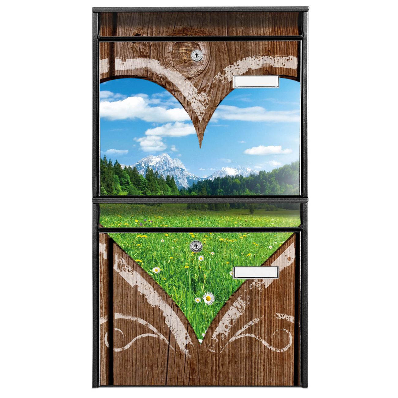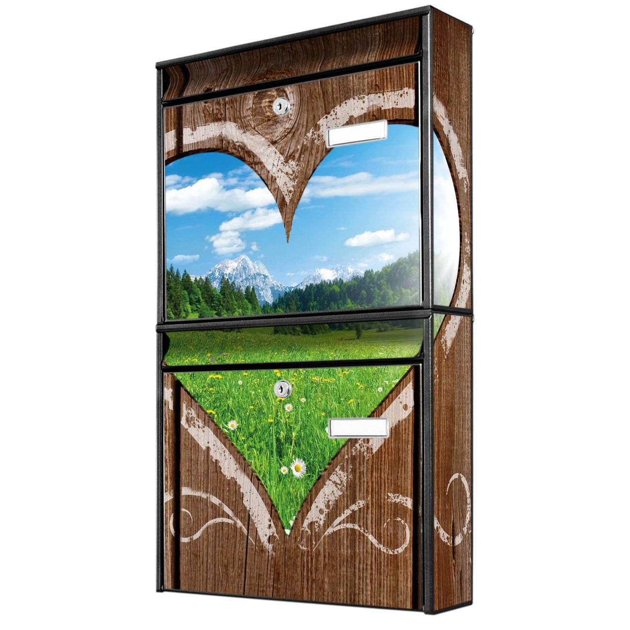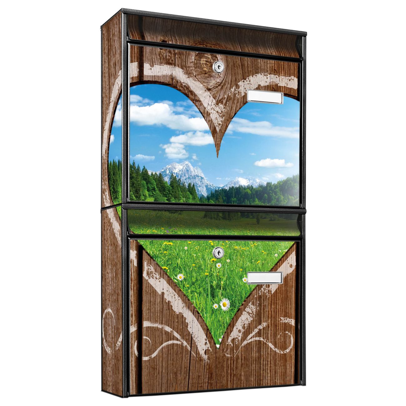 FUNKTION: Die Burg-Wächter Briefkastenanlage mit Motiv Ausblick mit Herz bietet Ihnen ausreichend Fassungsvermögen um auch A4 und C4 Sendungen zu empfangen. Das integrierte Namensschild lässt sich individuell beschriften. Wählen Sie aus den Grundfarben weiß, silber und schwarz. DESIGN: Die 2 Briefkästen haben ein ansprechendes und zeitloses Design, ohne dabei auf Funktionalität zu verzichten. Das Material ist sehr stabil, wetterfest und rostfrei. Durch das Motiv Ausblick mit Herz werden die Postkästen zu einem Blickfang. DETAILS: Die Postkästen bestehen aus verzinktem Stahl der zusätzlich mit Klarlack versiegelt wurde. Die Kästen sind gesamt 64,5cm hoch, 36,2cm breit und 10cm tief. Das Motiv besteht aus einer wetter- und UV-festen Folie, die Ihren Briefkasten zusätzlich vor Kratzern schützt. Die Postkästen werden mit Montagematerial, je einem Namensschild und je zwei Schlüsseln geliefert. NUTZEN: Das Briefkastenset eignet sich für die Wandmontage, die Größe bietet genügend Platz für Sendungen aller Art. Das zeitlose Design sowie die stabile Bauart bieten Ihnen einen treuen Begleiter für Ihre Post. BANJADO:
