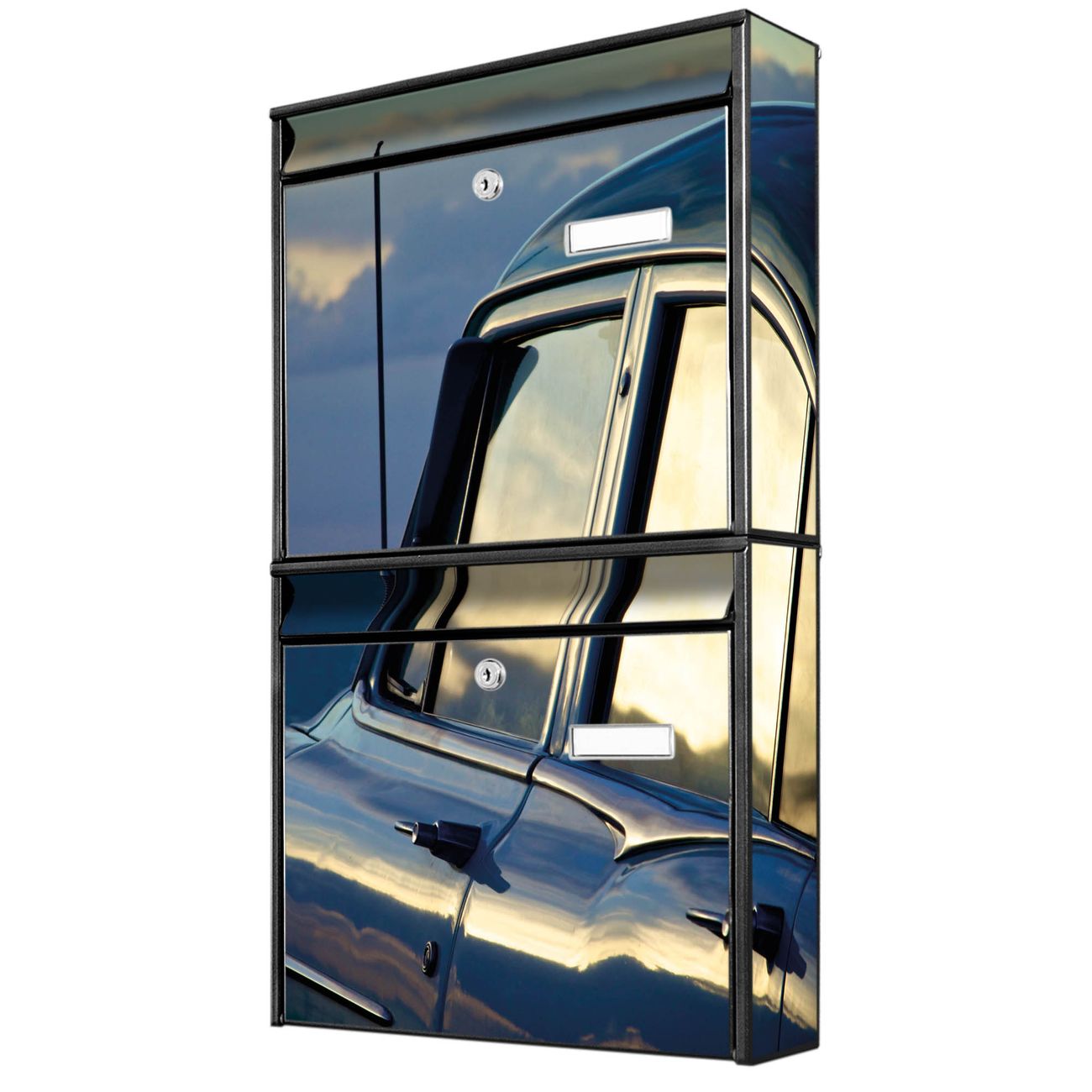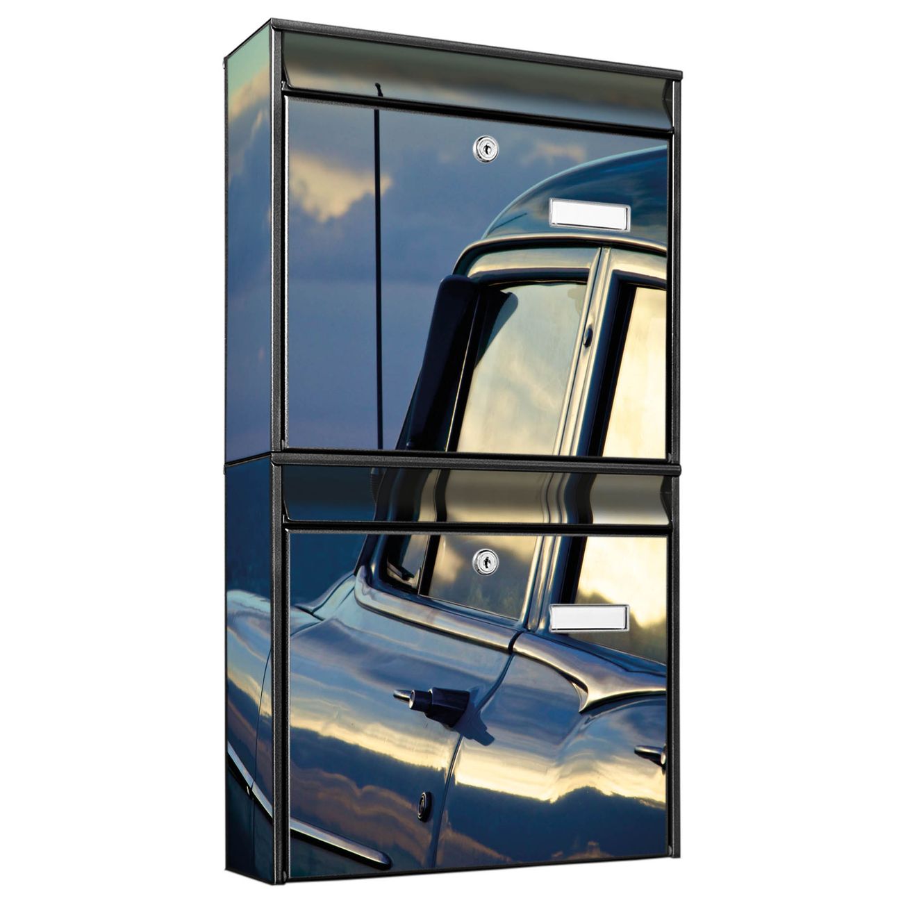 FUNKTION: Die Burg-Wächter Briefkastenanlage mit Motiv Auto am Strand bietet Ihnen ausreichend Fassungsvermögen um auch A4 und C4 Sendungen zu empfangen. Das integrierte Namensschild lässt sich individuell beschriften. Wählen Sie aus den Grundfarben weiß, silber und schwarz. DESIGN: Die 2 Briefkästen haben ein ansprechendes und zeitloses Design, ohne dabei auf Funktionalität zu verzichten. Das Material ist sehr stabil, wetterfest und rostfrei. Durch das Motiv Auto am Strand werden die Postkästen zu einem Blickfang. DETAILS: Die Postkästen bestehen aus verzinktem Stahl der zusätzlich mit Klarlack versiegelt wurde. Die Kästen sind gesamt 64,5cm hoch, 36,2cm breit und 10cm tief. Das Motiv besteht aus einer wetter- und UV-festen Folie, die Ihren Briefkasten zusätzlich vor Kratzern schützt. Die Postkästen werden mit Montagematerial, je einem Namensschild und je zwei Schlüsseln geliefert. NUTZEN: Das Briefkastenset eignet sich für die Wandmontage, die Größe bietet genügend Platz für Sendungen aller Art. Das zeitlose Design sowie die stabile Bauart bieten Ihnen einen treuen Begleiter für Ihre Post. BANJADO: