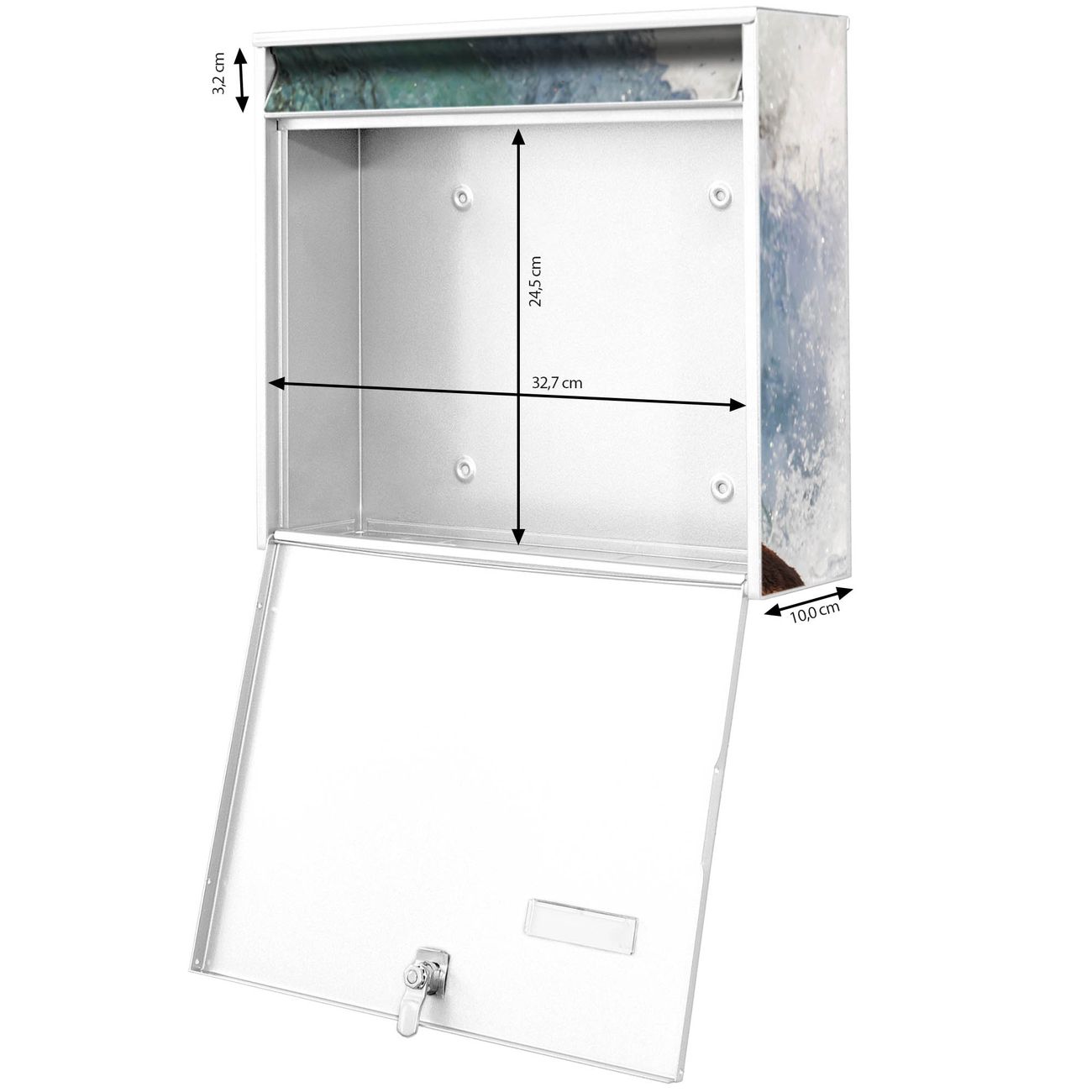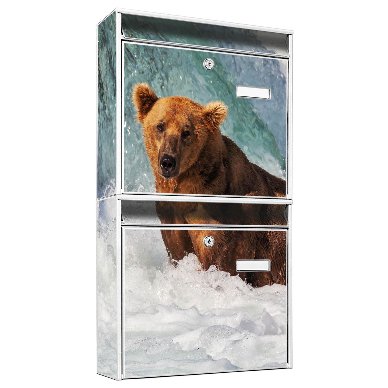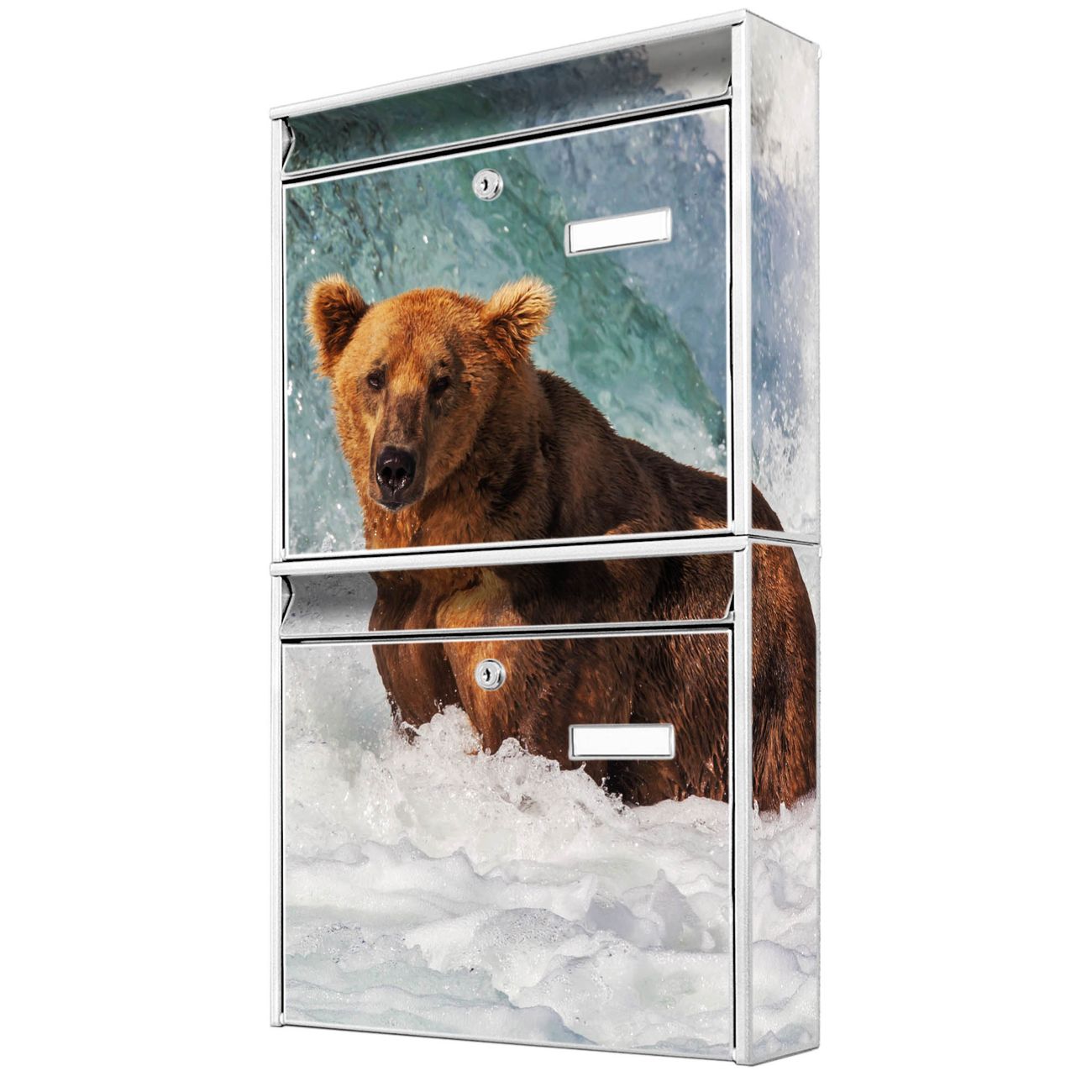 FUNKTION: Die Burg-Wächter Briefkastenanlage mit Motiv Bär Im Wasser bietet Ihnen ausreichend Fassungsvermögen um auch A4 und C4 Sendungen zu empfangen. Das integrierte Namensschild lässt sich individuell beschriften. Wählen Sie aus den Grundfarben weiß, silber und schwarz. DESIGN: Die 2 Briefkästen haben ein ansprechendes und zeitloses Design, ohne dabei auf Funktionalität zu verzichten. Das Material ist sehr stabil, wetterfest und rostfrei. Durch das Motiv Bär Im Wasser werden die Postkästen zu einem Blickfang. DETAILS: Die Postkästen bestehen aus verzinktem Stahl der zusätzlich mit Klarlack versiegelt wurde. Die Kästen sind gesamt 64,5cm hoch, 36,2cm breit und 10cm tief. Das Motiv besteht aus einer wetter- und UV-festen Folie, die Ihren Briefkasten zusätzlich vor Kratzern schützt. Die Postkästen werden mit Montagematerial, je einem Namensschild und je zwei Schlüsseln geliefert. NUTZEN: Das Briefkastenset eignet sich für die Wandmontage, die Größe bietet genügend Platz für Sendungen aller Art. Das zeitlose Design sowie die stabile Bauart bieten Ihnen einen treuen Begleiter für Ihre Post. BANJADO: