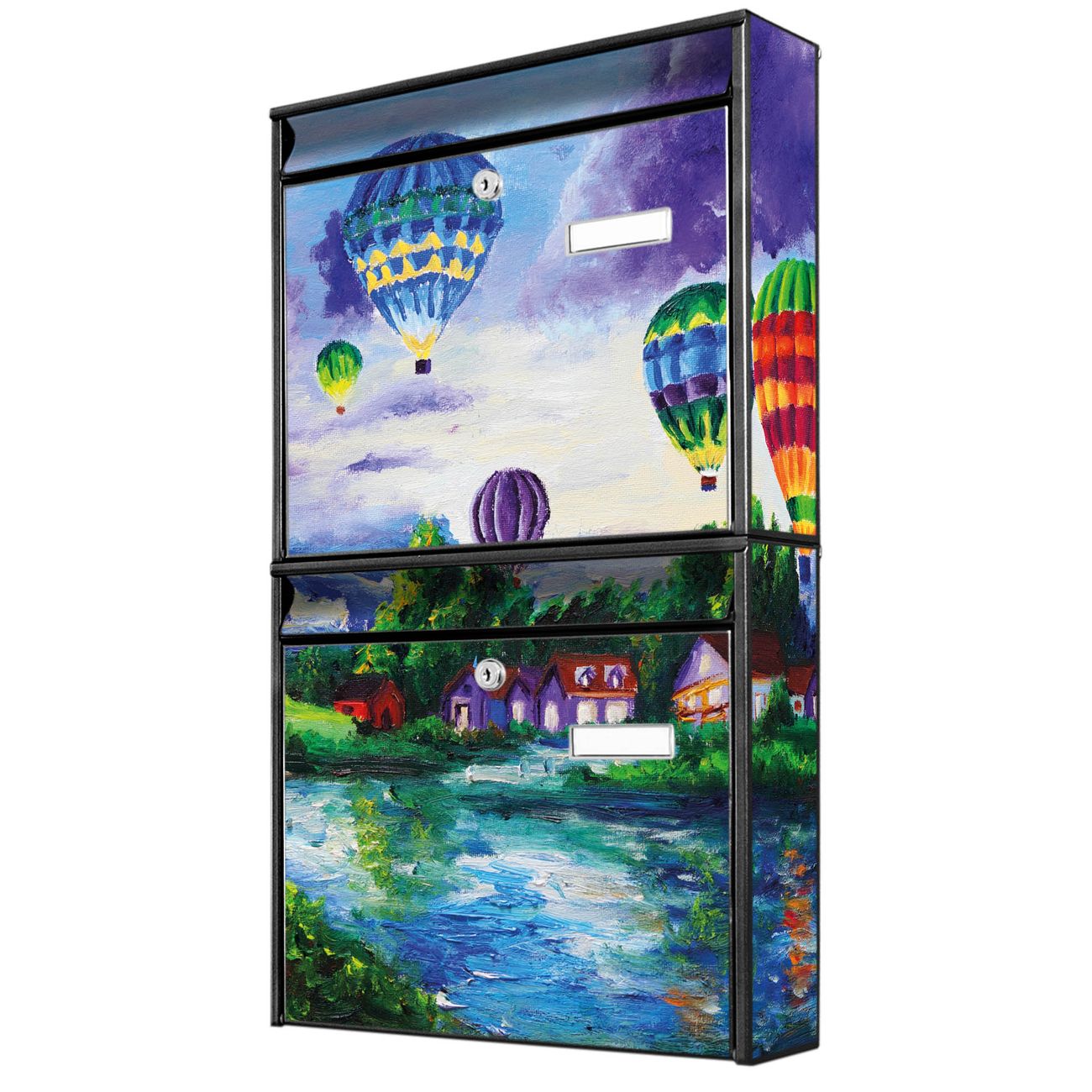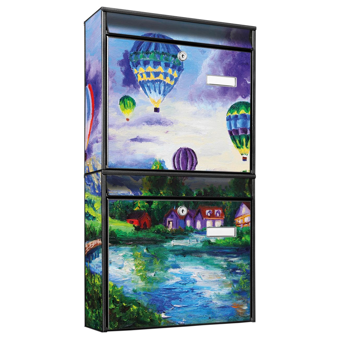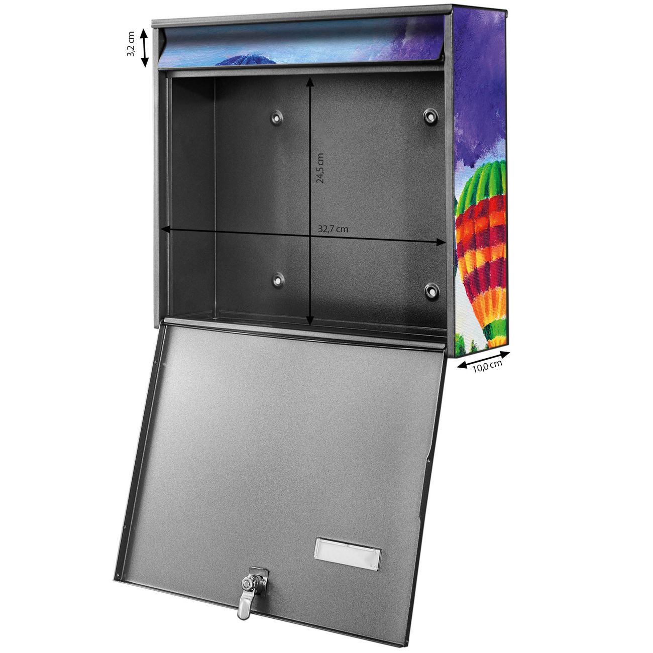 FUNKTION: Die Burg-Wächter Briefkastenanlage mit Motiv Ballons In Lila Wolken bietet Ihnen ausreichend Fassungsvermögen um auch A4 und C4 Sendungen zu empfangen. Das integrierte Namensschild lässt sich individuell beschriften. Wählen Sie aus den Grundfarben weiß, silber und schwarz. DESIGN: Die 2 Briefkästen haben ein ansprechendes und zeitloses Design, ohne dabei auf Funktionalität zu verzichten. Das Material ist sehr stabil, wetterfest und rostfrei. Durch das Motiv Ballons In Lila Wolken werden die Postkästen zu einem Blickfang. DETAILS: Die Postkästen bestehen aus verzinktem Stahl der zusätzlich mit Klarlack versiegelt wurde. Die Kästen sind gesamt 64,5cm hoch, 36,2cm breit und 10cm tief. Das Motiv besteht aus einer wetter- und UV-festen Folie, die Ihren Briefkasten zusätzlich vor Kratzern schützt. Die Postkästen werden mit Montagematerial, je einem Namensschild und je zwei Schlüsseln geliefert. NUTZEN: Das Briefkastenset eignet sich für die Wandmontage, die Größe bietet genügend Platz für Sendungen aller Art. Das zeitlose Design sowie die stabile Bauart bieten Ihnen einen treuen Begleiter für Ihre Post. BANJADO: