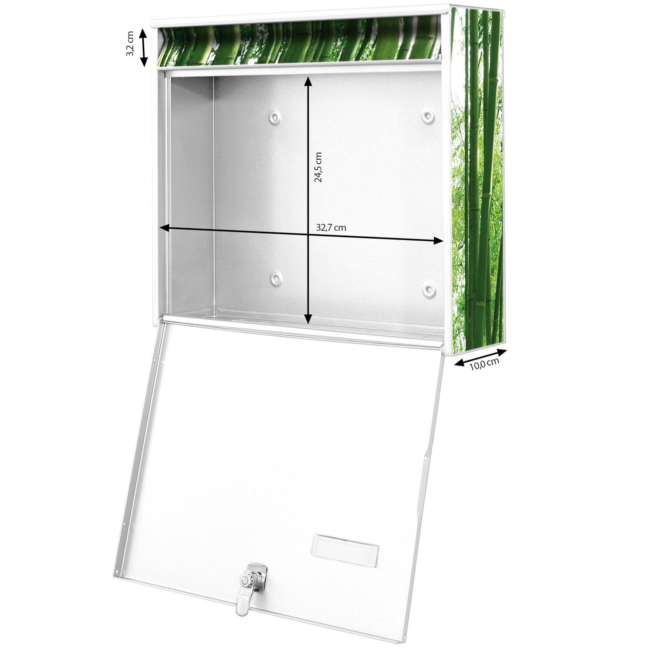 FUNKTION: Die Burg-Wächter Briefkastenanlage mit Motiv Bambus bietet Ihnen ausreichend Fassungsvermögen um auch A4 und C4 Sendungen zu empfangen. Das integrierte Namensschild lässt sich individuell beschriften. Wählen Sie aus den Grundfarben weiß, silber und schwarz. DESIGN: Die 2 Briefkästen haben ein ansprechendes und zeitloses Design, ohne dabei auf Funktionalität zu verzichten. Das Material ist sehr stabil, wetterfest und rostfrei. Durch das Motiv Bambus werden die Postkästen zu einem Blickfang. DETAILS: Die Postkästen bestehen aus verzinktem Stahl der zusätzlich mit Klarlack versiegelt wurde. Die Kästen sind gesamt 64,5cm hoch, 36,2cm breit und 10cm tief. Das Motiv besteht aus einer wetter- und UV-festen Folie, die Ihren Briefkasten zusätzlich vor Kratzern schützt. Die Postkästen werden mit Montagematerial, je einem Namensschild und je zwei Schlüsseln geliefert. NUTZEN: Das Briefkastenset eignet sich für die Wandmontage, die Größe bietet genügend Platz für Sendungen aller Art. Das zeitlose Design sowie die stabile Bauart bieten Ihnen einen treuen Begleiter für Ihre Post. BANJADO:
