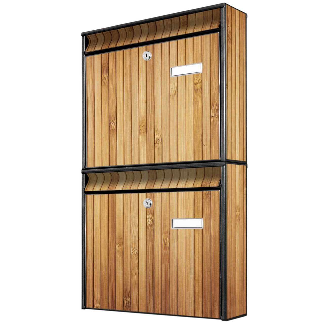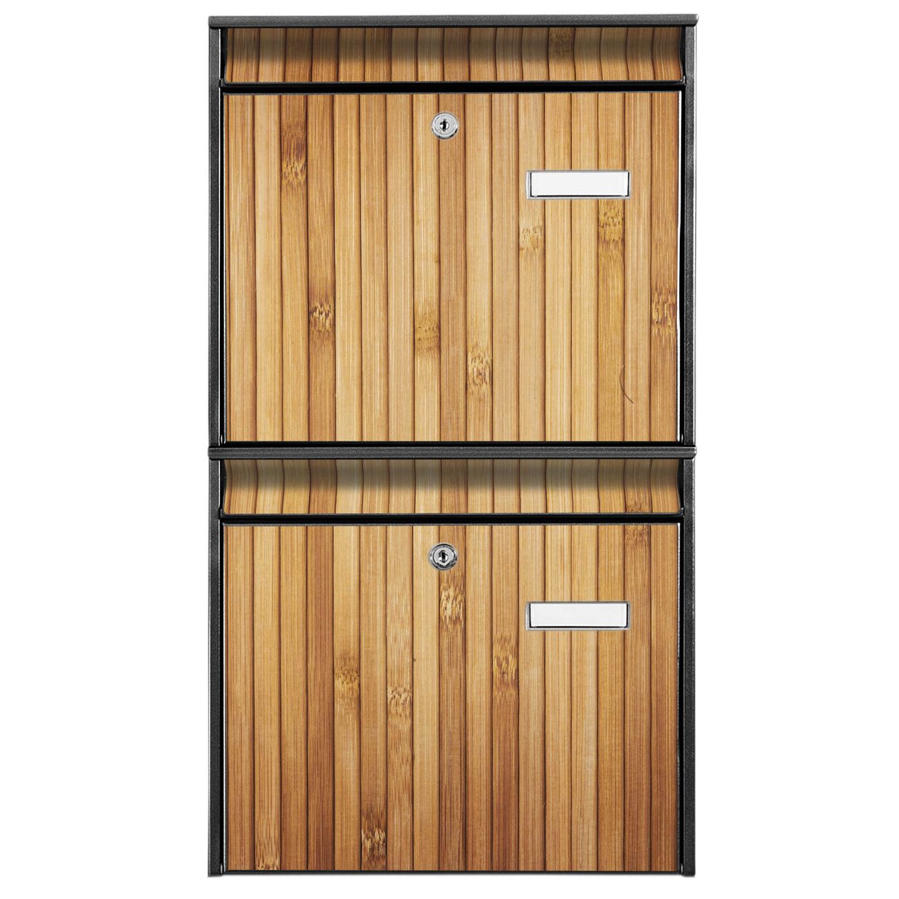FUNKTION: Die Burg-Wächter Briefkastenanlage mit Motiv Bambusholz bietet Ihnen ausreichend Fassungsvermögen um auch A4 und C4 Sendungen zu empfangen. Das integrierte Namensschild lässt sich individuell beschriften. Wählen Sie aus den Grundfarben weiß, silber und schwarz. DESIGN: Die 2 Briefkästen haben ein ansprechendes und zeitloses Design, ohne dabei auf Funktionalität zu verzichten. Das Material ist sehr stabil, wetterfest und rostfrei. Durch das Motiv Bambusholz werden die Postkästen zu einem Blickfang. DETAILS: Die Postkästen bestehen aus verzinktem Stahl der zusätzlich mit Klarlack versiegelt wurde. Die Kästen sind gesamt 64,5cm hoch, 36,2cm breit und 10cm tief. Das Motiv besteht aus einer wetter- und UV-festen Folie, die Ihren Briefkasten zusätzlich vor Kratzern schützt. Die Postkästen werden mit Montagematerial, je einem Namensschild und je zwei Schlüsseln geliefert. NUTZEN: Das Briefkastenset eignet sich für die Wandmontage, die Größe bietet genügend Platz für Sendungen aller Art. Das zeitlose Design sowie die stabile Bauart bieten Ihnen einen treuen Begleiter für Ihre Post. BANJADO: