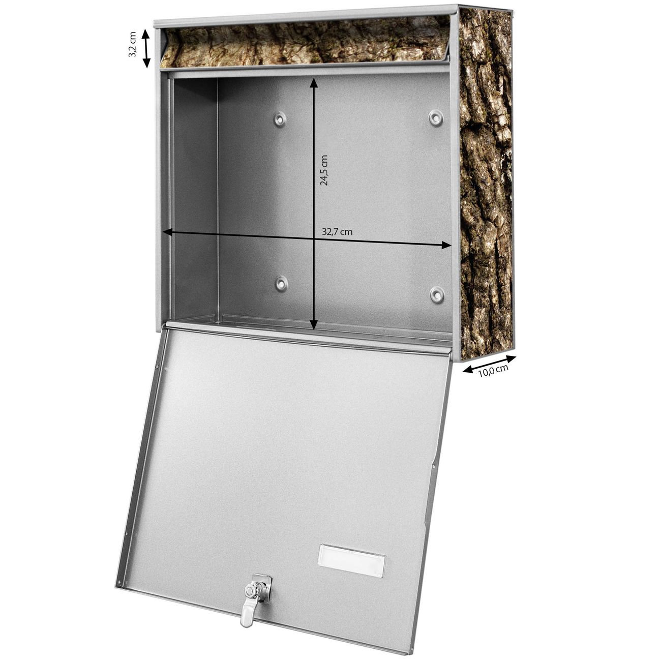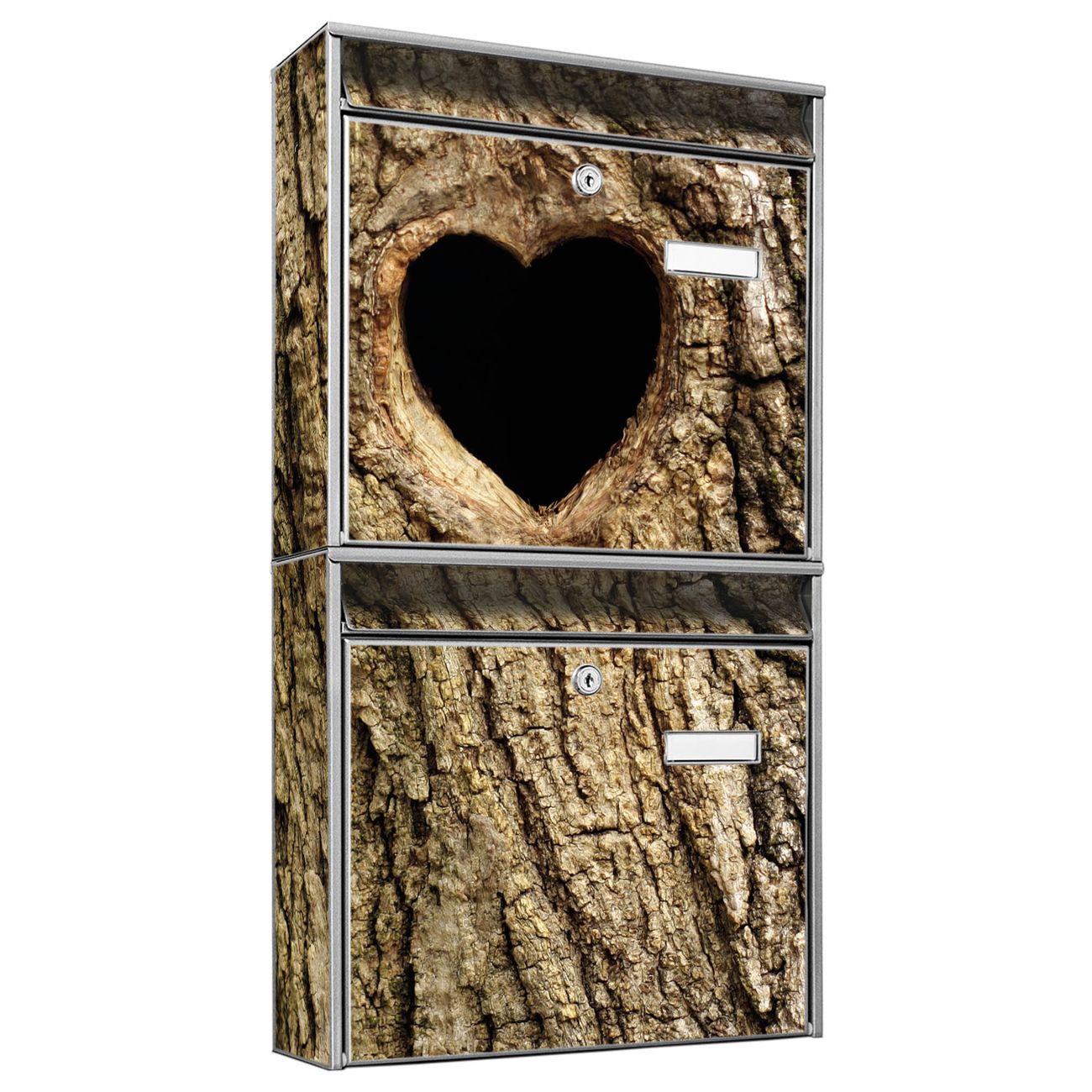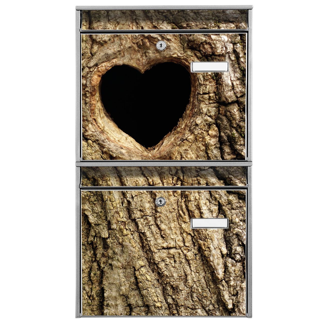 FUNKTION: Die Burg-Wächter Briefkastenanlage mit Motiv Baumherz bietet Ihnen ausreichend Fassungsvermögen um auch A4 und C4 Sendungen zu empfangen. Das integrierte Namensschild lässt sich individuell beschriften. Wählen Sie aus den Grundfarben weiß, silber und schwarz. DESIGN: Die 2 Briefkästen haben ein ansprechendes und zeitloses Design, ohne dabei auf Funktionalität zu verzichten. Das Material ist sehr stabil, wetterfest und rostfrei. Durch das Motiv Baumherz werden die Postkästen zu einem Blickfang. DETAILS: Die Postkästen bestehen aus verzinktem Stahl der zusätzlich mit Klarlack versiegelt wurde. Die Kästen sind gesamt 64,5cm hoch, 36,2cm breit und 10cm tief. Das Motiv besteht aus einer wetter- und UV-festen Folie, die Ihren Briefkasten zusätzlich vor Kratzern schützt. Die Postkästen werden mit Montagematerial, je einem Namensschild und je zwei Schlüsseln geliefert. NUTZEN: Das Briefkastenset eignet sich für die Wandmontage, die Größe bietet genügend Platz für Sendungen aller Art. Das zeitlose Design sowie die stabile Bauart bieten Ihnen einen treuen Begleiter für Ihre Post. BANJADO: