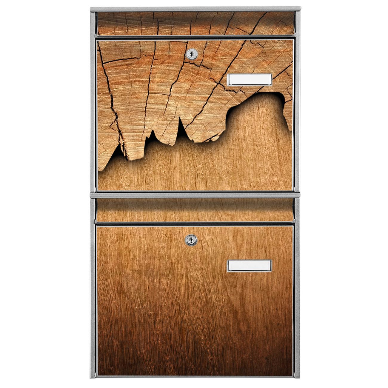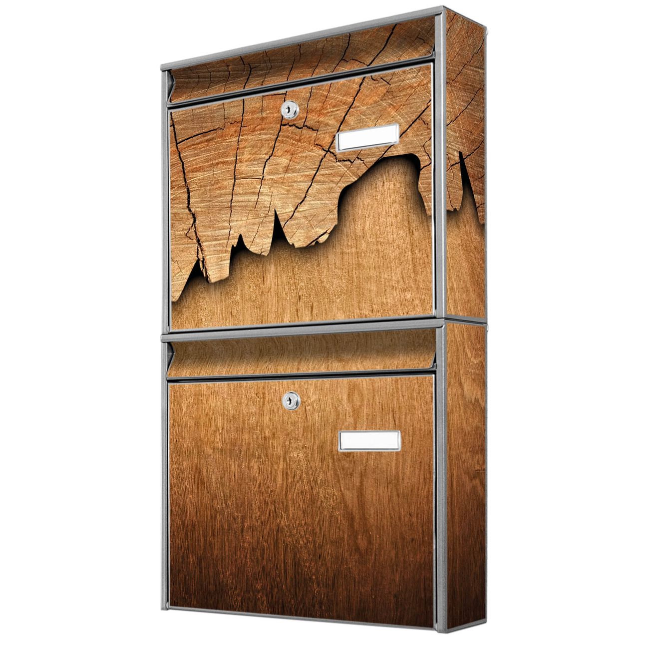 FUNKTION: Die Burg-Wächter Briefkastenanlage mit Motiv Baumscheibe bietet Ihnen ausreichend Fassungsvermögen um auch A4 und C4 Sendungen zu empfangen. Das integrierte Namensschild lässt sich individuell beschriften. Wählen Sie aus den Grundfarben weiß, silber und schwarz. DESIGN: Die 2 Briefkästen haben ein ansprechendes und zeitloses Design, ohne dabei auf Funktionalität zu verzichten. Das Material ist sehr stabil, wetterfest und rostfrei. Durch das Motiv Baumscheibe werden die Postkästen zu einem Blickfang. DETAILS: Die Postkästen bestehen aus verzinktem Stahl der zusätzlich mit Klarlack versiegelt wurde. Die Kästen sind gesamt 64,5cm hoch, 36,2cm breit und 10cm tief. Das Motiv besteht aus einer wetter- und UV-festen Folie, die Ihren Briefkasten zusätzlich vor Kratzern schützt. Die Postkästen werden mit Montagematerial, je einem Namensschild und je zwei Schlüsseln geliefert. NUTZEN: Das Briefkastenset eignet sich für die Wandmontage, die Größe bietet genügend Platz für Sendungen aller Art. Das zeitlose Design sowie die stabile Bauart bieten Ihnen einen treuen Begleiter für Ihre Post. BANJADO: