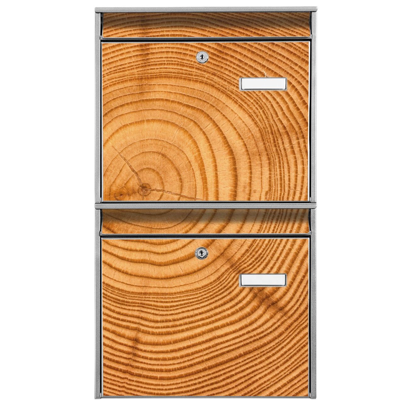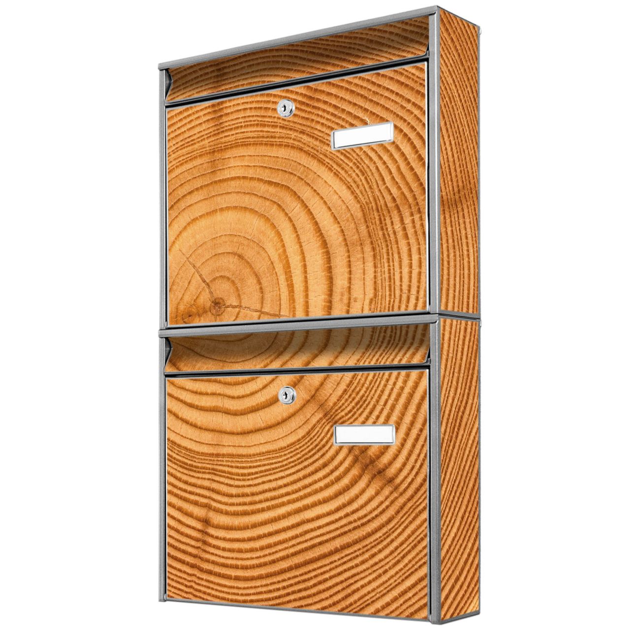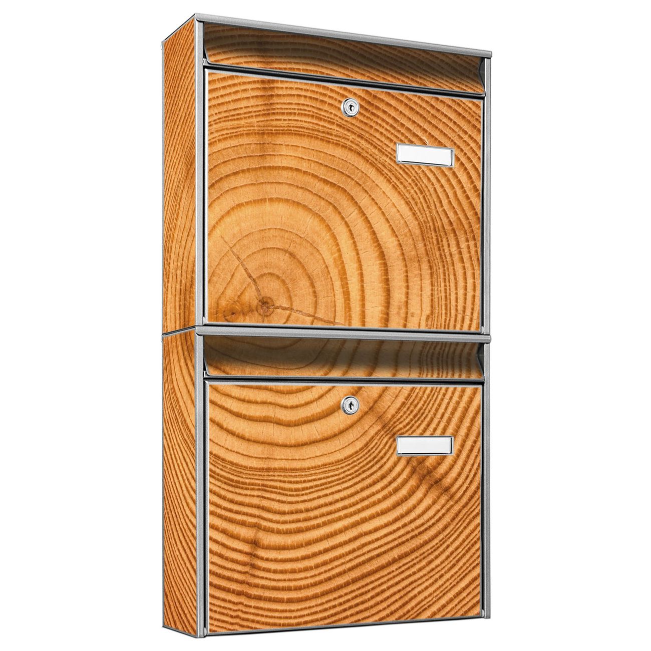 FUNKTION: Die Burg-Wächter Briefkastenanlage mit Motiv Baumstamm bietet Ihnen ausreichend Fassungsvermögen um auch A4 und C4 Sendungen zu empfangen. Das integrierte Namensschild lässt sich individuell beschriften. Wählen Sie aus den Grundfarben weiß, silber und schwarz. DESIGN: Die 2 Briefkästen haben ein ansprechendes und zeitloses Design, ohne dabei auf Funktionalität zu verzichten. Das Material ist sehr stabil, wetterfest und rostfrei. Durch das Motiv Baumstamm werden die Postkästen zu einem Blickfang. DETAILS: Die Postkästen bestehen aus verzinktem Stahl der zusätzlich mit Klarlack versiegelt wurde. Die Kästen sind gesamt 64,5cm hoch, 36,2cm breit und 10cm tief. Das Motiv besteht aus einer wetter- und UV-festen Folie, die Ihren Briefkasten zusätzlich vor Kratzern schützt. Die Postkästen werden mit Montagematerial, je einem Namensschild und je zwei Schlüsseln geliefert. NUTZEN: Das Briefkastenset eignet sich für die Wandmontage, die Größe bietet genügend Platz für Sendungen aller Art. Das zeitlose Design sowie die stabile Bauart bieten Ihnen einen treuen Begleiter für Ihre Post. BANJADO: