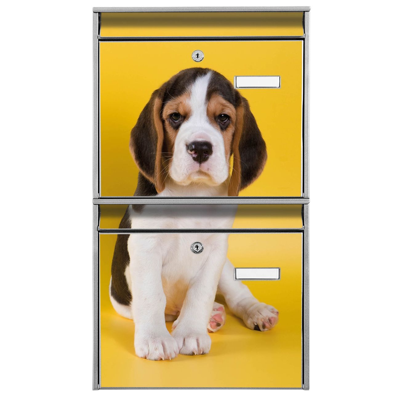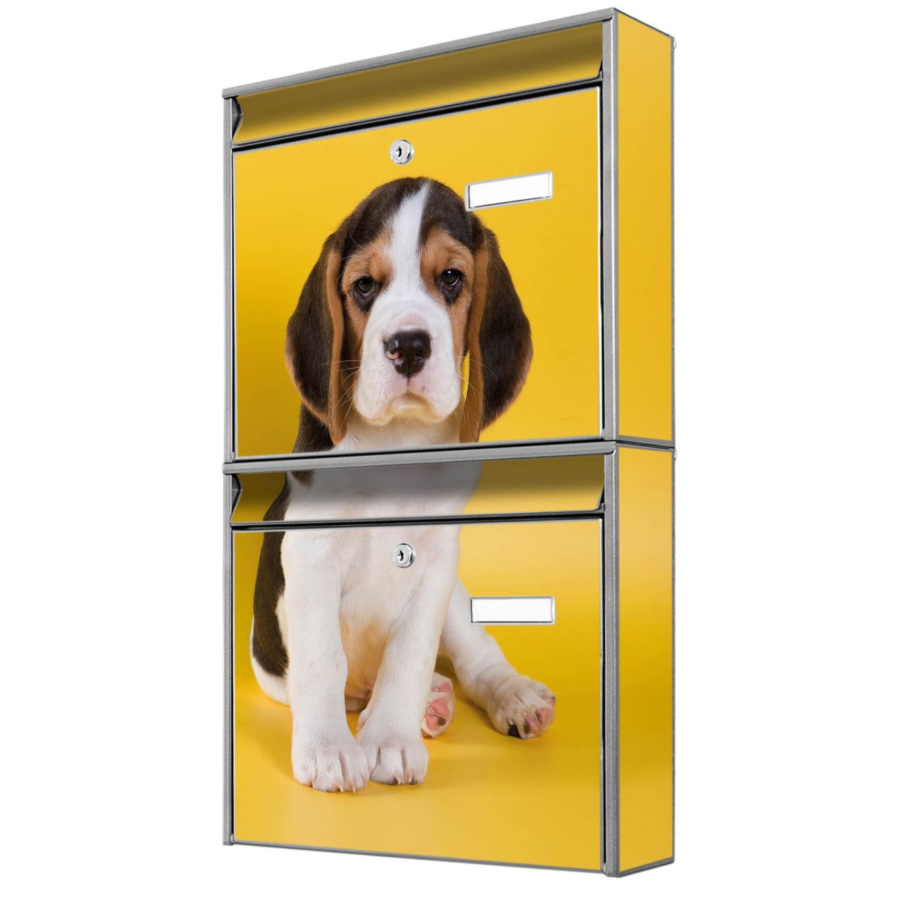 FUNKTION: Die Burg-Wächter Briefkastenanlage mit Motiv Beagle bietet Ihnen ausreichend Fassungsvermögen um auch A4 und C4 Sendungen zu empfangen. Das integrierte Namensschild lässt sich individuell beschriften. Wählen Sie aus den Grundfarben weiß, silber und schwarz. DESIGN: Die 2 Briefkästen haben ein ansprechendes und zeitloses Design, ohne dabei auf Funktionalität zu verzichten. Das Material ist sehr stabil, wetterfest und rostfrei. Durch das Motiv Beagle werden die Postkästen zu einem Blickfang. DETAILS: Die Postkästen bestehen aus verzinktem Stahl der zusätzlich mit Klarlack versiegelt wurde. Die Kästen sind gesamt 64,5cm hoch, 36,2cm breit und 10cm tief. Das Motiv besteht aus einer wetter- und UV-festen Folie, die Ihren Briefkasten zusätzlich vor Kratzern schützt. Die Postkästen werden mit Montagematerial, je einem Namensschild und je zwei Schlüsseln geliefert. NUTZEN: Das Briefkastenset eignet sich für die Wandmontage, die Größe bietet genügend Platz für Sendungen aller Art. Das zeitlose Design sowie die stabile Bauart bieten Ihnen einen treuen Begleiter für Ihre Post. BANJADO: