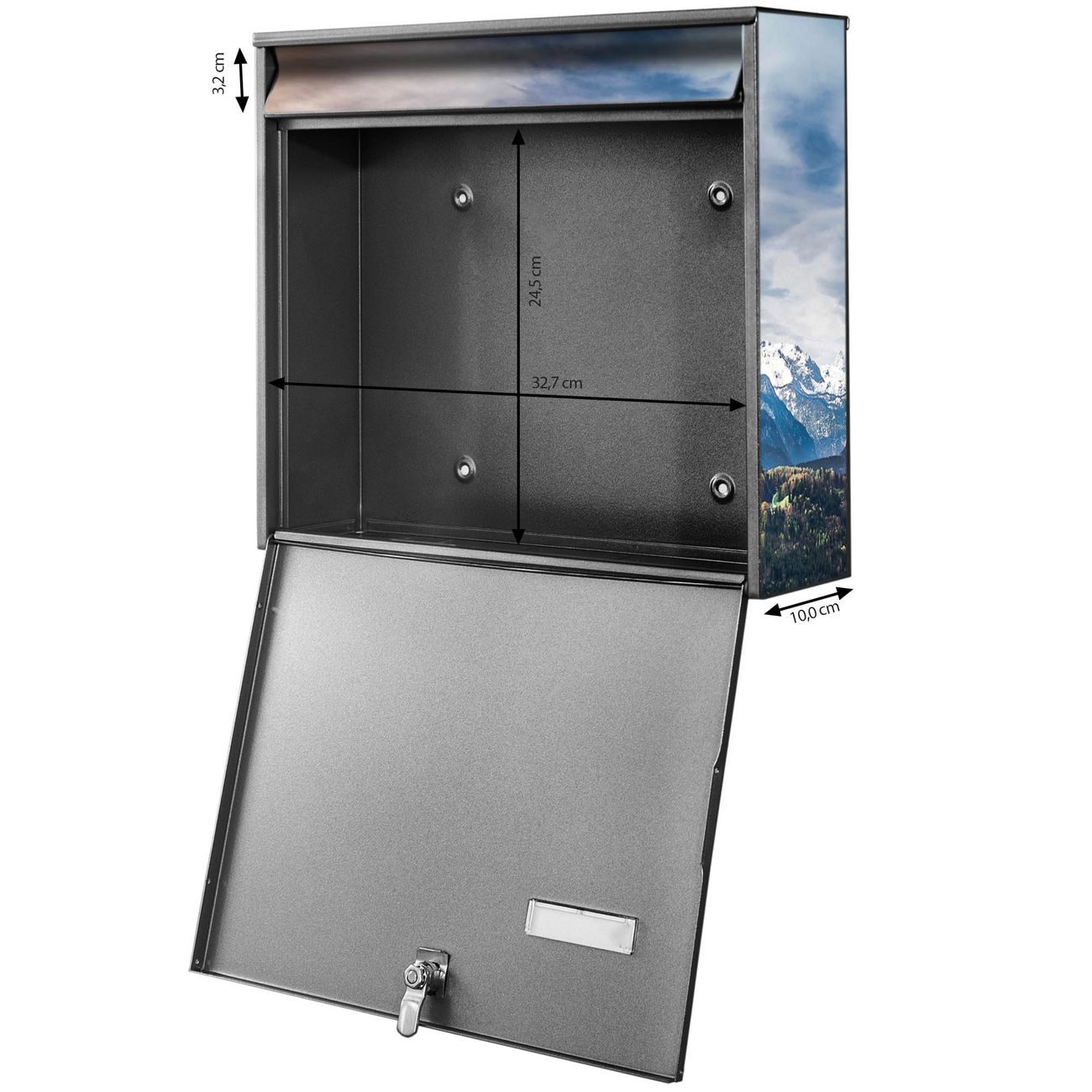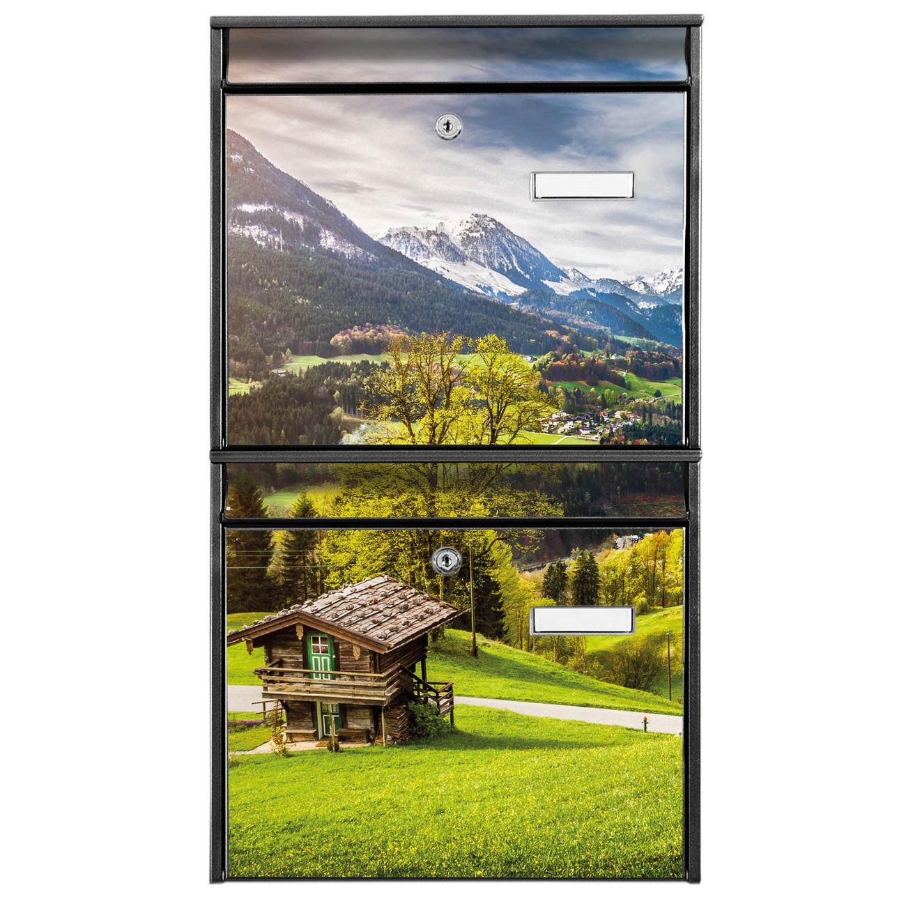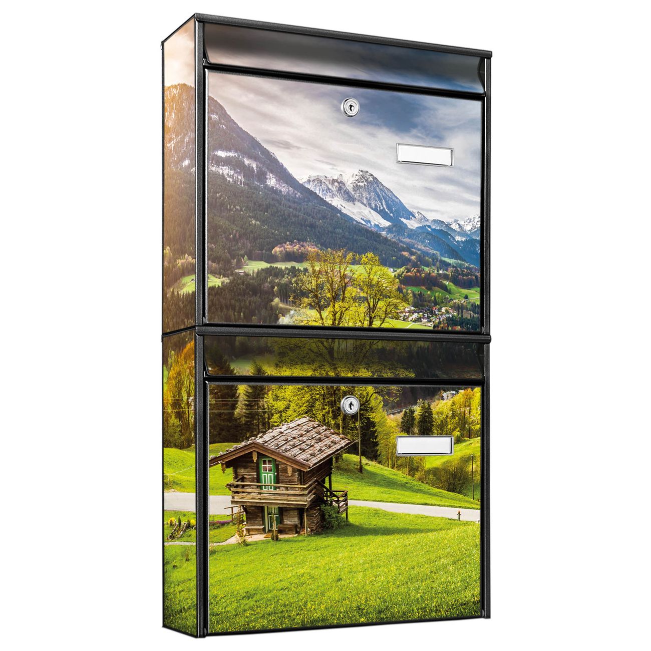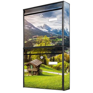 FUNKTION: Die Burg-Wächter Briefkastenanlage mit Motiv Berchtesgadener Land bietet Ihnen ausreichend Fassungsvermögen um auch A4 und C4 Sendungen zu empfangen. Das integrierte Namensschild lässt sich individuell beschriften. Wählen Sie aus den Grundfarben weiß, silber und schwarz. DESIGN: Die 2 Briefkästen haben ein ansprechendes und zeitloses Design, ohne dabei auf Funktionalität zu verzichten. Das Material ist sehr stabil, wetterfest und rostfrei. Durch das Motiv Berchtesgadener Land werden die Postkästen zu einem Blickfang. DETAILS: Die Postkästen bestehen aus verzinktem Stahl der zusätzlich mit Klarlack versiegelt wurde. Die Kästen sind gesamt 64,5cm hoch, 36,2cm breit und 10cm tief. Das Motiv besteht aus einer wetter- und UV-festen Folie, die Ihren Briefkasten zusätzlich vor Kratzern schützt. Die Postkästen werden mit Montagematerial, je einem Namensschild und je zwei Schlüsseln geliefert. NUTZEN: Das Briefkastenset eignet sich für die Wandmontage, die Größe bietet genügend Platz für Sendungen aller Art. Das zeitlose Design sowie die stabile Bauart bieten Ihnen einen treuen Begleiter für Ihre Post. BANJADO: