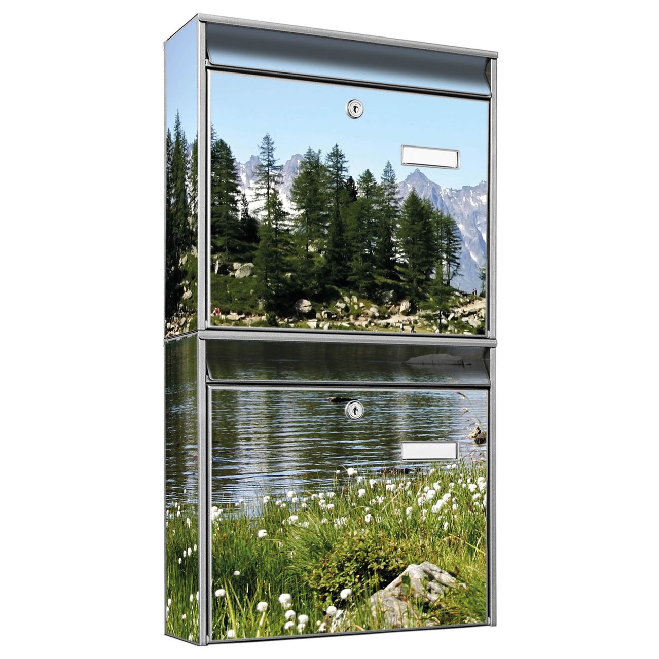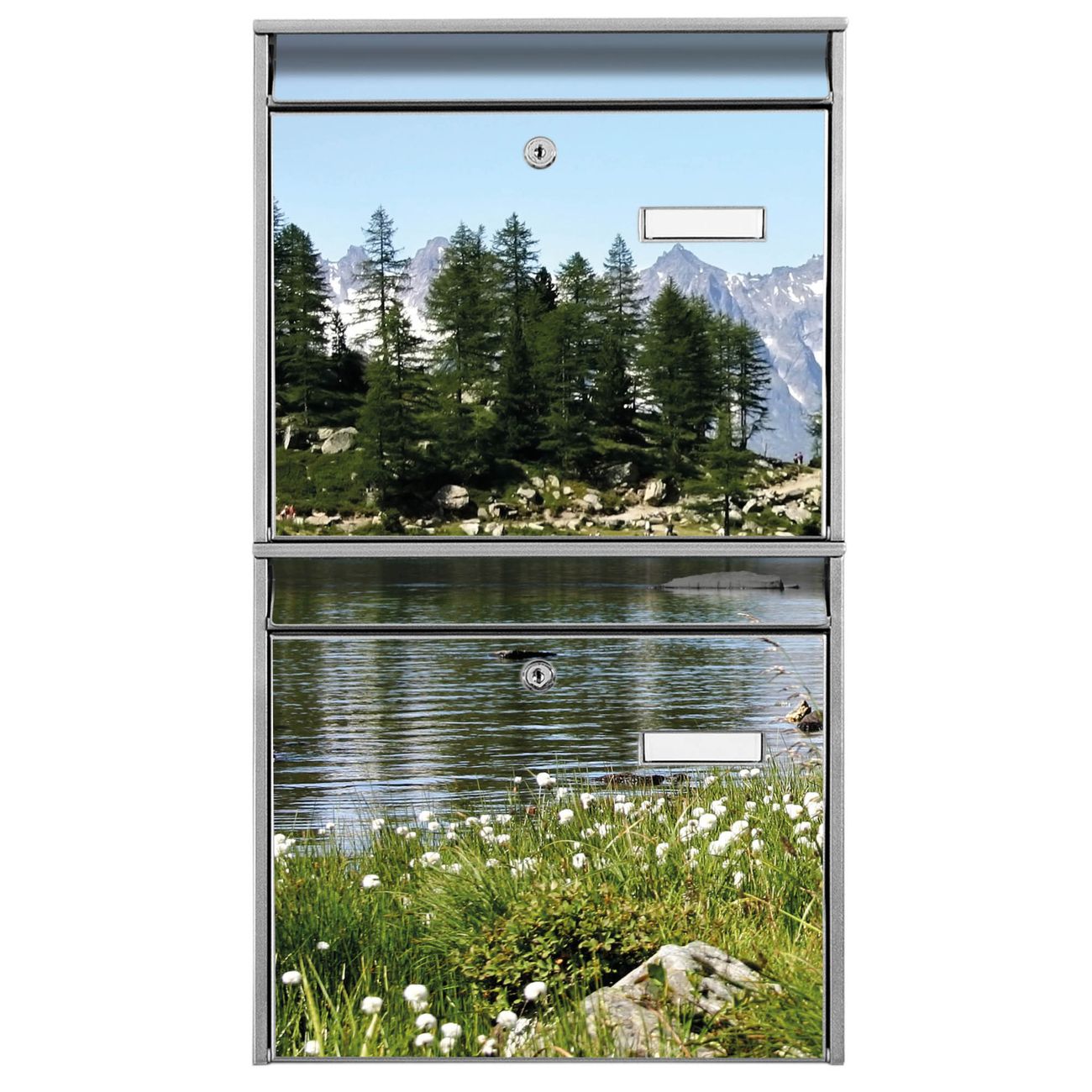 FUNKTION: Die Burg-Wächter Briefkastenanlage mit Motiv Bergidylle bietet Ihnen ausreichend Fassungsvermögen um auch A4 und C4 Sendungen zu empfangen. Das integrierte Namensschild lässt sich individuell beschriften. Wählen Sie aus den Grundfarben weiß, silber und schwarz. DESIGN: Die 2 Briefkästen haben ein ansprechendes und zeitloses Design, ohne dabei auf Funktionalität zu verzichten. Das Material ist sehr stabil, wetterfest und rostfrei. Durch das Motiv Bergidylle werden die Postkästen zu einem Blickfang. DETAILS: Die Postkästen bestehen aus verzinktem Stahl der zusätzlich mit Klarlack versiegelt wurde. Die Kästen sind gesamt 64,5cm hoch, 36,2cm breit und 10cm tief. Das Motiv besteht aus einer wetter- und UV-festen Folie, die Ihren Briefkasten zusätzlich vor Kratzern schützt. Die Postkästen werden mit Montagematerial, je einem Namensschild und je zwei Schlüsseln geliefert. NUTZEN: Das Briefkastenset eignet sich für die Wandmontage, die Größe bietet genügend Platz für Sendungen aller Art. Das zeitlose Design sowie die stabile Bauart bieten Ihnen einen treuen Begleiter für Ihre Post. BANJADO: