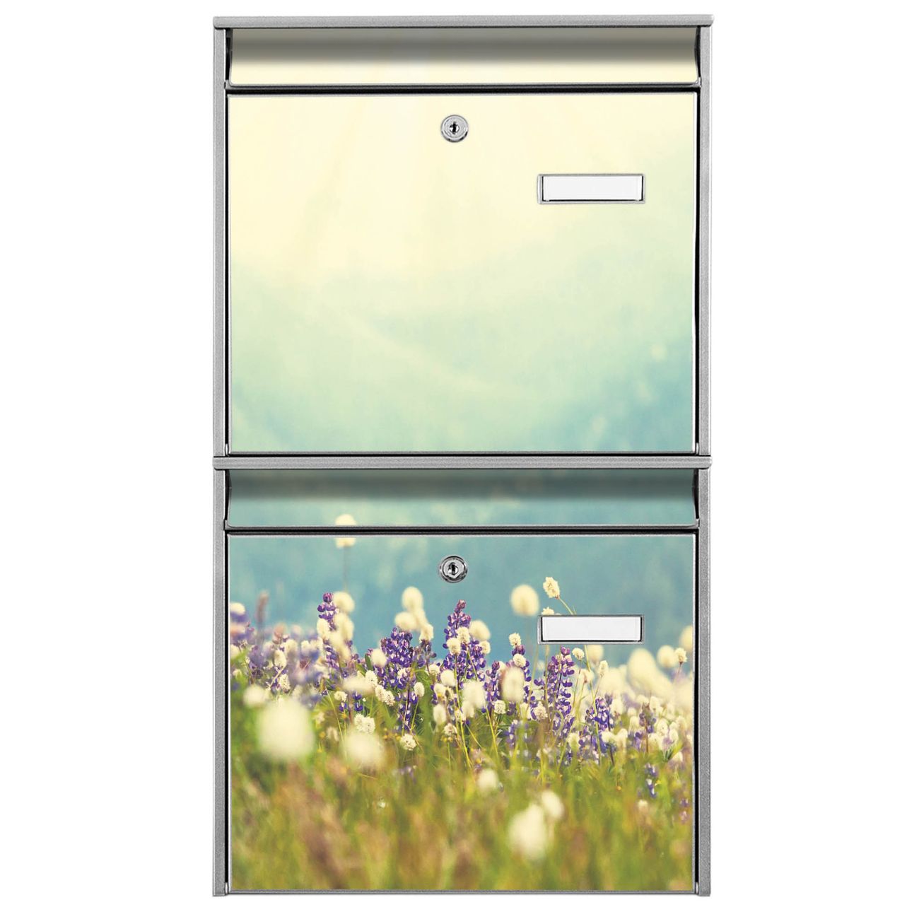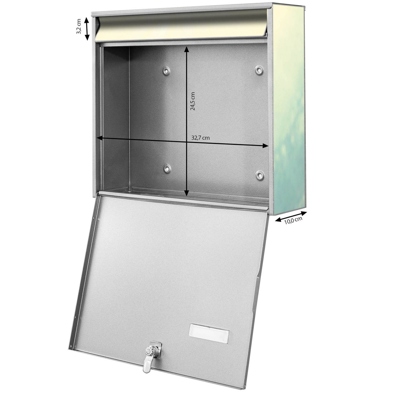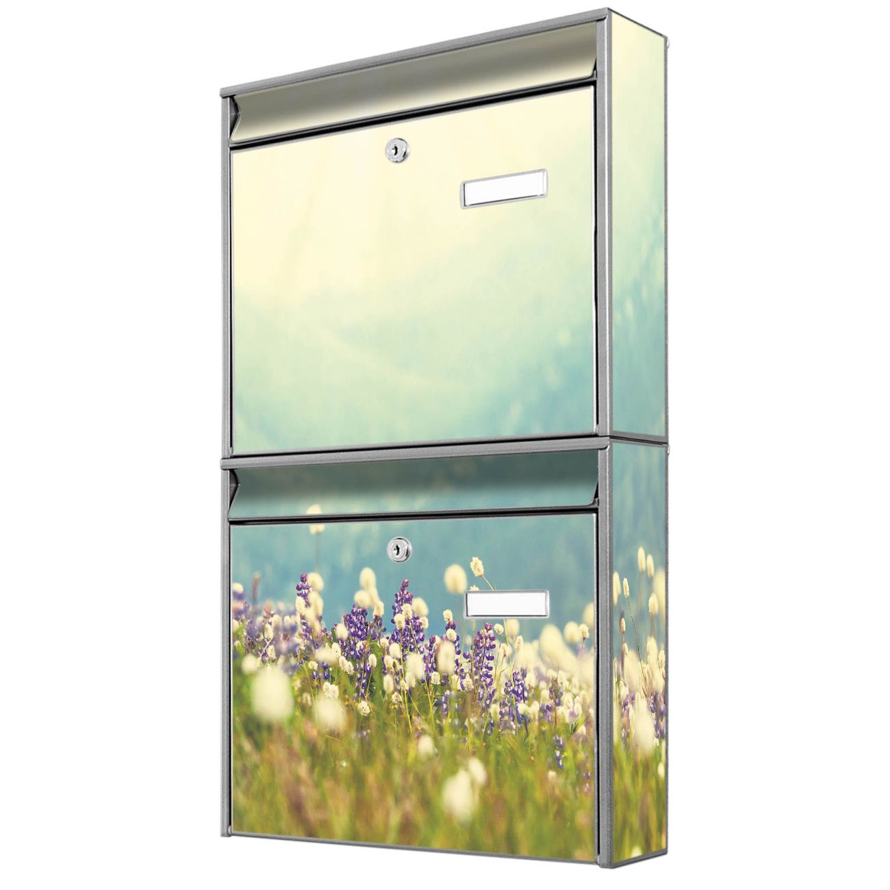 FUNKTION: Die Burg-Wächter Briefkastenanlage mit Motiv Bergwiese bietet Ihnen ausreichend Fassungsvermögen um auch A4 und C4 Sendungen zu empfangen. Das integrierte Namensschild lässt sich individuell beschriften. Wählen Sie aus den Grundfarben weiß, silber und schwarz. DESIGN: Die 2 Briefkästen haben ein ansprechendes und zeitloses Design, ohne dabei auf Funktionalität zu verzichten. Das Material ist sehr stabil, wetterfest und rostfrei. Durch das Motiv Bergwiese werden die Postkästen zu einem Blickfang. DETAILS: Die Postkästen bestehen aus verzinktem Stahl der zusätzlich mit Klarlack versiegelt wurde. Die Kästen sind gesamt 64,5cm hoch, 36,2cm breit und 10cm tief. Das Motiv besteht aus einer wetter- und UV-festen Folie, die Ihren Briefkasten zusätzlich vor Kratzern schützt. Die Postkästen werden mit Montagematerial, je einem Namensschild und je zwei Schlüsseln geliefert. NUTZEN: Das Briefkastenset eignet sich für die Wandmontage, die Größe bietet genügend Platz für Sendungen aller Art. Das zeitlose Design sowie die stabile Bauart bieten Ihnen einen treuen Begleiter für Ihre Post. BANJADO: