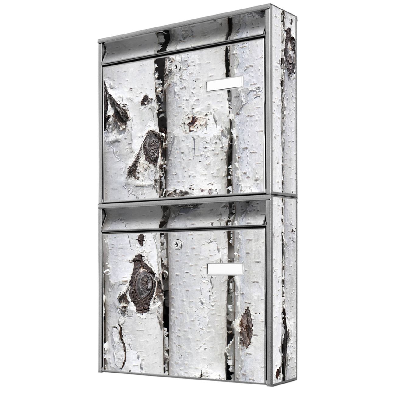 FUNKTION: Die Burg-Wächter Briefkastenanlage mit Motiv Birkenrinde bietet Ihnen ausreichend Fassungsvermögen um auch A4 und C4 Sendungen zu empfangen. Das integrierte Namensschild lässt sich individuell beschriften. Wählen Sie aus den Grundfarben weiß, silber und schwarz. DESIGN: Die 2 Briefkästen haben ein ansprechendes und zeitloses Design, ohne dabei auf Funktionalität zu verzichten. Das Material ist sehr stabil, wetterfest und rostfrei. Durch das Motiv Birkenrinde werden die Postkästen zu einem Blickfang. DETAILS: Die Postkästen bestehen aus verzinktem Stahl der zusätzlich mit Klarlack versiegelt wurde. Die Kästen sind gesamt 64,5cm hoch, 36,2cm breit und 10cm tief. Das Motiv besteht aus einer wetter- und UV-festen Folie, die Ihren Briefkasten zusätzlich vor Kratzern schützt. Die Postkästen werden mit Montagematerial, je einem Namensschild und je zwei Schlüsseln geliefert. NUTZEN: Das Briefkastenset eignet sich für die Wandmontage, die Größe bietet genügend Platz für Sendungen aller Art. Das zeitlose Design sowie die stabile Bauart bieten Ihnen einen treuen Begleiter für Ihre Post. BANJADO: