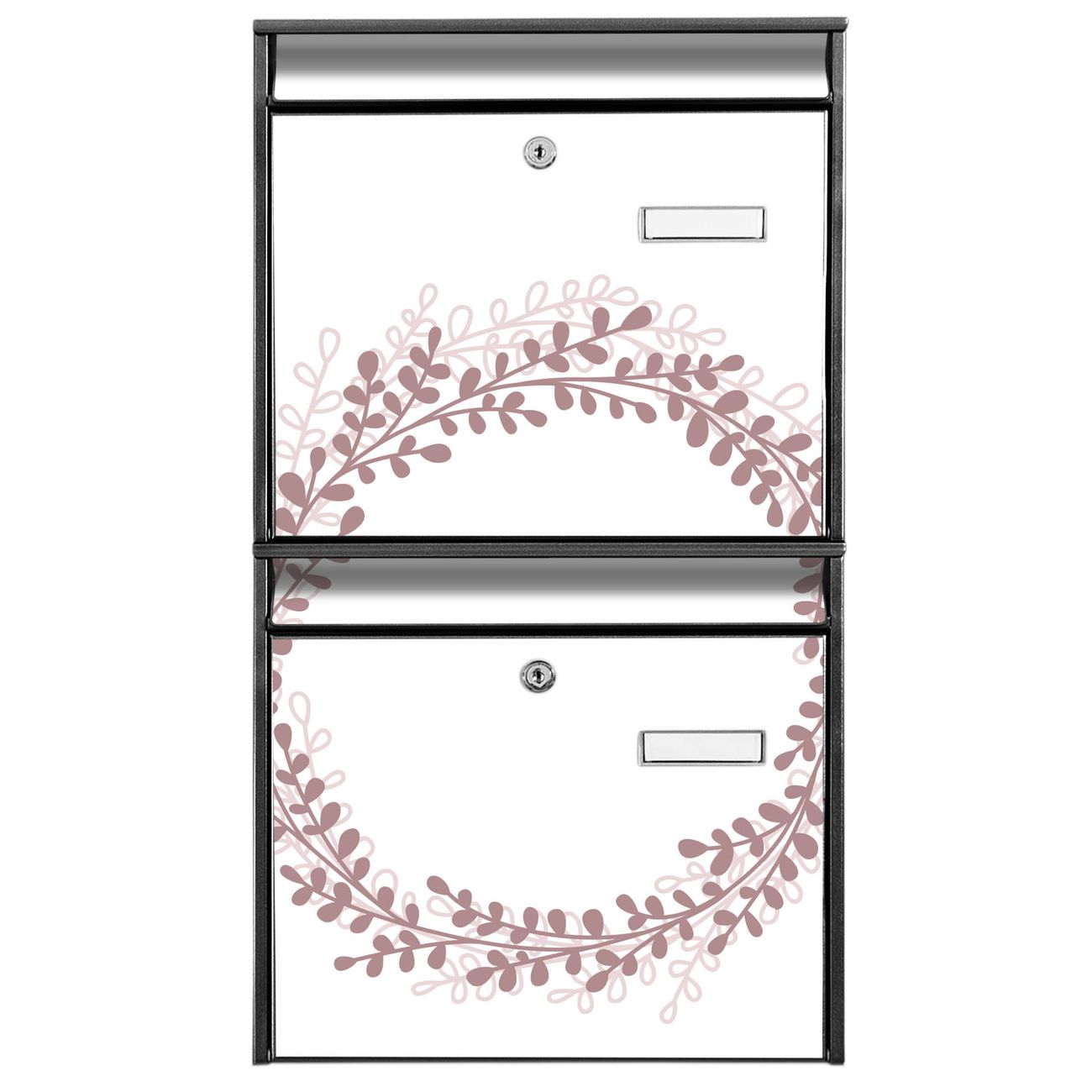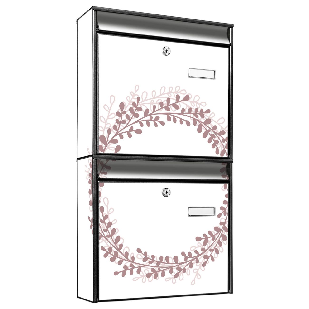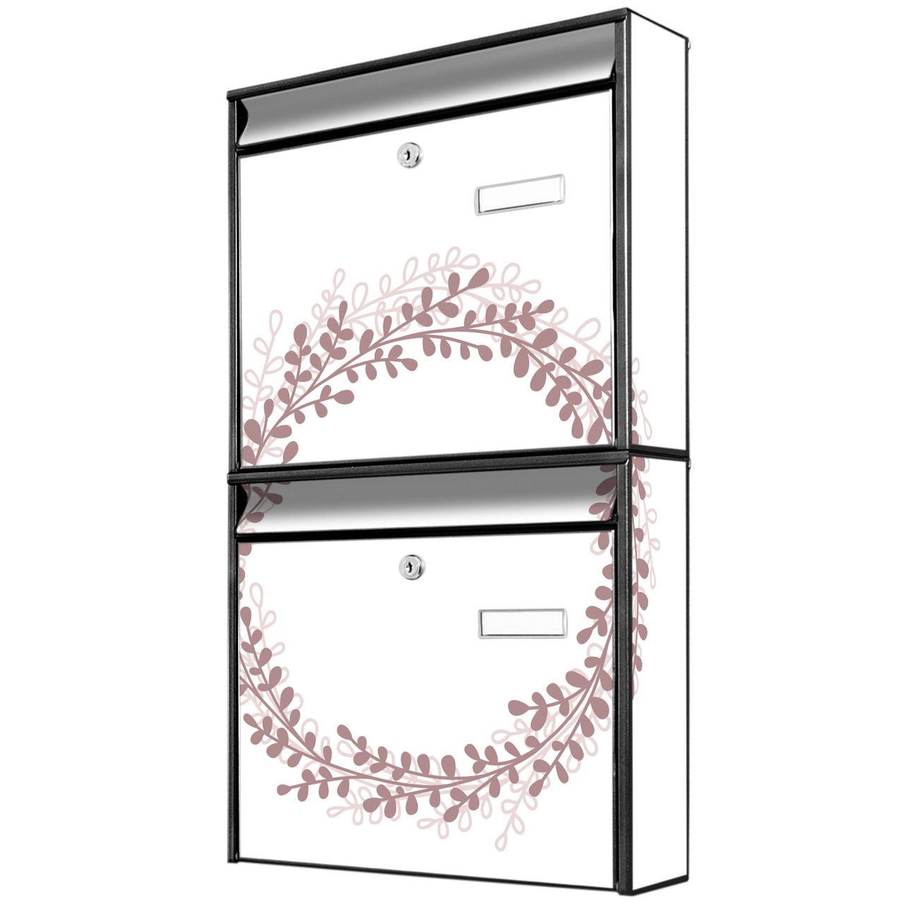 FUNKTION: Die Burg-Wächter Briefkastenanlage mit Motiv Blätterkranz bietet Ihnen ausreichend Fassungsvermögen um auch A4 und C4 Sendungen zu empfangen. Das integrierte Namensschild lässt sich individuell beschriften. Wählen Sie aus den Grundfarben weiß, silber und schwarz. DESIGN: Die 2 Briefkästen haben ein ansprechendes und zeitloses Design, ohne dabei auf Funktionalität zu verzichten. Das Material ist sehr stabil, wetterfest und rostfrei. Durch das Motiv Blätterkranz werden die Postkästen zu einem Blickfang. DETAILS: Die Postkästen bestehen aus verzinktem Stahl der zusätzlich mit Klarlack versiegelt wurde. Die Kästen sind gesamt 64,5cm hoch, 36,2cm breit und 10cm tief. Das Motiv besteht aus einer wetter- und UV-festen Folie, die Ihren Briefkasten zusätzlich vor Kratzern schützt. Die Postkästen werden mit Montagematerial, je einem Namensschild und je zwei Schlüsseln geliefert. NUTZEN: Das Briefkastenset eignet sich für die Wandmontage, die Größe bietet genügend Platz für Sendungen aller Art. Das zeitlose Design sowie die stabile Bauart bieten Ihnen einen treuen Begleiter für Ihre Post. BANJADO: