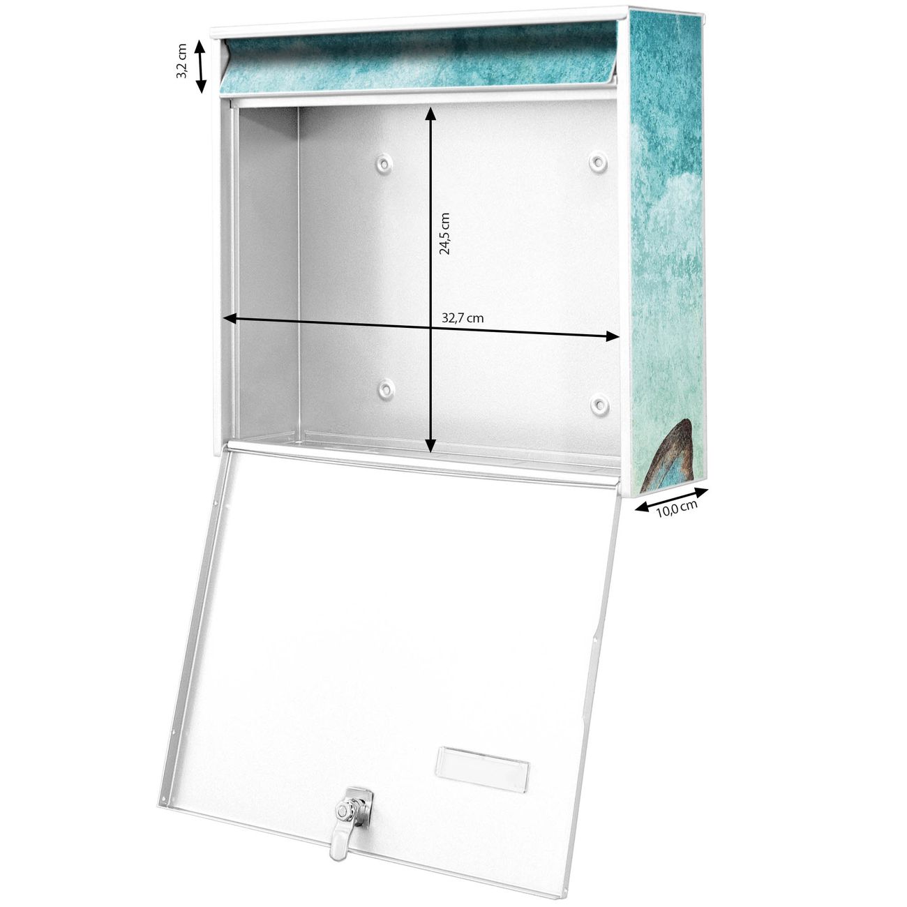 FUNKTION: Die Burg-Wächter Briefkastenanlage mit Motiv Blaue Schmetterlinge bietet Ihnen ausreichend Fassungsvermögen um auch A4 und C4 Sendungen zu empfangen. Das integrierte Namensschild lässt sich individuell beschriften. Wählen Sie aus den Grundfarben weiß, silber und schwarz. DESIGN: Die 2 Briefkästen haben ein ansprechendes und zeitloses Design, ohne dabei auf Funktionalität zu verzichten. Das Material ist sehr stabil, wetterfest und rostfrei. Durch das Motiv Blaue Schmetterlinge werden die Postkästen zu einem Blickfang. DETAILS: Die Postkästen bestehen aus verzinktem Stahl der zusätzlich mit Klarlack versiegelt wurde. Die Kästen sind gesamt 64,5cm hoch, 36,2cm breit und 10cm tief. Das Motiv besteht aus einer wetter- und UV-festen Folie, die Ihren Briefkasten zusätzlich vor Kratzern schützt. Die Postkästen werden mit Montagematerial, je einem Namensschild und je zwei Schlüsseln geliefert. NUTZEN: Das Briefkastenset eignet sich für die Wandmontage, die Größe bietet genügend Platz für Sendungen aller Art. Das zeitlose Design sowie die stabile Bauart bieten Ihnen einen treuen Begleiter für Ihre Post. BANJADO: