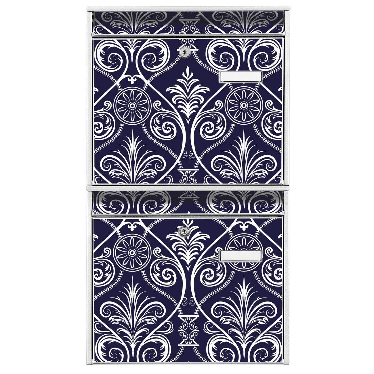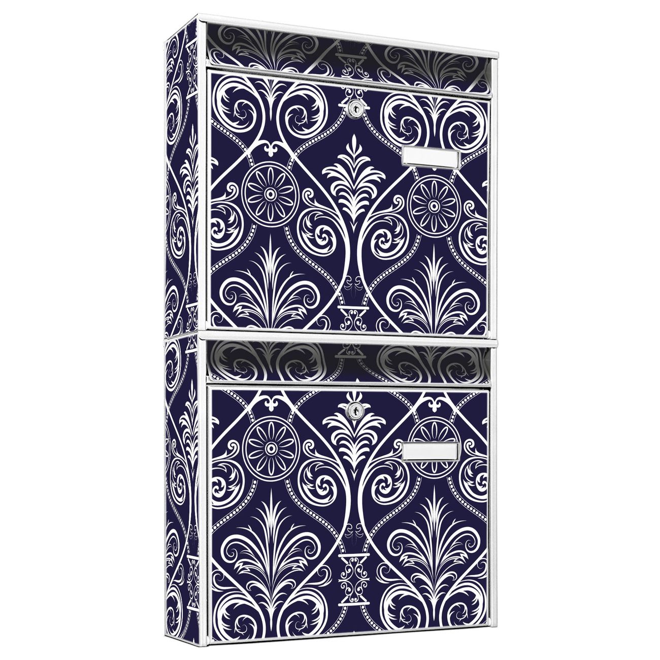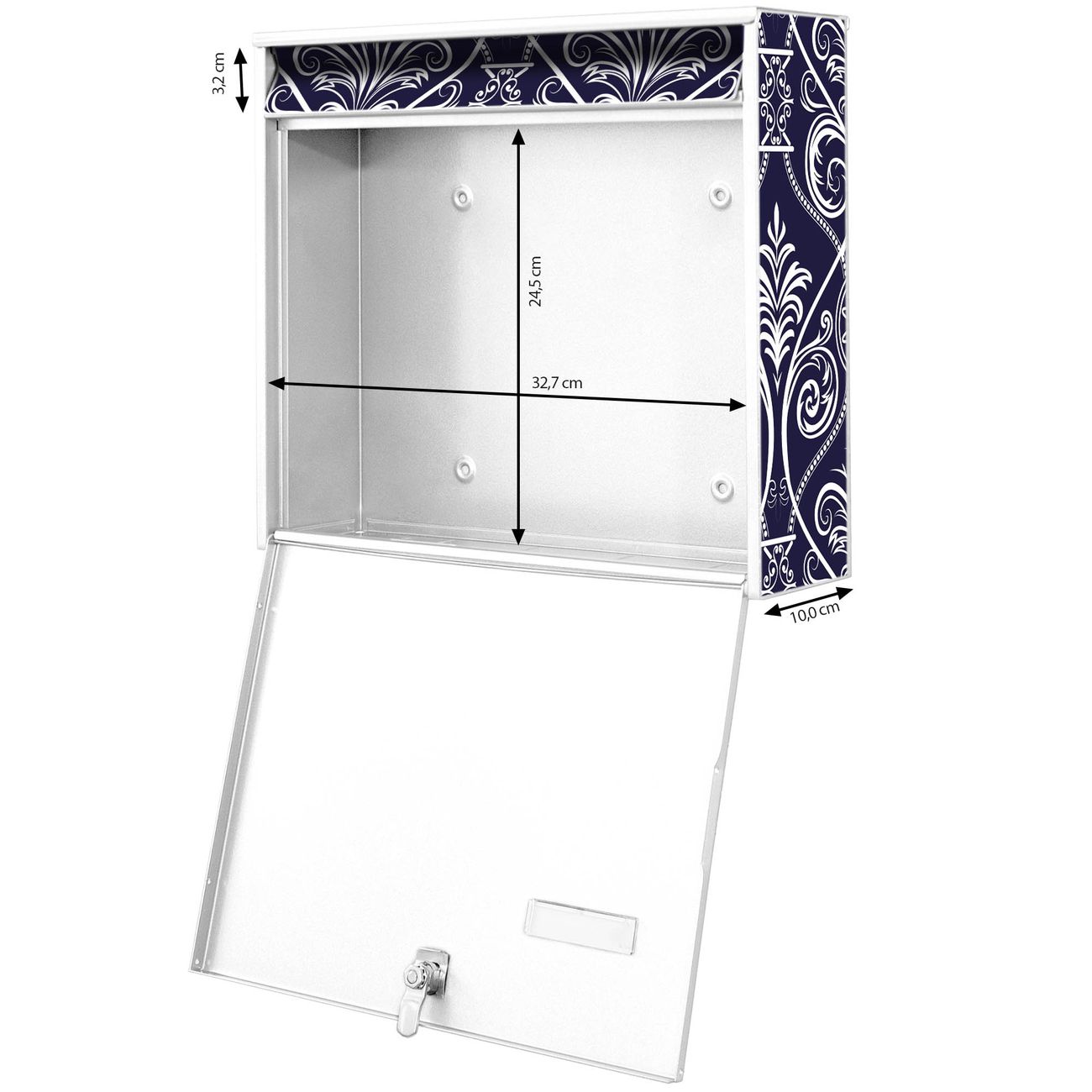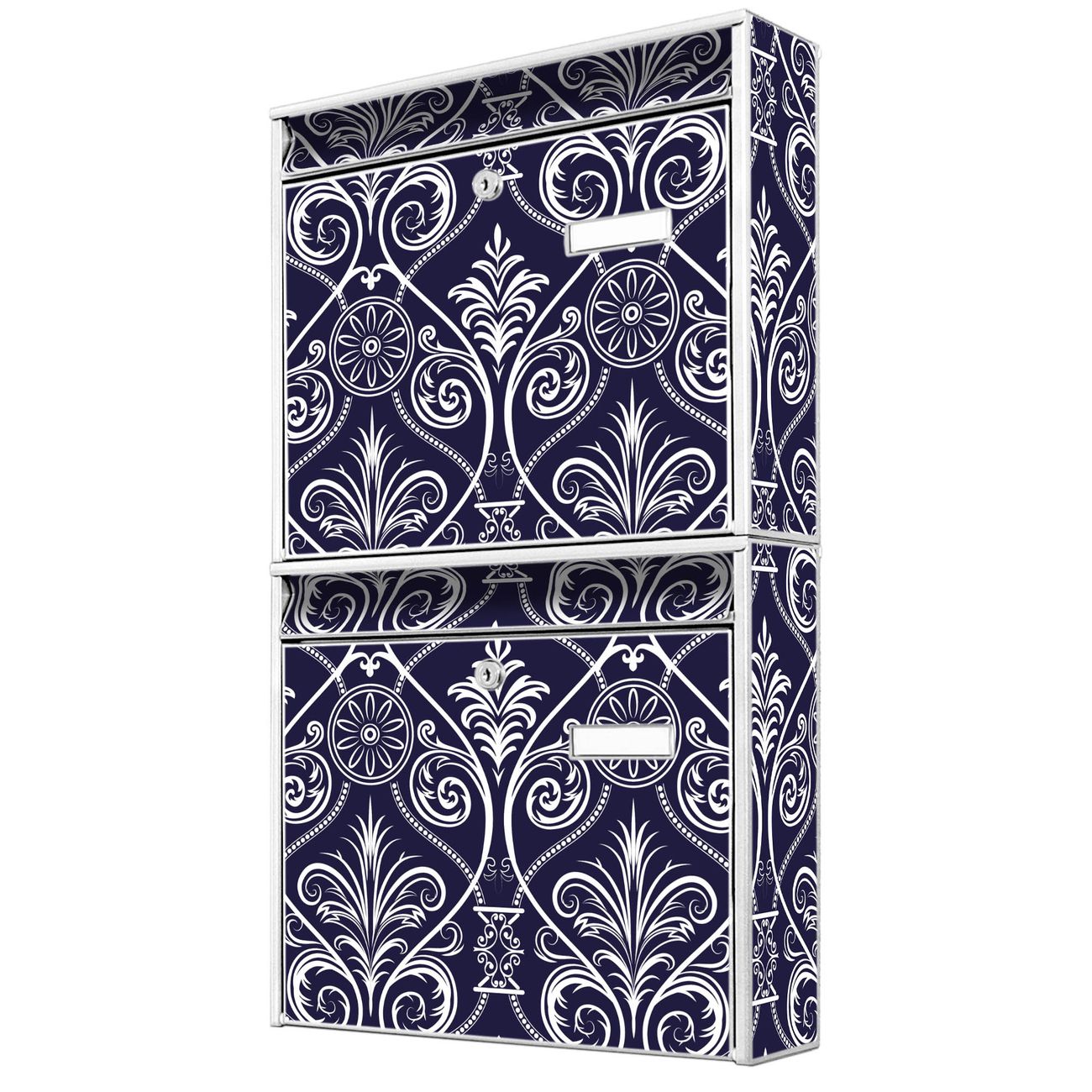 FUNKTION: Die Burg-Wächter Briefkastenanlage mit Motiv Blaue Tapete bietet Ihnen ausreichend Fassungsvermögen um auch A4 und C4 Sendungen zu empfangen. Das integrierte Namensschild lässt sich individuell beschriften. Wählen Sie aus den Grundfarben weiß, silber und schwarz. DESIGN: Die 2 Briefkästen haben ein ansprechendes und zeitloses Design, ohne dabei auf Funktionalität zu verzichten. Das Material ist sehr stabil, wetterfest und rostfrei. Durch das Motiv Blaue Tapete werden die Postkästen zu einem Blickfang. DETAILS: Die Postkästen bestehen aus verzinktem Stahl der zusätzlich mit Klarlack versiegelt wurde. Die Kästen sind gesamt 64,5cm hoch, 36,2cm breit und 10cm tief. Das Motiv besteht aus einer wetter- und UV-festen Folie, die Ihren Briefkasten zusätzlich vor Kratzern schützt. Die Postkästen werden mit Montagematerial, je einem Namensschild und je zwei Schlüsseln geliefert. NUTZEN: Das Briefkastenset eignet sich für die Wandmontage, die Größe bietet genügend Platz für Sendungen aller Art. Das zeitlose Design sowie die stabile Bauart bieten Ihnen einen treuen Begleiter für Ihre Post. BANJADO: