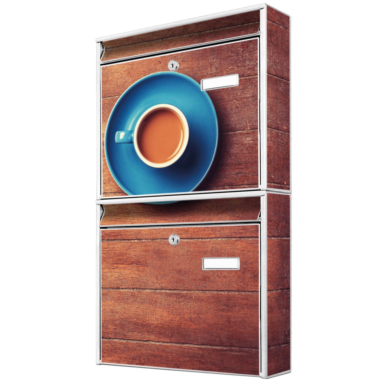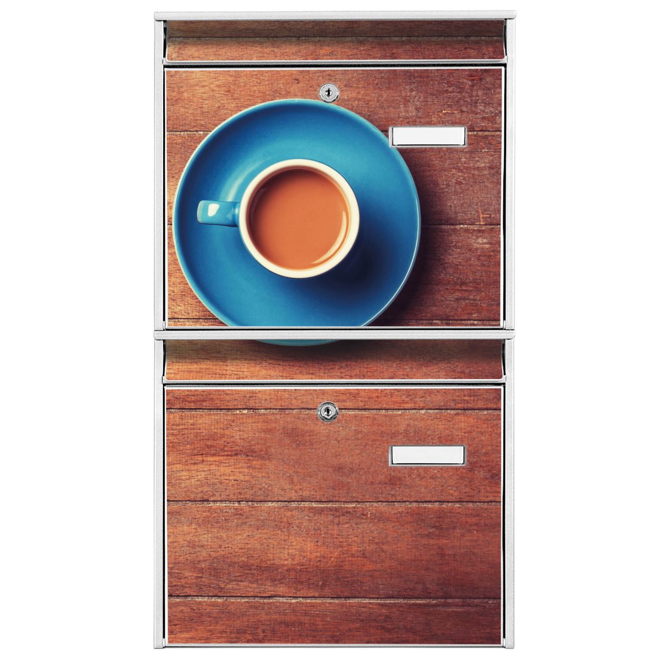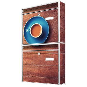 FUNKTION: Die Burg-Wächter Briefkastenanlage mit Motiv Blaue Tasse bietet Ihnen ausreichend Fassungsvermögen um auch A4 und C4 Sendungen zu empfangen. Das integrierte Namensschild lässt sich individuell beschriften. Wählen Sie aus den Grundfarben weiß, silber und schwarz. DESIGN: Die 2 Briefkästen haben ein ansprechendes und zeitloses Design, ohne dabei auf Funktionalität zu verzichten. Das Material ist sehr stabil, wetterfest und rostfrei. Durch das Motiv Blaue Tasse werden die Postkästen zu einem Blickfang. DETAILS: Die Postkästen bestehen aus verzinktem Stahl der zusätzlich mit Klarlack versiegelt wurde. Die Kästen sind gesamt 64,5cm hoch, 36,2cm breit und 10cm tief. Das Motiv besteht aus einer wetter- und UV-festen Folie, die Ihren Briefkasten zusätzlich vor Kratzern schützt. Die Postkästen werden mit Montagematerial, je einem Namensschild und je zwei Schlüsseln geliefert. NUTZEN: Das Briefkastenset eignet sich für die Wandmontage, die Größe bietet genügend Platz für Sendungen aller Art. Das zeitlose Design sowie die stabile Bauart bieten Ihnen einen treuen Begleiter für Ihre Post. BANJADO: