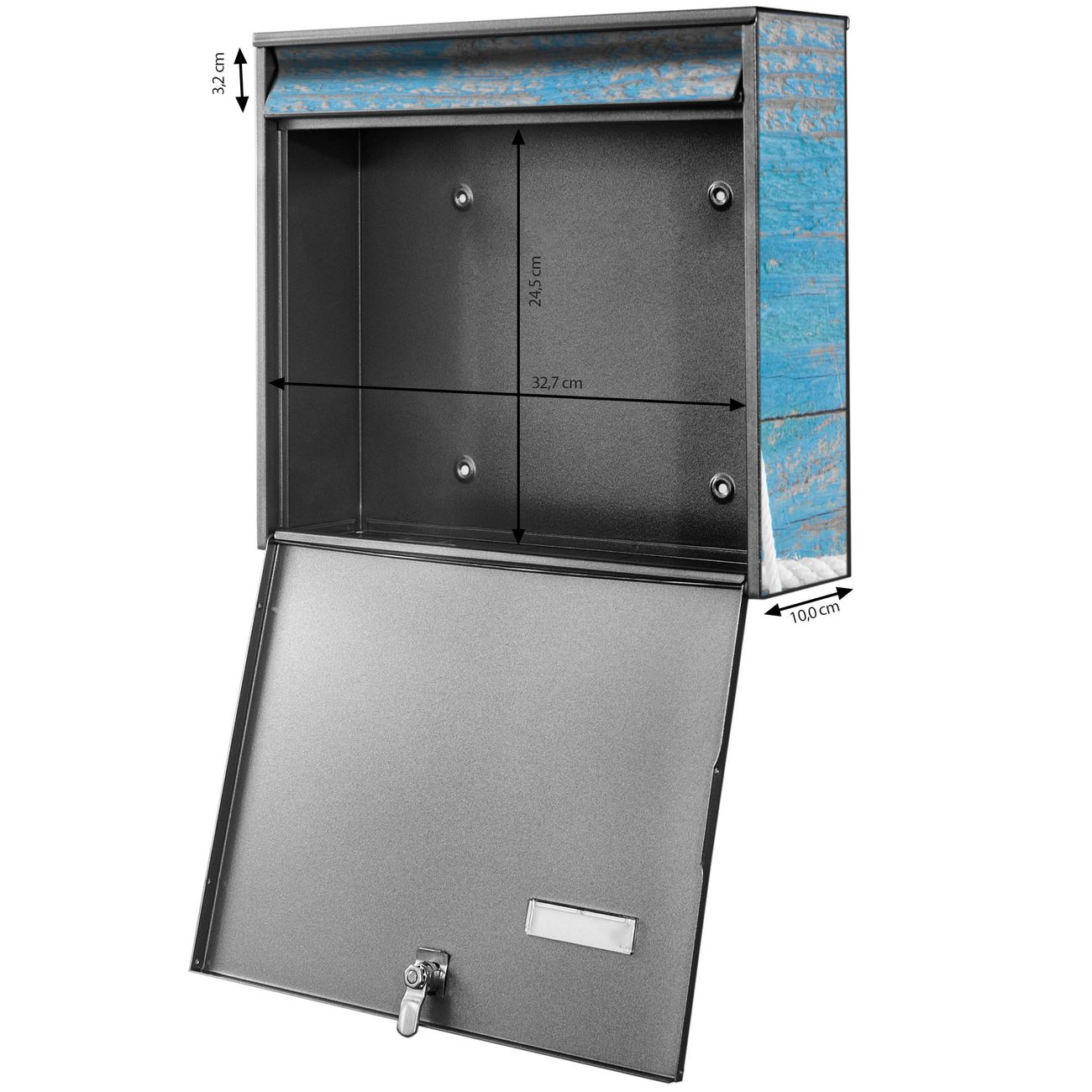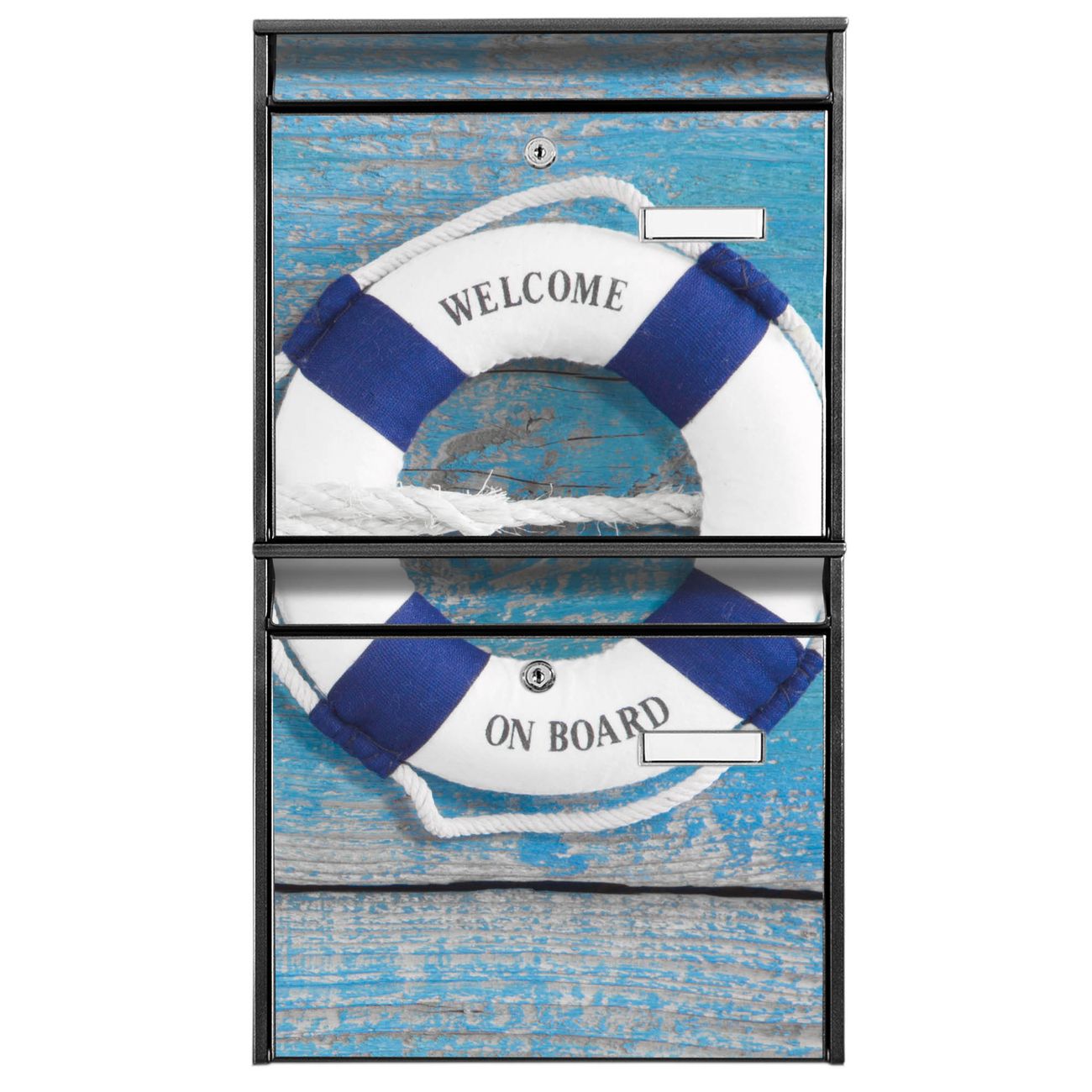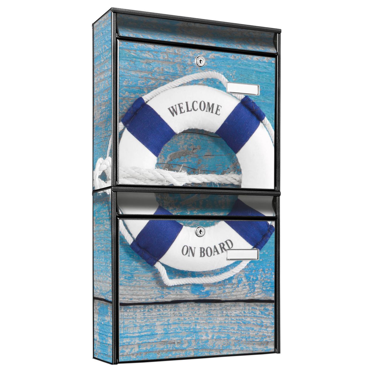FUNKTION: Die Burg-Wächter Briefkastenanlage mit Motiv Blauer Rettungsring bietet Ihnen ausreichend Fassungsvermögen um auch A4 und C4 Sendungen zu empfangen. Das integrierte Namensschild lässt sich individuell beschriften. Wählen Sie aus den Grundfarben weiß, silber und schwarz. DESIGN: Die 2 Briefkästen haben ein ansprechendes und zeitloses Design, ohne dabei auf Funktionalität zu verzichten. Das Material ist sehr stabil, wetterfest und rostfrei. Durch das Motiv Blauer Rettungsring werden die Postkästen zu einem Blickfang. DETAILS: Die Postkästen bestehen aus verzinktem Stahl der zusätzlich mit Klarlack versiegelt wurde. Die Kästen sind gesamt 64,5cm hoch, 36,2cm breit und 10cm tief. Das Motiv besteht aus einer wetter- und UV-festen Folie, die Ihren Briefkasten zusätzlich vor Kratzern schützt. Die Postkästen werden mit Montagematerial, je einem Namensschild und je zwei Schlüsseln geliefert. NUTZEN: Das Briefkastenset eignet sich für die Wandmontage, die Größe bietet genügend Platz für Sendungen aller Art. Das zeitlose Design sowie die stabile Bauart bieten Ihnen einen treuen Begleiter für Ihre Post. BANJADO: