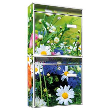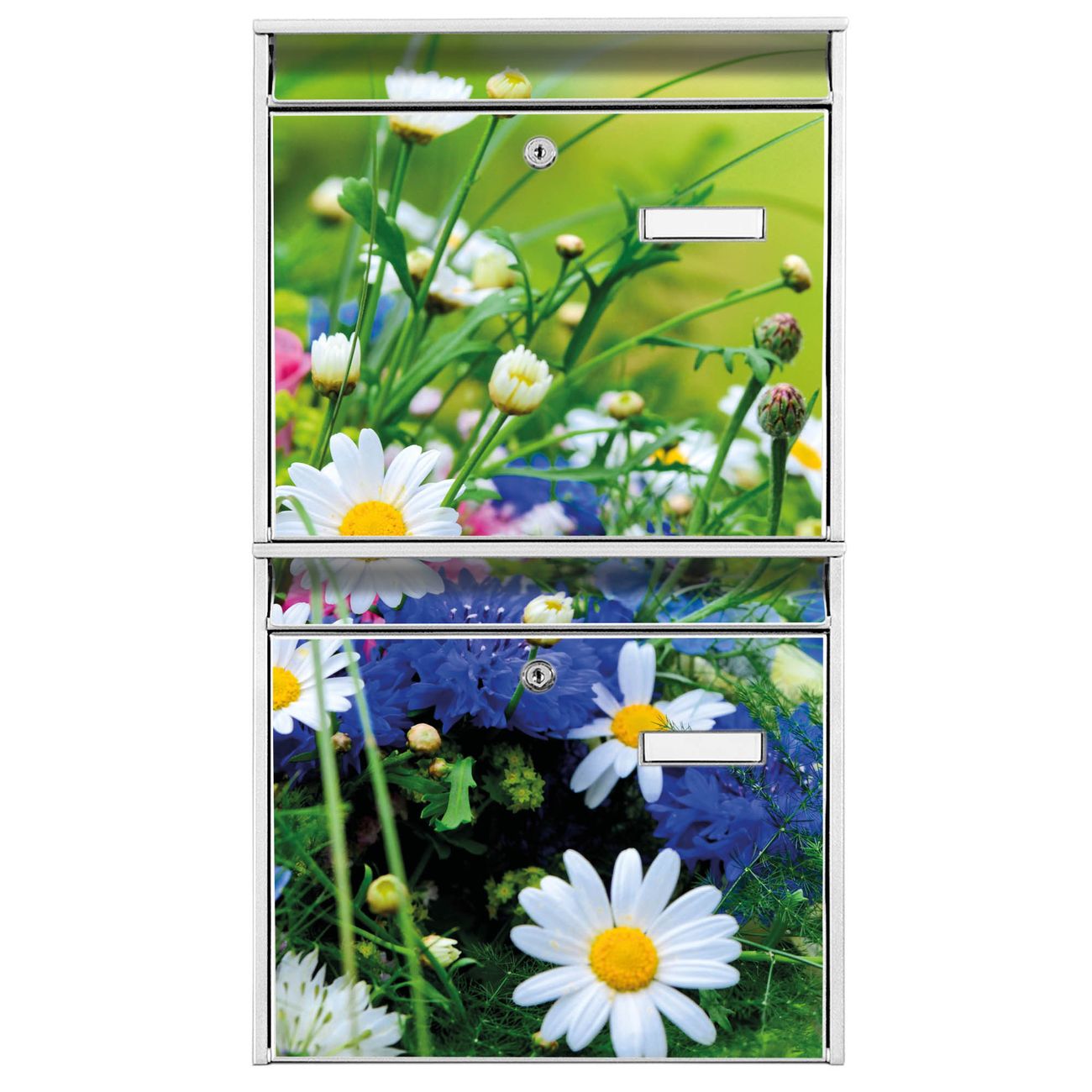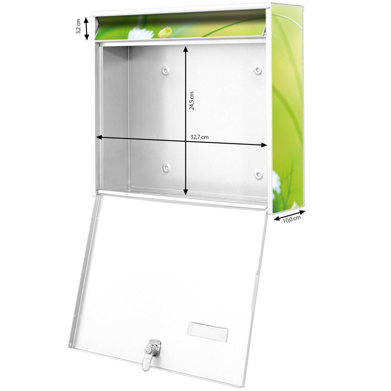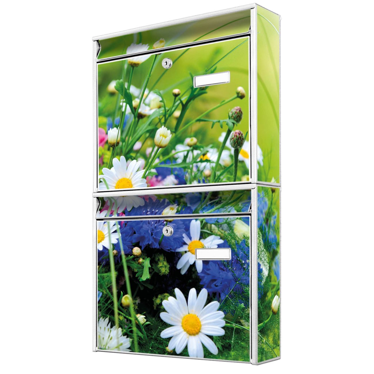 FUNKTION: Die Burg-Wächter Briefkastenanlage mit Motiv Blumenstrauß bietet Ihnen ausreichend Fassungsvermögen um auch A4 und C4 Sendungen zu empfangen. Das integrierte Namensschild lässt sich individuell beschriften. Wählen Sie aus den Grundfarben weiß, silber und schwarz. DESIGN: Die 2 Briefkästen haben ein ansprechendes und zeitloses Design, ohne dabei auf Funktionalität zu verzichten. Das Material ist sehr stabil, wetterfest und rostfrei. Durch das Motiv Blumenstrauß werden die Postkästen zu einem Blickfang. DETAILS: Die Postkästen bestehen aus verzinktem Stahl der zusätzlich mit Klarlack versiegelt wurde. Die Kästen sind gesamt 64,5cm hoch, 36,2cm breit und 10cm tief. Das Motiv besteht aus einer wetter- und UV-festen Folie, die Ihren Briefkasten zusätzlich vor Kratzern schützt. Die Postkästen werden mit Montagematerial, je einem Namensschild und je zwei Schlüsseln geliefert. NUTZEN: Das Briefkastenset eignet sich für die Wandmontage, die Größe bietet genügend Platz für Sendungen aller Art. Das zeitlose Design sowie die stabile Bauart bieten Ihnen einen treuen Begleiter für Ihre Post. BANJADO: