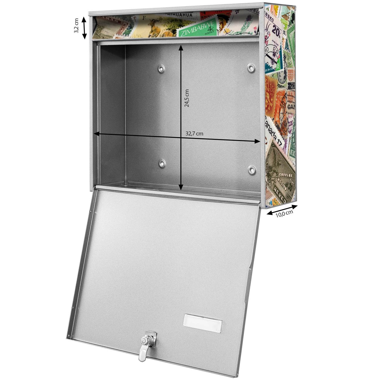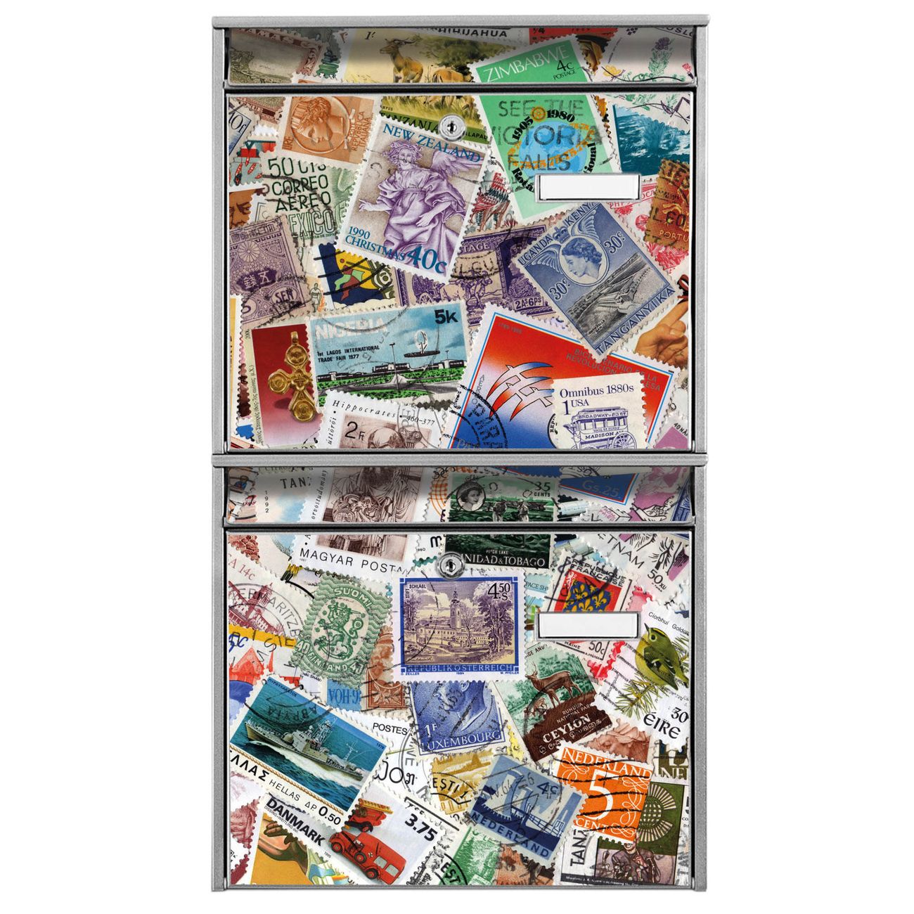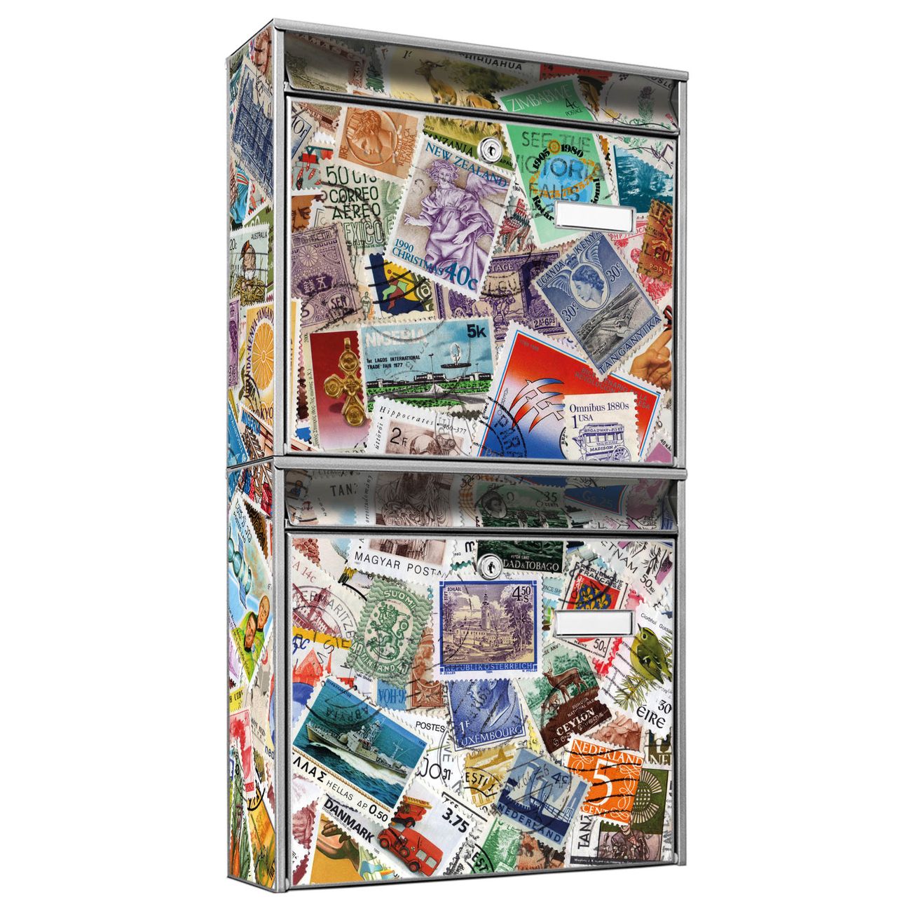 FUNKTION: Die Burg-Wächter Briefkastenanlage mit Motiv Briefmarken bietet Ihnen ausreichend Fassungsvermögen um auch A4 und C4 Sendungen zu empfangen. Das integrierte Namensschild lässt sich individuell beschriften. Wählen Sie aus den Grundfarben weiß, silber und schwarz. DESIGN: Die 2 Briefkästen haben ein ansprechendes und zeitloses Design, ohne dabei auf Funktionalität zu verzichten. Das Material ist sehr stabil, wetterfest und rostfrei. Durch das Motiv Briefmarken werden die Postkästen zu einem Blickfang. DETAILS: Die Postkästen bestehen aus verzinktem Stahl der zusätzlich mit Klarlack versiegelt wurde. Die Kästen sind gesamt 64,5cm hoch, 36,2cm breit und 10cm tief. Das Motiv besteht aus einer wetter- und UV-festen Folie, die Ihren Briefkasten zusätzlich vor Kratzern schützt. Die Postkästen werden mit Montagematerial, je einem Namensschild und je zwei Schlüsseln geliefert. NUTZEN: Das Briefkastenset eignet sich für die Wandmontage, die Größe bietet genügend Platz für Sendungen aller Art. Das zeitlose Design sowie die stabile Bauart bieten Ihnen einen treuen Begleiter für Ihre Post. BANJADO:
