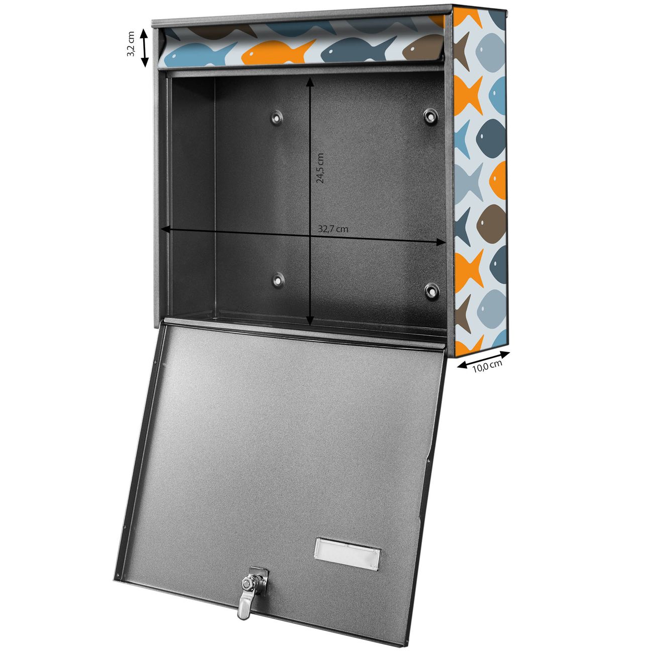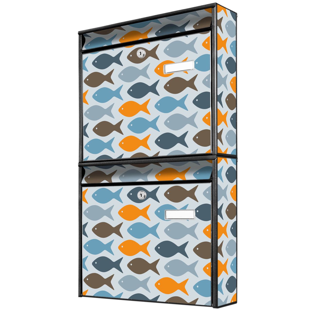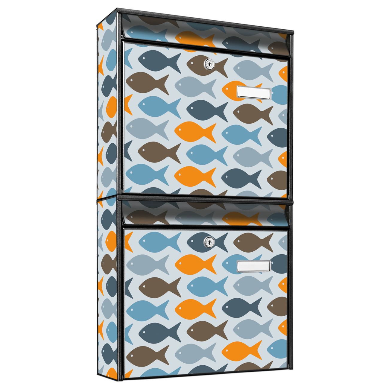FUNKTION: Die Burg-Wächter Briefkastenanlage mit Motiv Bunte Fische bietet Ihnen ausreichend Fassungsvermögen um auch A4 und C4 Sendungen zu empfangen. Das integrierte Namensschild lässt sich individuell beschriften. Wählen Sie aus den Grundfarben weiß, silber und schwarz. DESIGN: Die 2 Briefkästen haben ein ansprechendes und zeitloses Design, ohne dabei auf Funktionalität zu verzichten. Das Material ist sehr stabil, wetterfest und rostfrei. Durch das Motiv Bunte Fische werden die Postkästen zu einem Blickfang. DETAILS: Die Postkästen bestehen aus verzinktem Stahl der zusätzlich mit Klarlack versiegelt wurde. Die Kästen sind gesamt 64,5cm hoch, 36,2cm breit und 10cm tief. Das Motiv besteht aus einer wetter- und UV-festen Folie, die Ihren Briefkasten zusätzlich vor Kratzern schützt. Die Postkästen werden mit Montagematerial, je einem Namensschild und je zwei Schlüsseln geliefert. NUTZEN: Das Briefkastenset eignet sich für die Wandmontage, die Größe bietet genügend Platz für Sendungen aller Art. Das zeitlose Design sowie die stabile Bauart bieten Ihnen einen treuen Begleiter für Ihre Post. BANJADO: