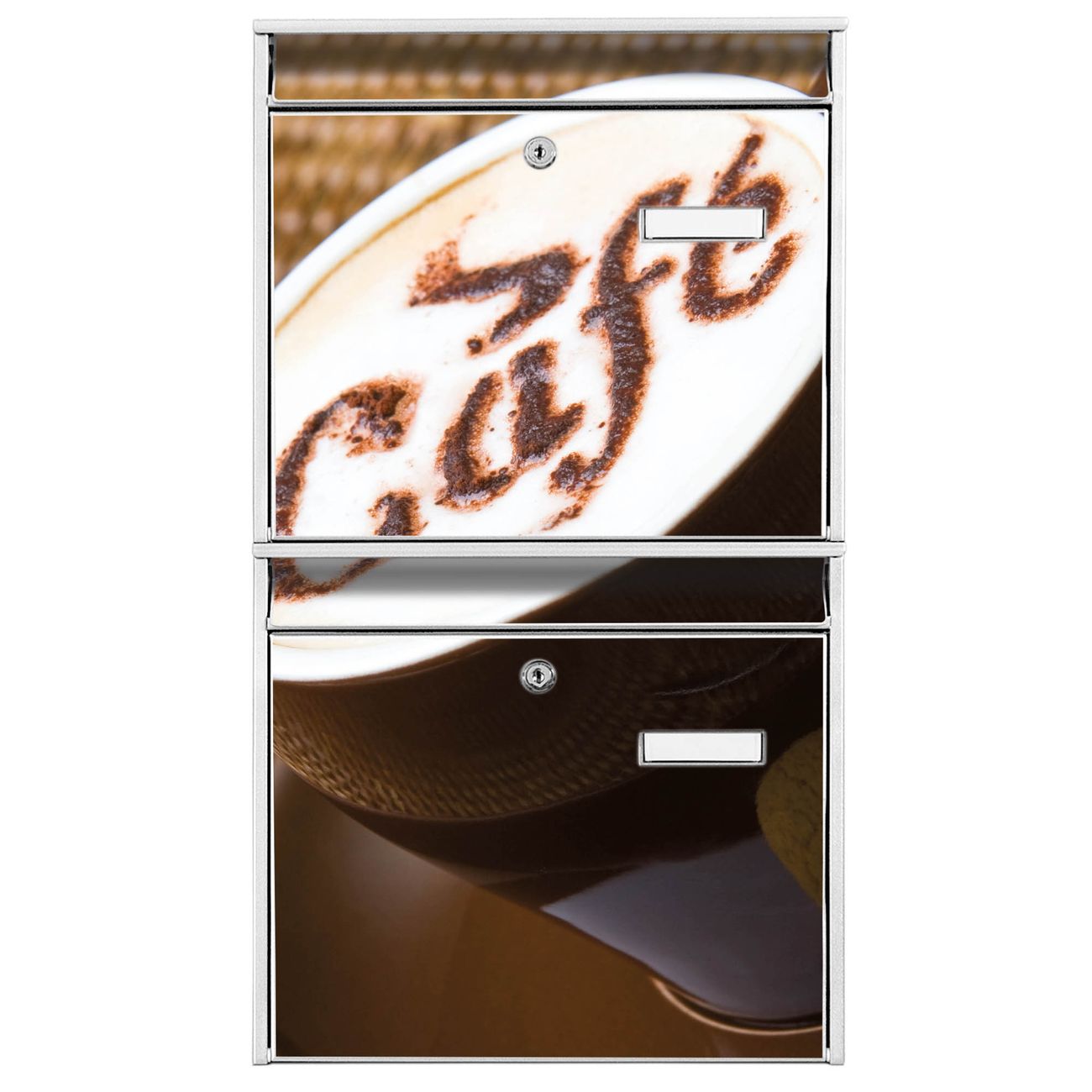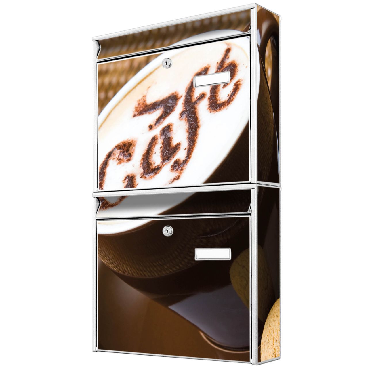 FUNKTION: Die Burg-Wächter Briefkastenanlage mit Motiv Cafe bietet Ihnen ausreichend Fassungsvermögen um auch A4 und C4 Sendungen zu empfangen. Das integrierte Namensschild lässt sich individuell beschriften. Wählen Sie aus den Grundfarben weiß, silber und schwarz. DESIGN: Die 2 Briefkästen haben ein ansprechendes und zeitloses Design, ohne dabei auf Funktionalität zu verzichten. Das Material ist sehr stabil, wetterfest und rostfrei. Durch das Motiv Cafe werden die Postkästen zu einem Blickfang. DETAILS: Die Postkästen bestehen aus verzinktem Stahl der zusätzlich mit Klarlack versiegelt wurde. Die Kästen sind gesamt 64,5cm hoch, 36,2cm breit und 10cm tief. Das Motiv besteht aus einer wetter- und UV-festen Folie, die Ihren Briefkasten zusätzlich vor Kratzern schützt. Die Postkästen werden mit Montagematerial, je einem Namensschild und je zwei Schlüsseln geliefert. NUTZEN: Das Briefkastenset eignet sich für die Wandmontage, die Größe bietet genügend Platz für Sendungen aller Art. Das zeitlose Design sowie die stabile Bauart bieten Ihnen einen treuen Begleiter für Ihre Post. BANJADO: