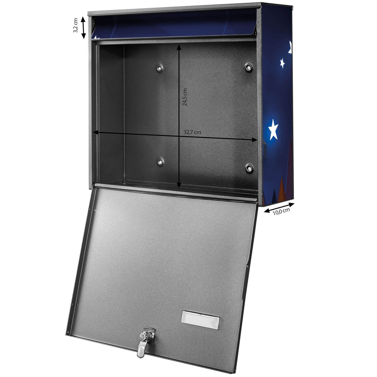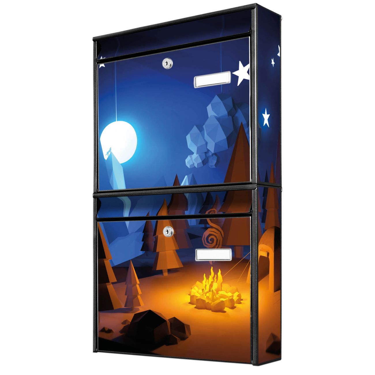 FUNKTION: Die Burg-Wächter Briefkastenanlage mit Motiv Camping 2 bietet Ihnen ausreichend Fassungsvermögen um auch A4 und C4 Sendungen zu empfangen. Das integrierte Namensschild lässt sich individuell beschriften. Wählen Sie aus den Grundfarben weiß, silber und schwarz. DESIGN: Die 2 Briefkästen haben ein ansprechendes und zeitloses Design, ohne dabei auf Funktionalität zu verzichten. Das Material ist sehr stabil, wetterfest und rostfrei. Durch das Motiv Camping 2 werden die Postkästen zu einem Blickfang. DETAILS: Die Postkästen bestehen aus verzinktem Stahl der zusätzlich mit Klarlack versiegelt wurde. Die Kästen sind gesamt 64,5cm hoch, 36,2cm breit und 10cm tief. Das Motiv besteht aus einer wetter- und UV-festen Folie, die Ihren Briefkasten zusätzlich vor Kratzern schützt. Die Postkästen werden mit Montagematerial, je einem Namensschild und je zwei Schlüsseln geliefert. NUTZEN: Das Briefkastenset eignet sich für die Wandmontage, die Größe bietet genügend Platz für Sendungen aller Art. Das zeitlose Design sowie die stabile Bauart bieten Ihnen einen treuen Begleiter für Ihre Post. BANJADO: