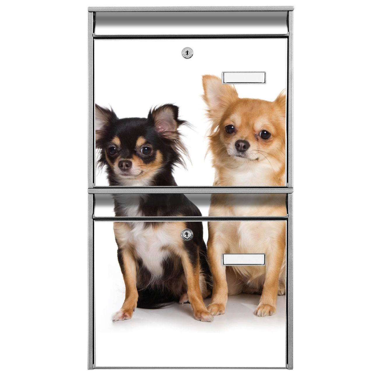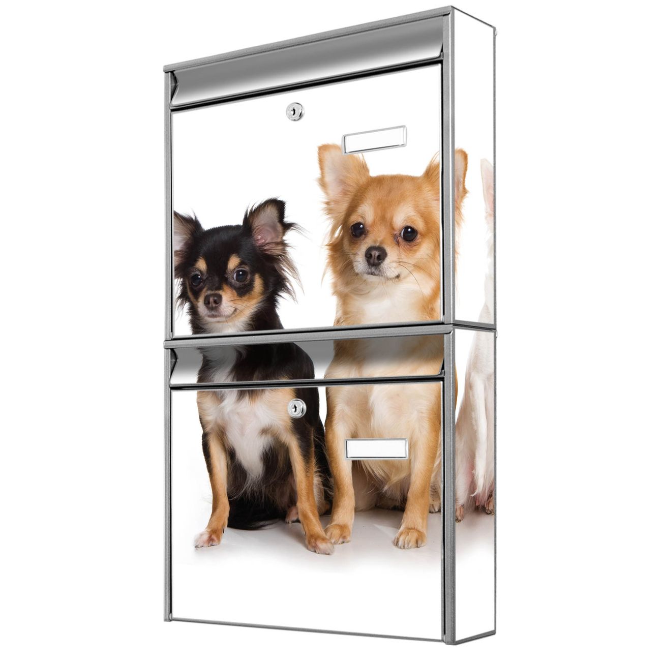 FUNKTION: Die Burg-Wächter Briefkastenanlage mit Motiv Chihuahua bietet Ihnen ausreichend Fassungsvermögen um auch A4 und C4 Sendungen zu empfangen. Das integrierte Namensschild lässt sich individuell beschriften. Wählen Sie aus den Grundfarben weiß, silber und schwarz. DESIGN: Die 2 Briefkästen haben ein ansprechendes und zeitloses Design, ohne dabei auf Funktionalität zu verzichten. Das Material ist sehr stabil, wetterfest und rostfrei. Durch das Motiv Chihuahua werden die Postkästen zu einem Blickfang. DETAILS: Die Postkästen bestehen aus verzinktem Stahl der zusätzlich mit Klarlack versiegelt wurde. Die Kästen sind gesamt 64,5cm hoch, 36,2cm breit und 10cm tief. Das Motiv besteht aus einer wetter- und UV-festen Folie, die Ihren Briefkasten zusätzlich vor Kratzern schützt. Die Postkästen werden mit Montagematerial, je einem Namensschild und je zwei Schlüsseln geliefert. NUTZEN: Das Briefkastenset eignet sich für die Wandmontage, die Größe bietet genügend Platz für Sendungen aller Art. Das zeitlose Design sowie die stabile Bauart bieten Ihnen einen treuen Begleiter für Ihre Post. BANJADO:
