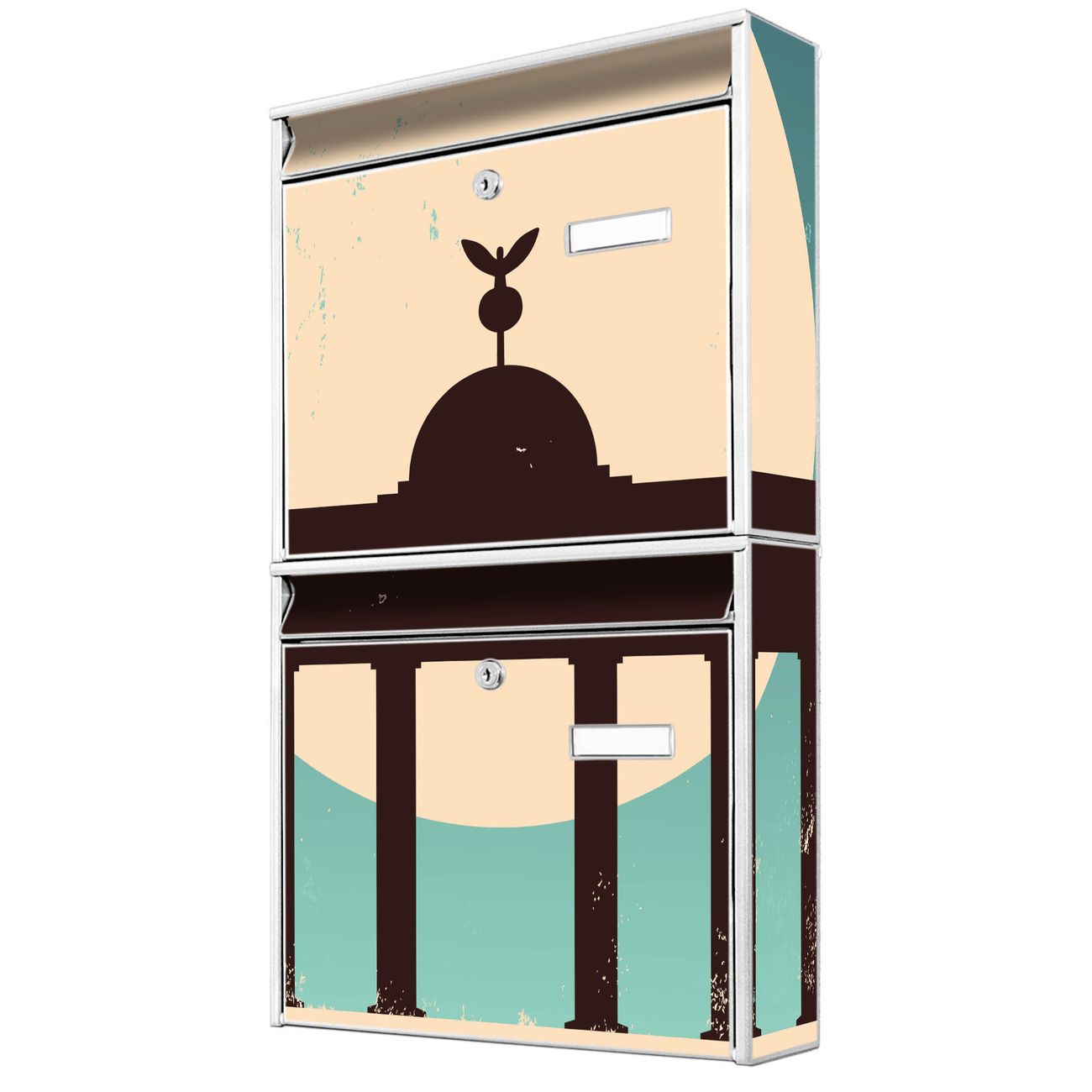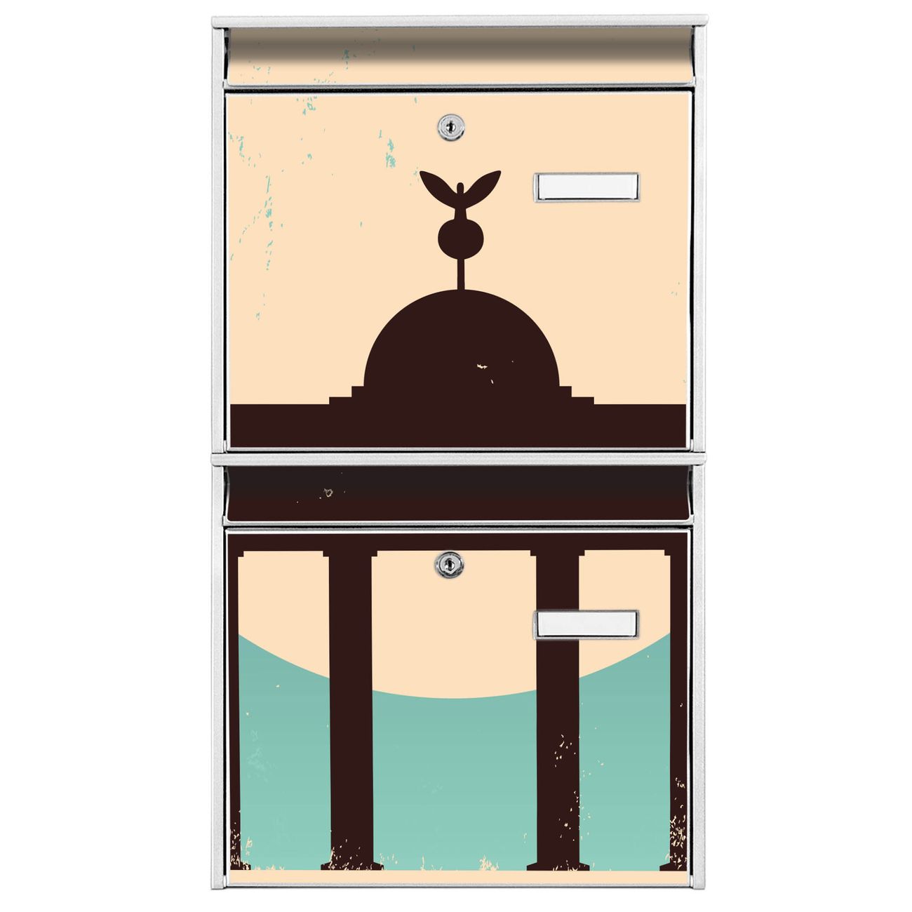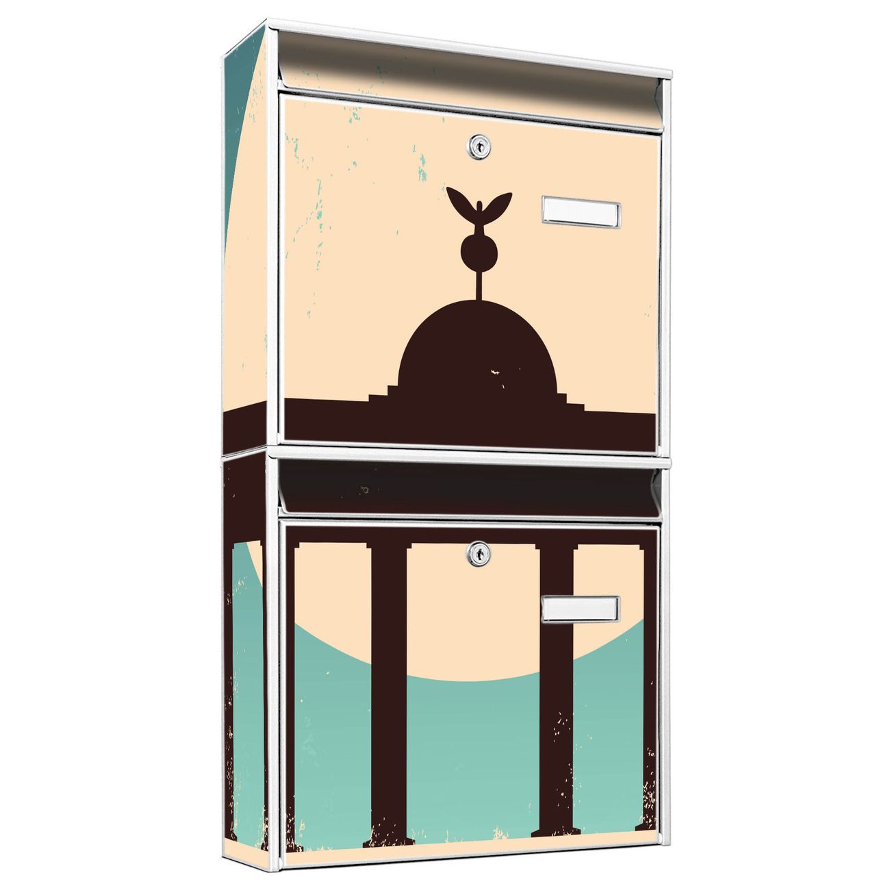 FUNKTION: Die Burg-Wächter Briefkastenanlage mit Motiv City Poster Berlin bietet Ihnen ausreichend Fassungsvermögen um auch A4 und C4 Sendungen zu empfangen. Das integrierte Namensschild lässt sich individuell beschriften. Wählen Sie aus den Grundfarben weiß, silber und schwarz. DESIGN: Die 2 Briefkästen haben ein ansprechendes und zeitloses Design, ohne dabei auf Funktionalität zu verzichten. Das Material ist sehr stabil, wetterfest und rostfrei. Durch das Motiv City Poster Berlin werden die Postkästen zu einem Blickfang. DETAILS: Die Postkästen bestehen aus verzinktem Stahl der zusätzlich mit Klarlack versiegelt wurde. Die Kästen sind gesamt 64,5cm hoch, 36,2cm breit und 10cm tief. Das Motiv besteht aus einer wetter- und UV-festen Folie, die Ihren Briefkasten zusätzlich vor Kratzern schützt. Die Postkästen werden mit Montagematerial, je einem Namensschild und je zwei Schlüsseln geliefert. NUTZEN: Das Briefkastenset eignet sich für die Wandmontage, die Größe bietet genügend Platz für Sendungen aller Art. Das zeitlose Design sowie die stabile Bauart bieten Ihnen einen treuen Begleiter für Ihre Post. BANJADO: