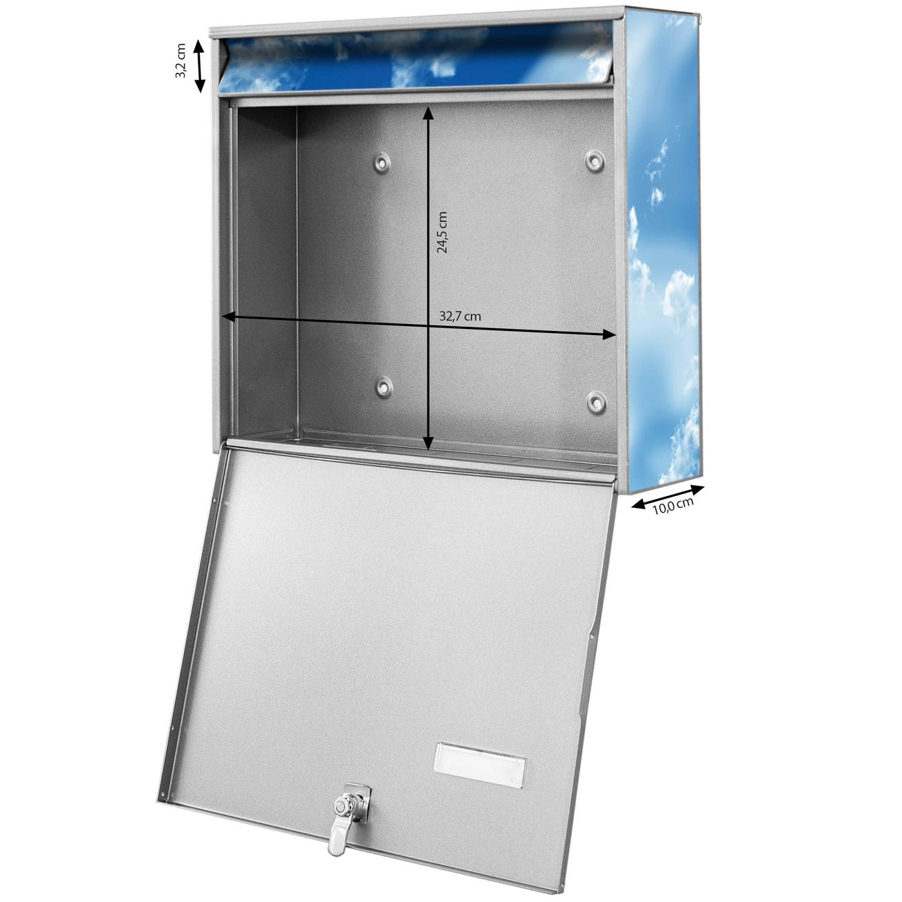 FUNKTION: Die Burg-Wächter Briefkastenanlage mit Motiv Clouds bietet Ihnen ausreichend Fassungsvermögen um auch A4 und C4 Sendungen zu empfangen. Das integrierte Namensschild lässt sich individuell beschriften. Wählen Sie aus den Grundfarben weiß, silber und schwarz. DESIGN: Die 2 Briefkästen haben ein ansprechendes und zeitloses Design, ohne dabei auf Funktionalität zu verzichten. Das Material ist sehr stabil, wetterfest und rostfrei. Durch das Motiv Clouds werden die Postkästen zu einem Blickfang. DETAILS: Die Postkästen bestehen aus verzinktem Stahl der zusätzlich mit Klarlack versiegelt wurde. Die Kästen sind gesamt 64,5cm hoch, 36,2cm breit und 10cm tief. Das Motiv besteht aus einer wetter- und UV-festen Folie, die Ihren Briefkasten zusätzlich vor Kratzern schützt. Die Postkästen werden mit Montagematerial, je einem Namensschild und je zwei Schlüsseln geliefert. NUTZEN: Das Briefkastenset eignet sich für die Wandmontage, die Größe bietet genügend Platz für Sendungen aller Art. Das zeitlose Design sowie die stabile Bauart bieten Ihnen einen treuen Begleiter für Ihre Post. BANJADO: