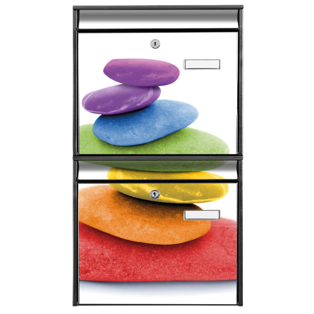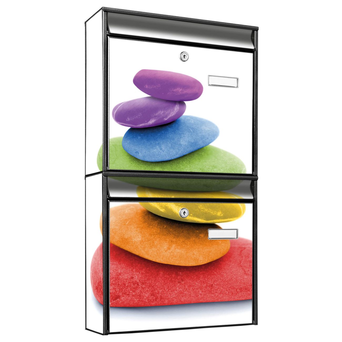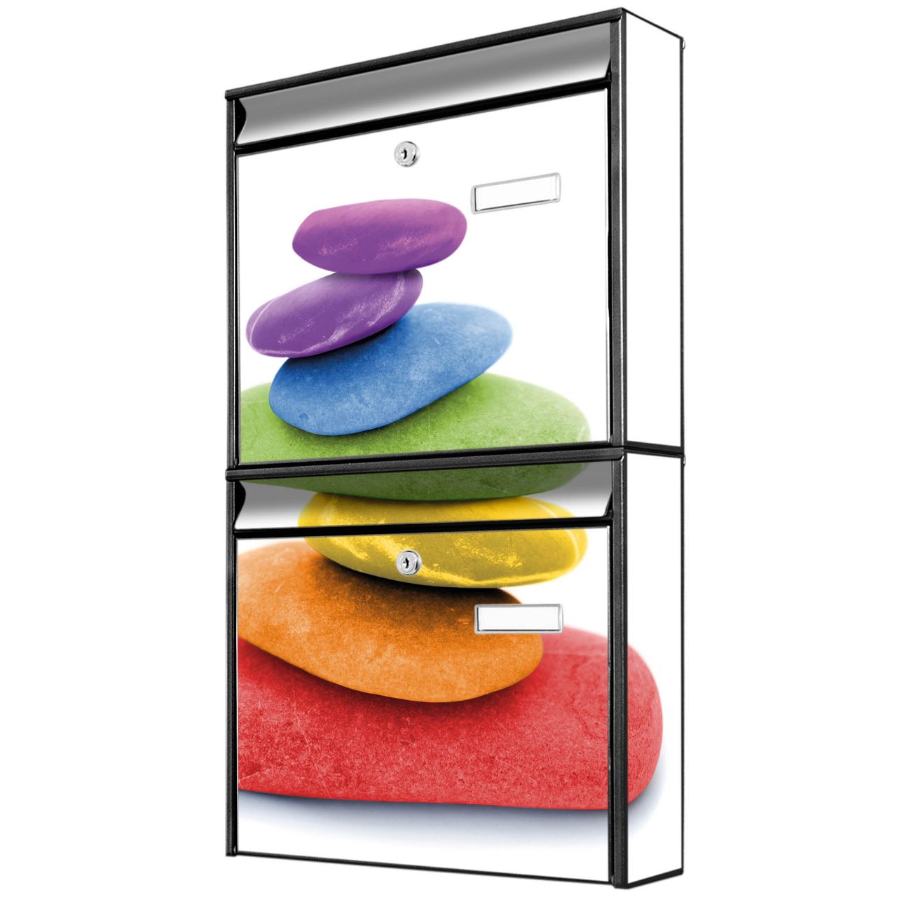 FUNKTION: Die Burg-Wächter Briefkastenanlage mit Motiv Coloured Stone bietet Ihnen ausreichend Fassungsvermögen um auch A4 und C4 Sendungen zu empfangen. Das integrierte Namensschild lässt sich individuell beschriften. Wählen Sie aus den Grundfarben weiß, silber und schwarz. DESIGN: Die 2 Briefkästen haben ein ansprechendes und zeitloses Design, ohne dabei auf Funktionalität zu verzichten. Das Material ist sehr stabil, wetterfest und rostfrei. Durch das Motiv Coloured Stone werden die Postkästen zu einem Blickfang. DETAILS: Die Postkästen bestehen aus verzinktem Stahl der zusätzlich mit Klarlack versiegelt wurde. Die Kästen sind gesamt 64,5cm hoch, 36,2cm breit und 10cm tief. Das Motiv besteht aus einer wetter- und UV-festen Folie, die Ihren Briefkasten zusätzlich vor Kratzern schützt. Die Postkästen werden mit Montagematerial, je einem Namensschild und je zwei Schlüsseln geliefert. NUTZEN: Das Briefkastenset eignet sich für die Wandmontage, die Größe bietet genügend Platz für Sendungen aller Art. Das zeitlose Design sowie die stabile Bauart bieten Ihnen einen treuen Begleiter für Ihre Post. BANJADO:
