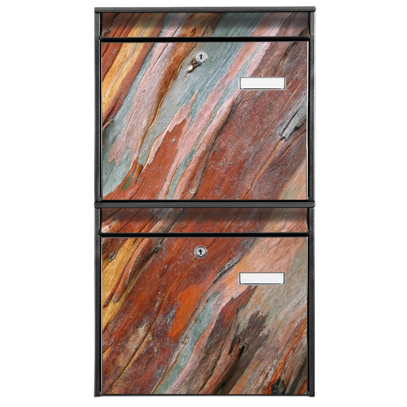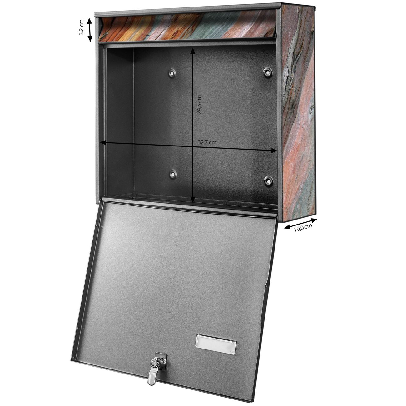 FUNKTION: Die Burg-Wächter Briefkastenanlage mit Motiv Coloured Wood bietet Ihnen ausreichend Fassungsvermögen um auch A4 und C4 Sendungen zu empfangen. Das integrierte Namensschild lässt sich individuell beschriften. Wählen Sie aus den Grundfarben weiß, silber und schwarz. DESIGN: Die 2 Briefkästen haben ein ansprechendes und zeitloses Design, ohne dabei auf Funktionalität zu verzichten. Das Material ist sehr stabil, wetterfest und rostfrei. Durch das Motiv Coloured Wood werden die Postkästen zu einem Blickfang. DETAILS: Die Postkästen bestehen aus verzinktem Stahl der zusätzlich mit Klarlack versiegelt wurde. Die Kästen sind gesamt 64,5cm hoch, 36,2cm breit und 10cm tief. Das Motiv besteht aus einer wetter- und UV-festen Folie, die Ihren Briefkasten zusätzlich vor Kratzern schützt. Die Postkästen werden mit Montagematerial, je einem Namensschild und je zwei Schlüsseln geliefert. NUTZEN: Das Briefkastenset eignet sich für die Wandmontage, die Größe bietet genügend Platz für Sendungen aller Art. Das zeitlose Design sowie die stabile Bauart bieten Ihnen einen treuen Begleiter für Ihre Post. BANJADO: