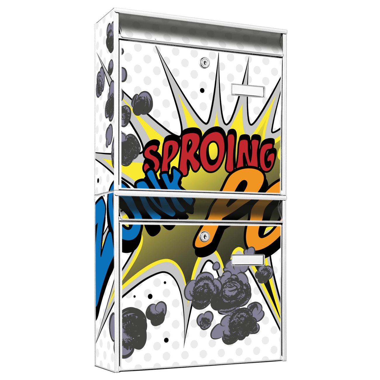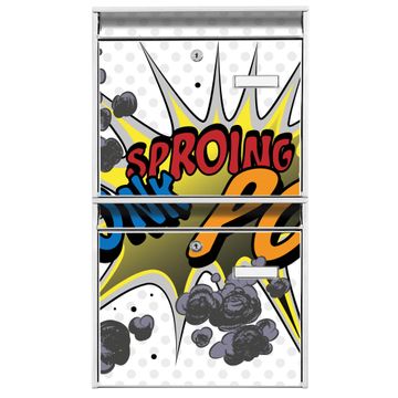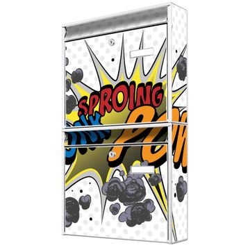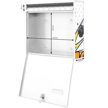FUNKTION: Die Burg-Wächter Briefkastenanlage mit Motiv Comic bietet Ihnen ausreichend Fassungsvermögen um auch A4 und C4 Sendungen zu empfangen. Das integrierte Namensschild lässt sich individuell beschriften. Wählen Sie aus den Grundfarben weiß, silber und schwarz. DESIGN: Die 2 Briefkästen haben ein ansprechendes und zeitloses Design, ohne dabei auf Funktionalität zu verzichten. Das Material ist sehr stabil, wetterfest und rostfrei. Durch das Motiv Comic werden die Postkästen zu einem Blickfang. DETAILS: Die Postkästen bestehen aus verzinktem Stahl der zusätzlich mit Klarlack versiegelt wurde. Die Kästen sind gesamt 64,5cm hoch, 36,2cm breit und 10cm tief. Das Motiv besteht aus einer wetter- und UV-festen Folie, die Ihren Briefkasten zusätzlich vor Kratzern schützt. Die Postkästen werden mit Montagematerial, je einem Namensschild und je zwei Schlüsseln geliefert. NUTZEN: Das Briefkastenset eignet sich für die Wandmontage, die Größe bietet genügend Platz für Sendungen aller Art. Das zeitlose Design sowie die stabile Bauart bieten Ihnen einen treuen Begleiter für Ihre Post. BANJADO: