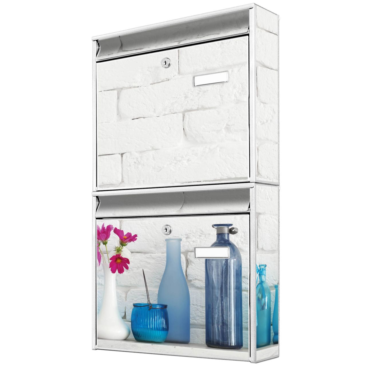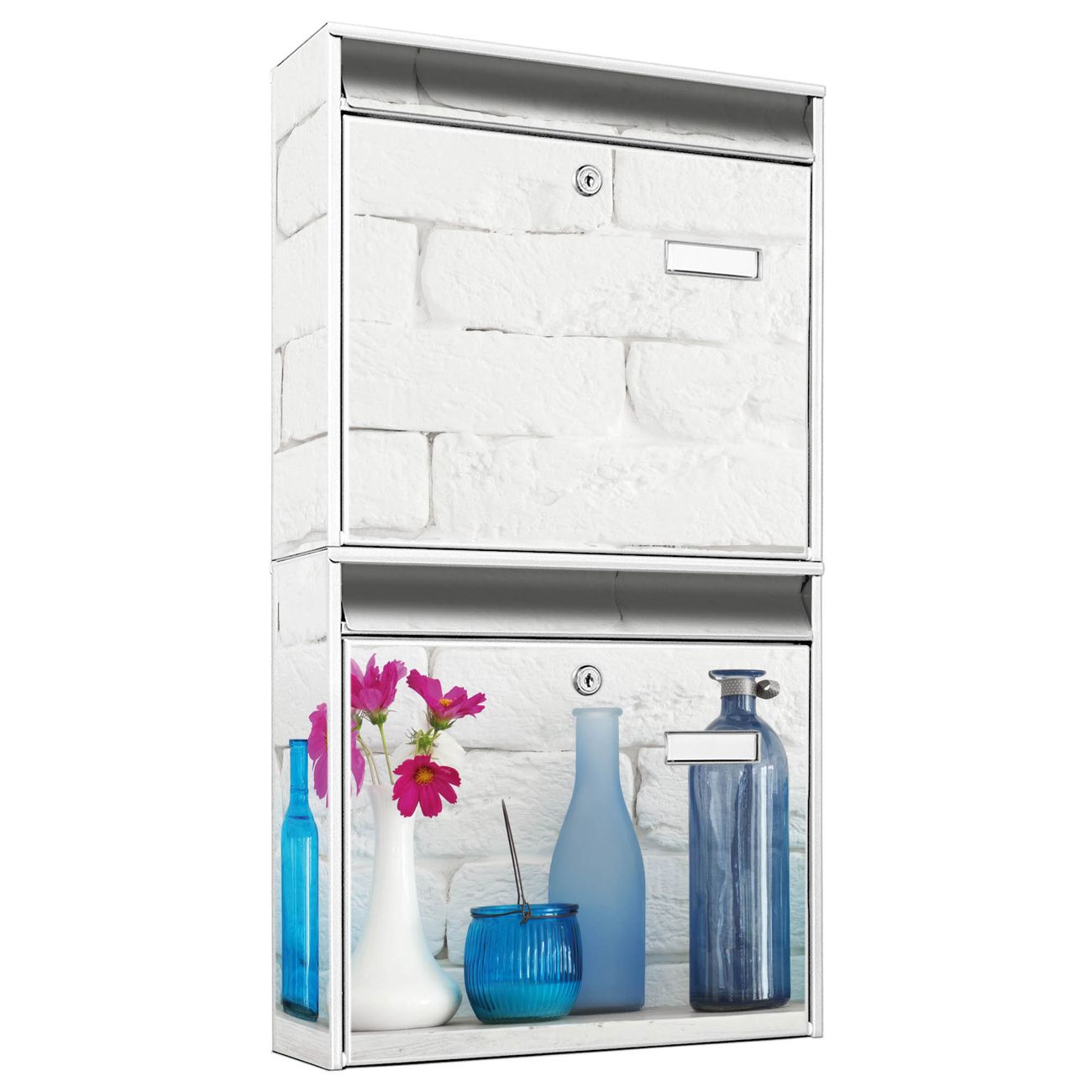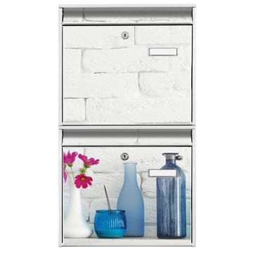 FUNKTION: Die Burg-Wächter Briefkastenanlage mit Motiv Dekoartikel Blau bietet Ihnen ausreichend Fassungsvermögen um auch A4 und C4 Sendungen zu empfangen. Das integrierte Namensschild lässt sich individuell beschriften. Wählen Sie aus den Grundfarben weiß, silber und schwarz. DESIGN: Die 2 Briefkästen haben ein ansprechendes und zeitloses Design, ohne dabei auf Funktionalität zu verzichten. Das Material ist sehr stabil, wetterfest und rostfrei. Durch das Motiv Dekoartikel Blau werden die Postkästen zu einem Blickfang. DETAILS: Die Postkästen bestehen aus verzinktem Stahl der zusätzlich mit Klarlack versiegelt wurde. Die Kästen sind gesamt 64,5cm hoch, 36,2cm breit und 10cm tief. Das Motiv besteht aus einer wetter- und UV-festen Folie, die Ihren Briefkasten zusätzlich vor Kratzern schützt. Die Postkästen werden mit Montagematerial, je einem Namensschild und je zwei Schlüsseln geliefert. NUTZEN: Das Briefkastenset eignet sich für die Wandmontage, die Größe bietet genügend Platz für Sendungen aller Art. Das zeitlose Design sowie die stabile Bauart bieten Ihnen einen treuen Begleiter für Ihre Post. BANJADO: