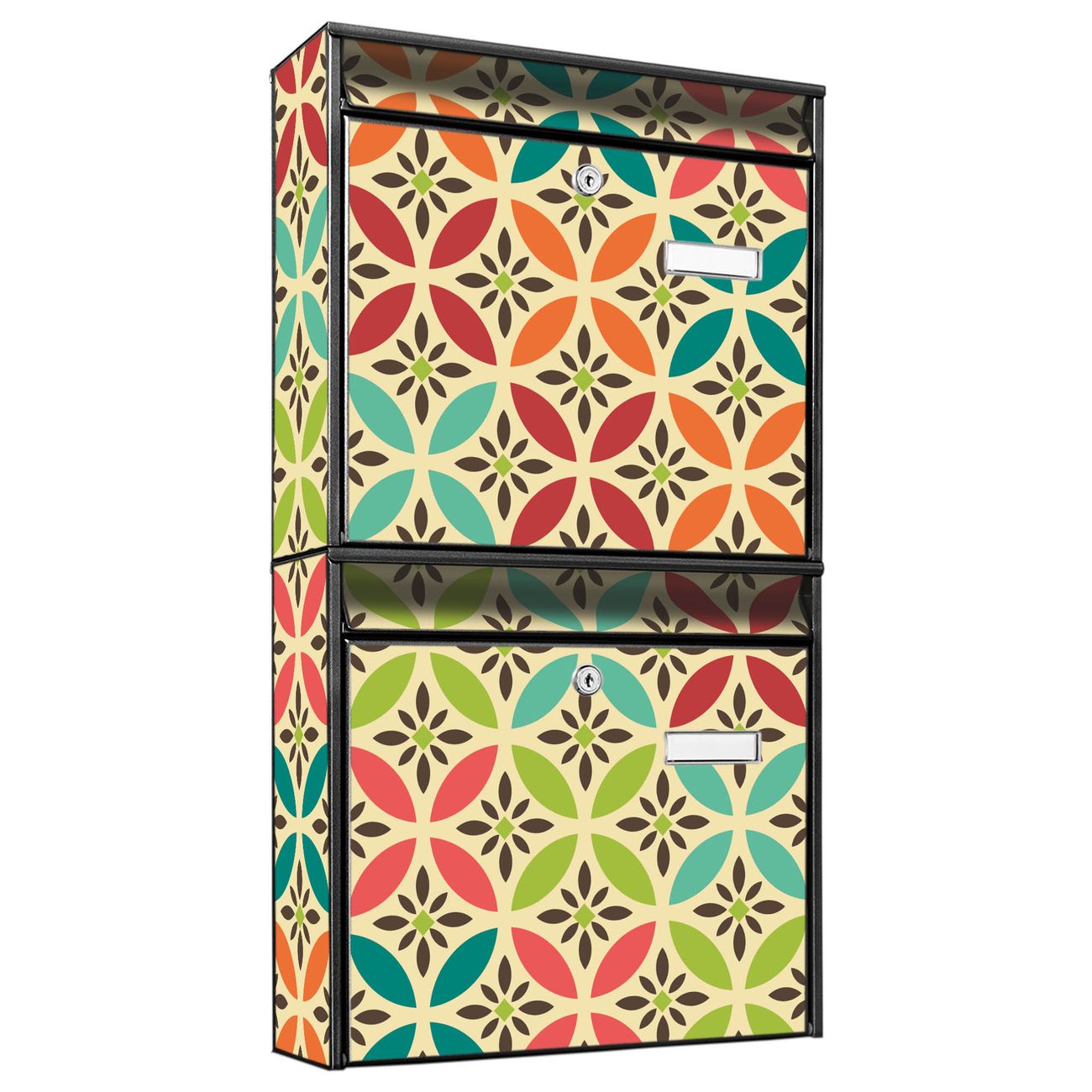 FUNKTION: Die Burg-Wächter Briefkastenanlage mit Motiv Diamant Muster bietet Ihnen ausreichend Fassungsvermögen um auch A4 und C4 Sendungen zu empfangen. Das integrierte Namensschild lässt sich individuell beschriften. Wählen Sie aus den Grundfarben weiß, silber und schwarz. DESIGN: Die 2 Briefkästen haben ein ansprechendes und zeitloses Design, ohne dabei auf Funktionalität zu verzichten. Das Material ist sehr stabil, wetterfest und rostfrei. Durch das Motiv Diamant Muster werden die Postkästen zu einem Blickfang. DETAILS: Die Postkästen bestehen aus verzinktem Stahl der zusätzlich mit Klarlack versiegelt wurde. Die Kästen sind gesamt 64,5cm hoch, 36,2cm breit und 10cm tief. Das Motiv besteht aus einer wetter- und UV-festen Folie, die Ihren Briefkasten zusätzlich vor Kratzern schützt. Die Postkästen werden mit Montagematerial, je einem Namensschild und je zwei Schlüsseln geliefert. NUTZEN: Das Briefkastenset eignet sich für die Wandmontage, die Größe bietet genügend Platz für Sendungen aller Art. Das zeitlose Design sowie die stabile Bauart bieten Ihnen einen treuen Begleiter für Ihre Post. BANJADO: