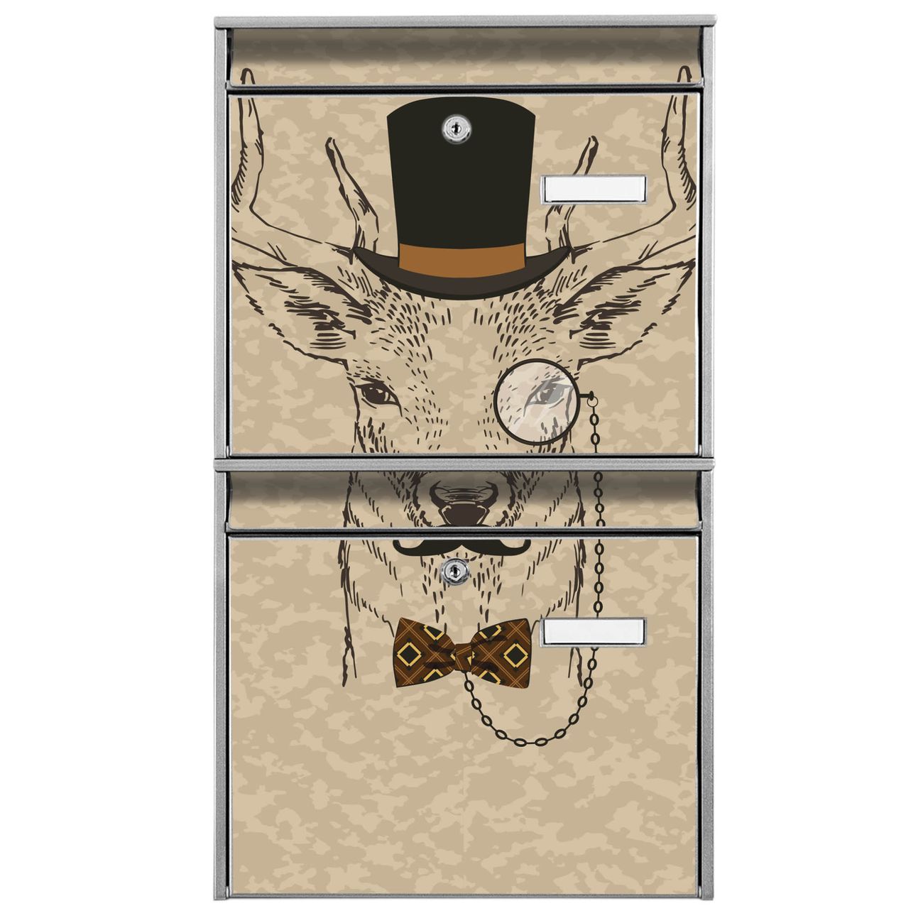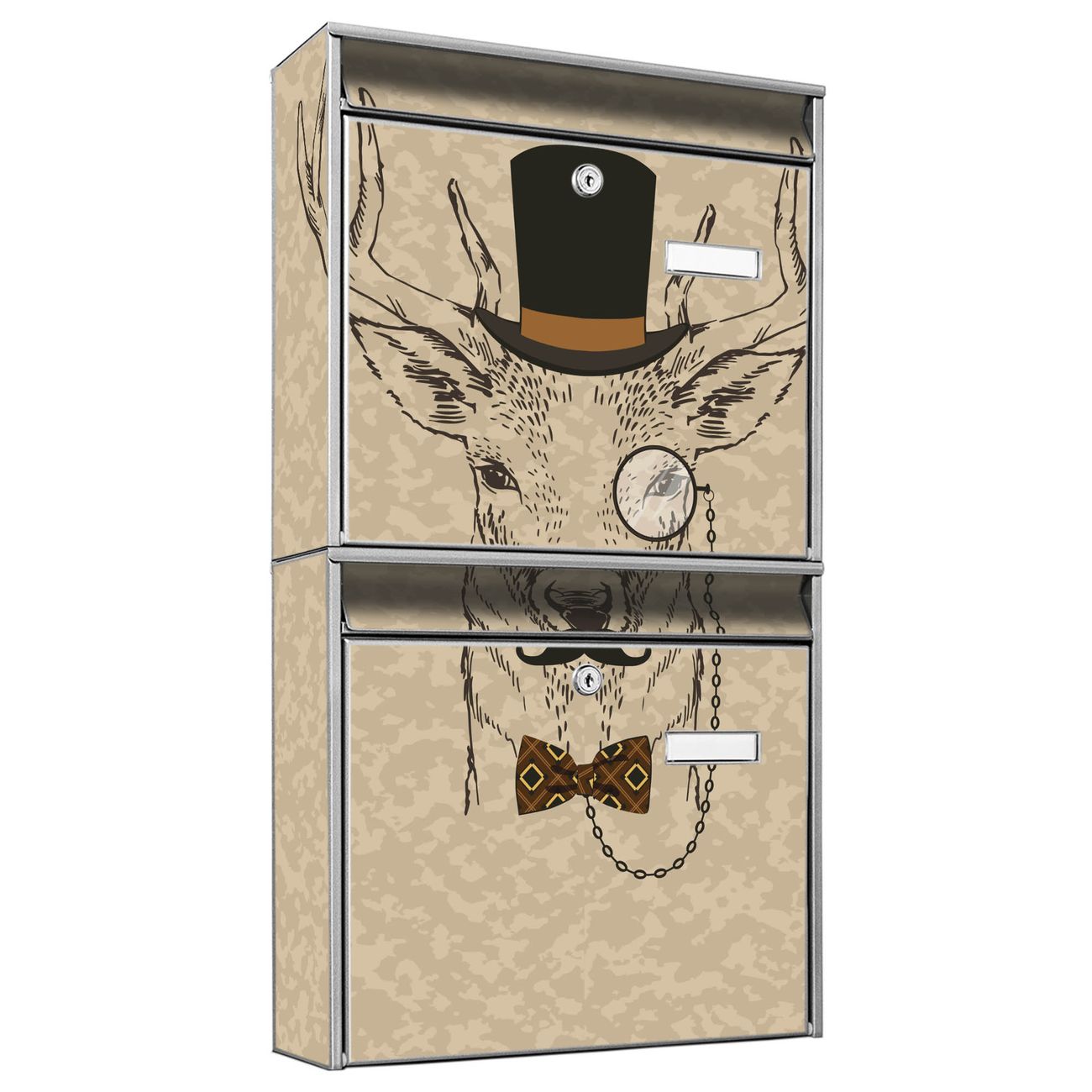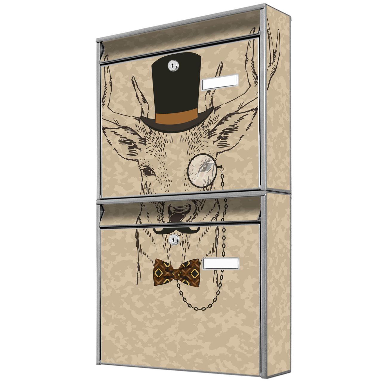 FUNKTION: Die Burg-Wächter Briefkastenanlage mit Motiv Direktor Hirsch bietet Ihnen ausreichend Fassungsvermögen um auch A4 und C4 Sendungen zu empfangen. Das integrierte Namensschild lässt sich individuell beschriften. Wählen Sie aus den Grundfarben weiß, silber und schwarz. DESIGN: Die 2 Briefkästen haben ein ansprechendes und zeitloses Design, ohne dabei auf Funktionalität zu verzichten. Das Material ist sehr stabil, wetterfest und rostfrei. Durch das Motiv Direktor Hirsch werden die Postkästen zu einem Blickfang. DETAILS: Die Postkästen bestehen aus verzinktem Stahl der zusätzlich mit Klarlack versiegelt wurde. Die Kästen sind gesamt 64,5cm hoch, 36,2cm breit und 10cm tief. Das Motiv besteht aus einer wetter- und UV-festen Folie, die Ihren Briefkasten zusätzlich vor Kratzern schützt. Die Postkästen werden mit Montagematerial, je einem Namensschild und je zwei Schlüsseln geliefert. NUTZEN: Das Briefkastenset eignet sich für die Wandmontage, die Größe bietet genügend Platz für Sendungen aller Art. Das zeitlose Design sowie die stabile Bauart bieten Ihnen einen treuen Begleiter für Ihre Post. BANJADO: