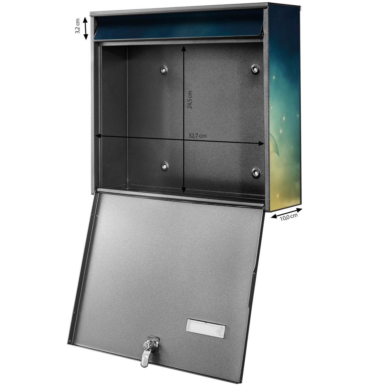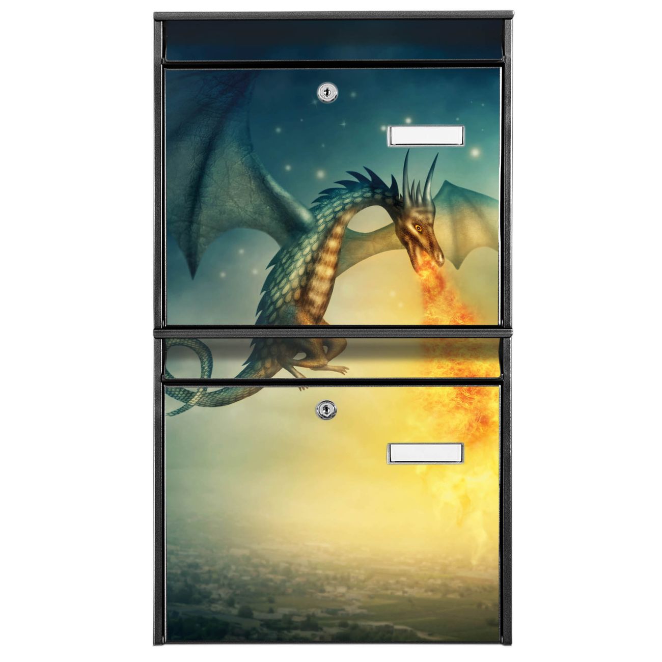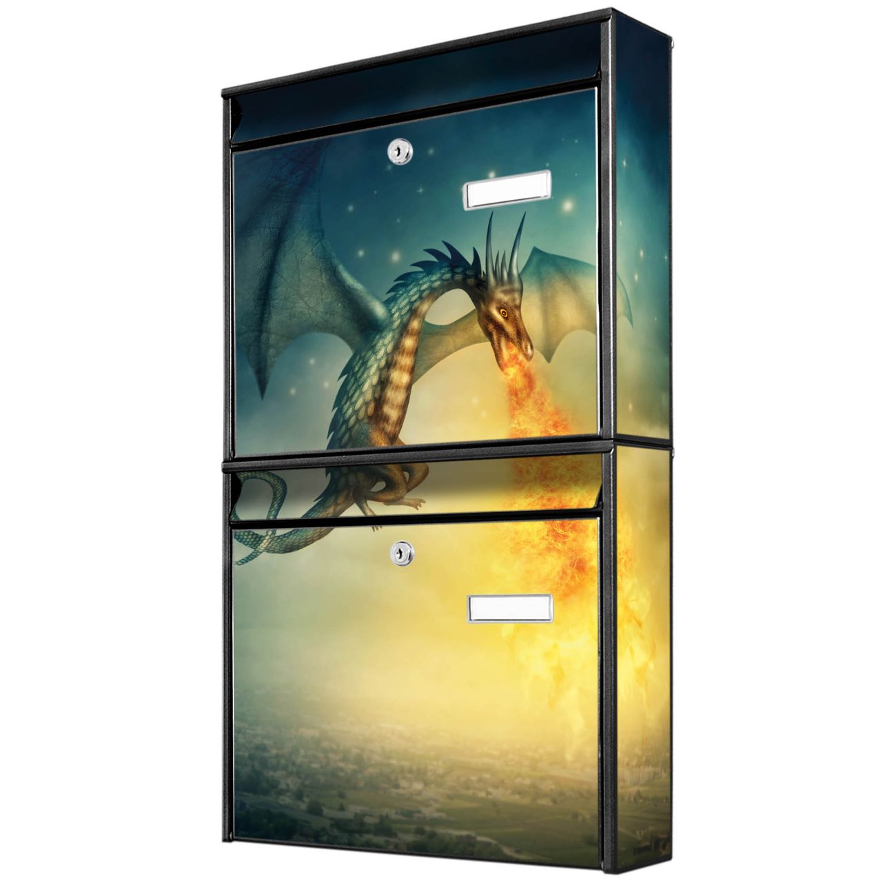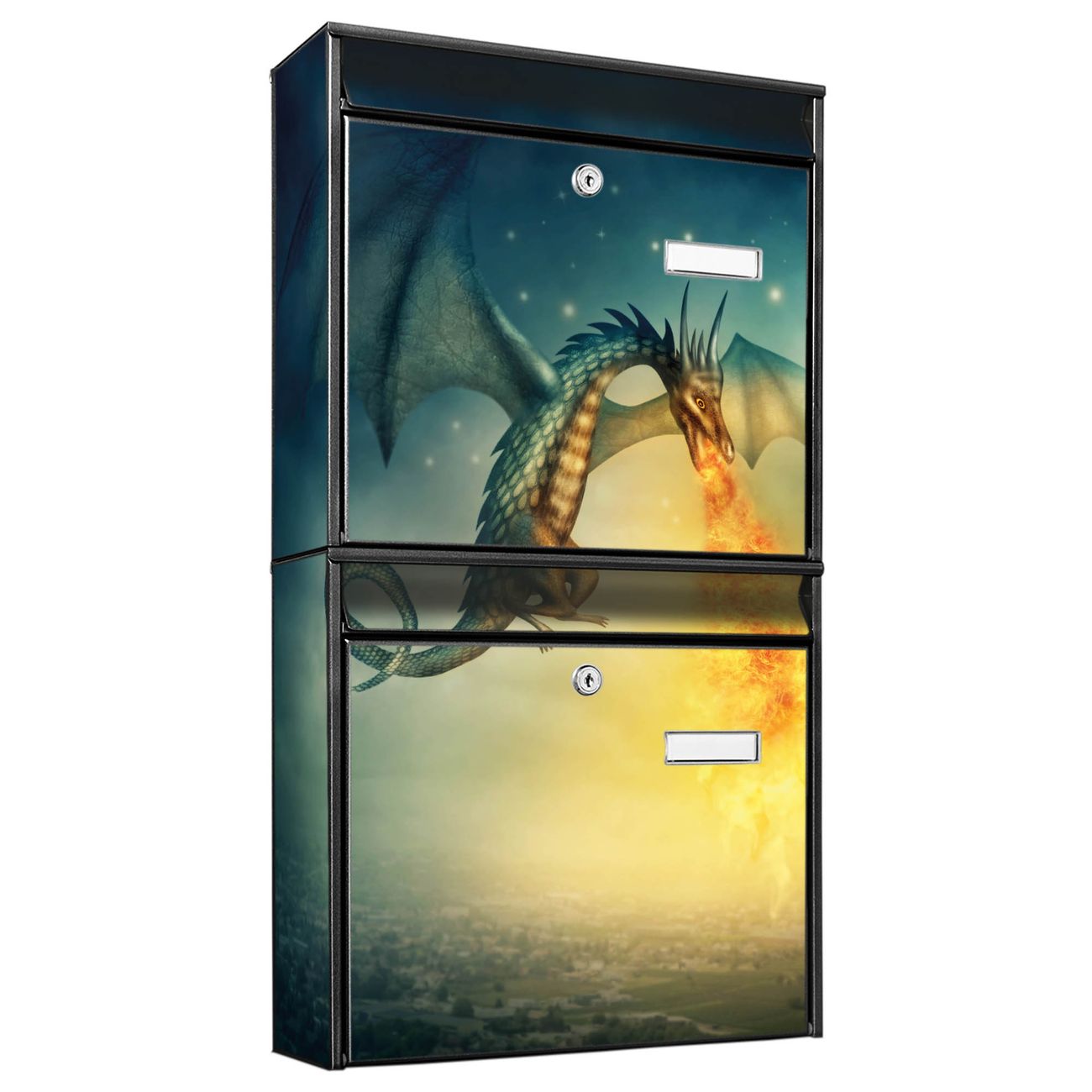 FUNKTION: Die Burg-Wächter Briefkastenanlage mit Motiv Drachen bietet Ihnen ausreichend Fassungsvermögen um auch A4 und C4 Sendungen zu empfangen. Das integrierte Namensschild lässt sich individuell beschriften. Wählen Sie aus den Grundfarben weiß, silber und schwarz. DESIGN: Die 2 Briefkästen haben ein ansprechendes und zeitloses Design, ohne dabei auf Funktionalität zu verzichten. Das Material ist sehr stabil, wetterfest und rostfrei. Durch das Motiv Drachen werden die Postkästen zu einem Blickfang. DETAILS: Die Postkästen bestehen aus verzinktem Stahl der zusätzlich mit Klarlack versiegelt wurde. Die Kästen sind gesamt 64,5cm hoch, 36,2cm breit und 10cm tief. Das Motiv besteht aus einer wetter- und UV-festen Folie, die Ihren Briefkasten zusätzlich vor Kratzern schützt. Die Postkästen werden mit Montagematerial, je einem Namensschild und je zwei Schlüsseln geliefert. NUTZEN: Das Briefkastenset eignet sich für die Wandmontage, die Größe bietet genügend Platz für Sendungen aller Art. Das zeitlose Design sowie die stabile Bauart bieten Ihnen einen treuen Begleiter für Ihre Post. BANJADO: