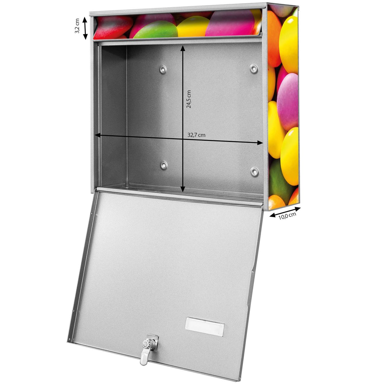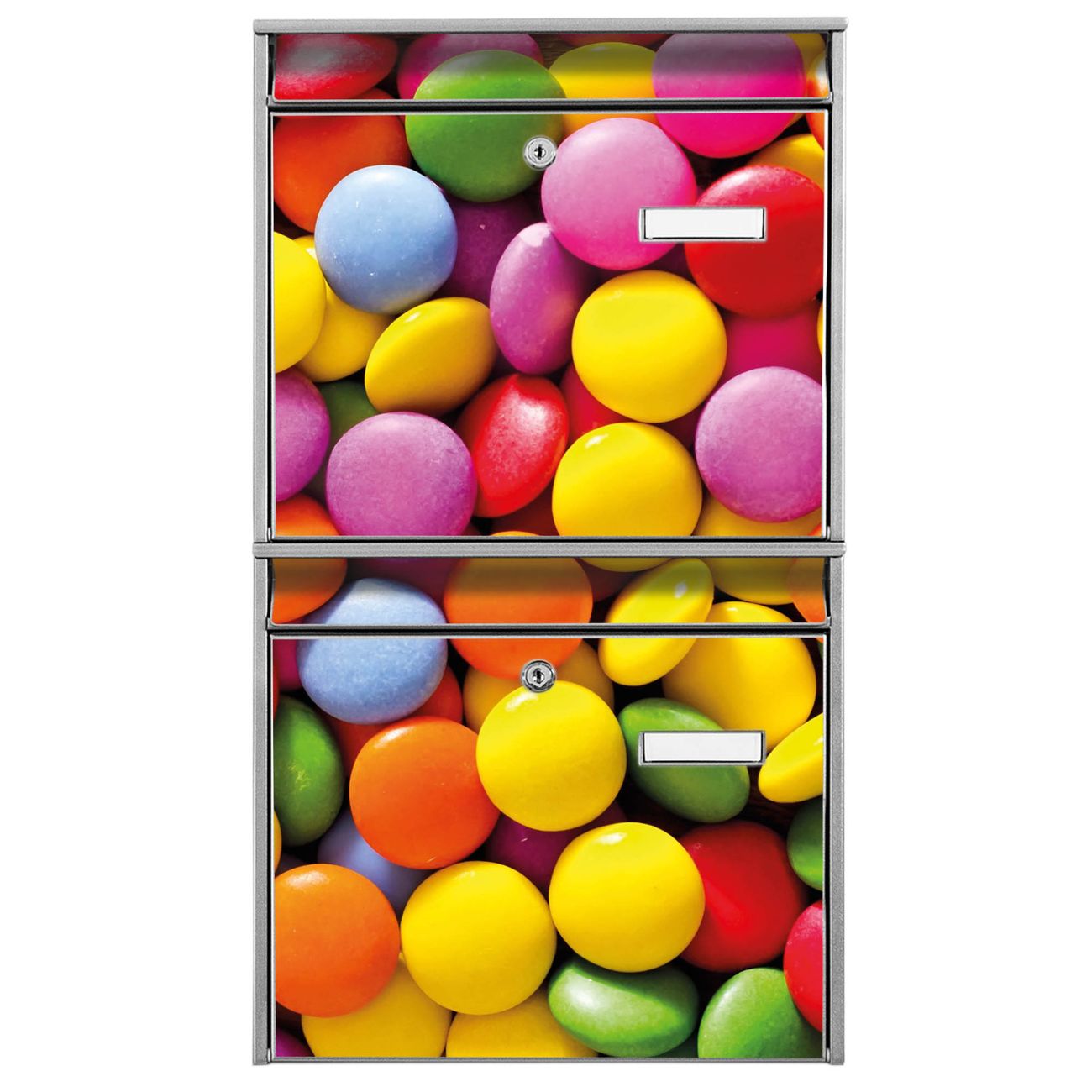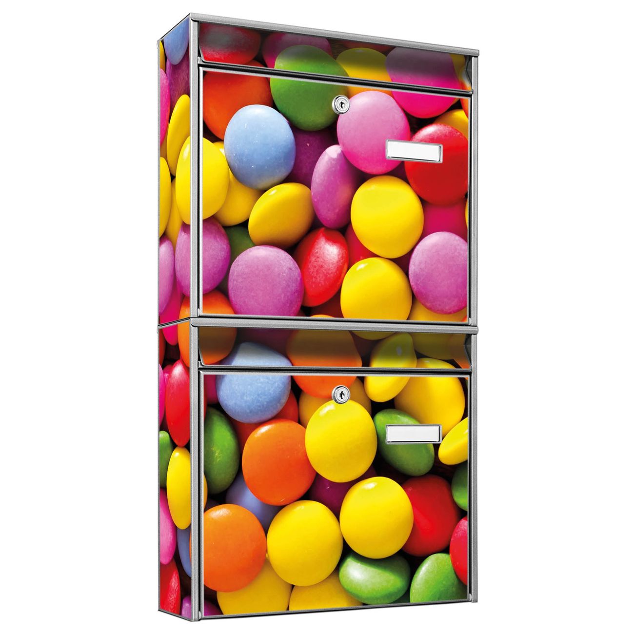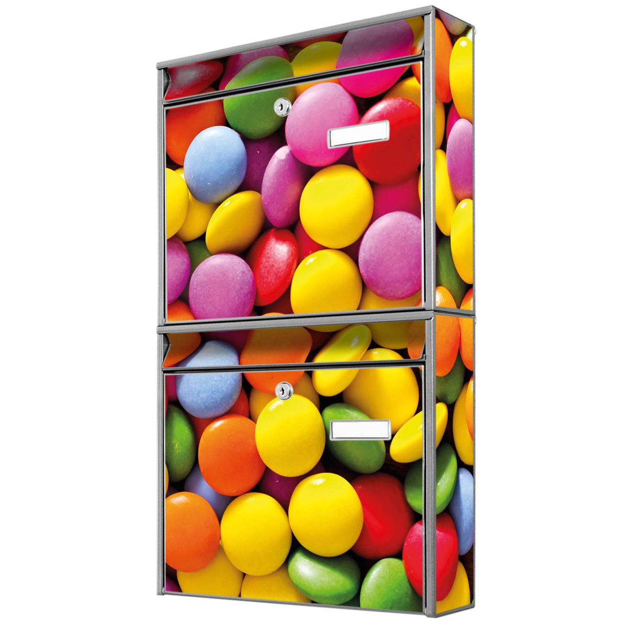FUNKTION: Die Burg-Wächter Briefkastenanlage mit Motiv Dragees bietet Ihnen ausreichend Fassungsvermögen um auch A4 und C4 Sendungen zu empfangen. Das integrierte Namensschild lässt sich individuell beschriften. Wählen Sie aus den Grundfarben weiß, silber und schwarz. DESIGN: Die 2 Briefkästen haben ein ansprechendes und zeitloses Design, ohne dabei auf Funktionalität zu verzichten. Das Material ist sehr stabil, wetterfest und rostfrei. Durch das Motiv Dragees werden die Postkästen zu einem Blickfang. DETAILS: Die Postkästen bestehen aus verzinktem Stahl der zusätzlich mit Klarlack versiegelt wurde. Die Kästen sind gesamt 64,5cm hoch, 36,2cm breit und 10cm tief. Das Motiv besteht aus einer wetter- und UV-festen Folie, die Ihren Briefkasten zusätzlich vor Kratzern schützt. Die Postkästen werden mit Montagematerial, je einem Namensschild und je zwei Schlüsseln geliefert. NUTZEN: Das Briefkastenset eignet sich für die Wandmontage, die Größe bietet genügend Platz für Sendungen aller Art. Das zeitlose Design sowie die stabile Bauart bieten Ihnen einen treuen Begleiter für Ihre Post. BANJADO: