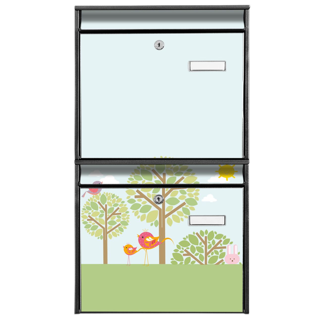 FUNKTION: Die Burg-Wächter Briefkastenanlage mit Motiv Drei Bäume bietet Ihnen ausreichend Fassungsvermögen um auch A4 und C4 Sendungen zu empfangen. Das integrierte Namensschild lässt sich individuell beschriften. Wählen Sie aus den Grundfarben weiß, silber und schwarz. DESIGN: Die 2 Briefkästen haben ein ansprechendes und zeitloses Design, ohne dabei auf Funktionalität zu verzichten. Das Material ist sehr stabil, wetterfest und rostfrei. Durch das Motiv Drei Bäume werden die Postkästen zu einem Blickfang. DETAILS: Die Postkästen bestehen aus verzinktem Stahl der zusätzlich mit Klarlack versiegelt wurde. Die Kästen sind gesamt 64,5cm hoch, 36,2cm breit und 10cm tief. Das Motiv besteht aus einer wetter- und UV-festen Folie, die Ihren Briefkasten zusätzlich vor Kratzern schützt. Die Postkästen werden mit Montagematerial, je einem Namensschild und je zwei Schlüsseln geliefert. NUTZEN: Das Briefkastenset eignet sich für die Wandmontage, die Größe bietet genügend Platz für Sendungen aller Art. Das zeitlose Design sowie die stabile Bauart bieten Ihnen einen treuen Begleiter für Ihre Post. BANJADO: