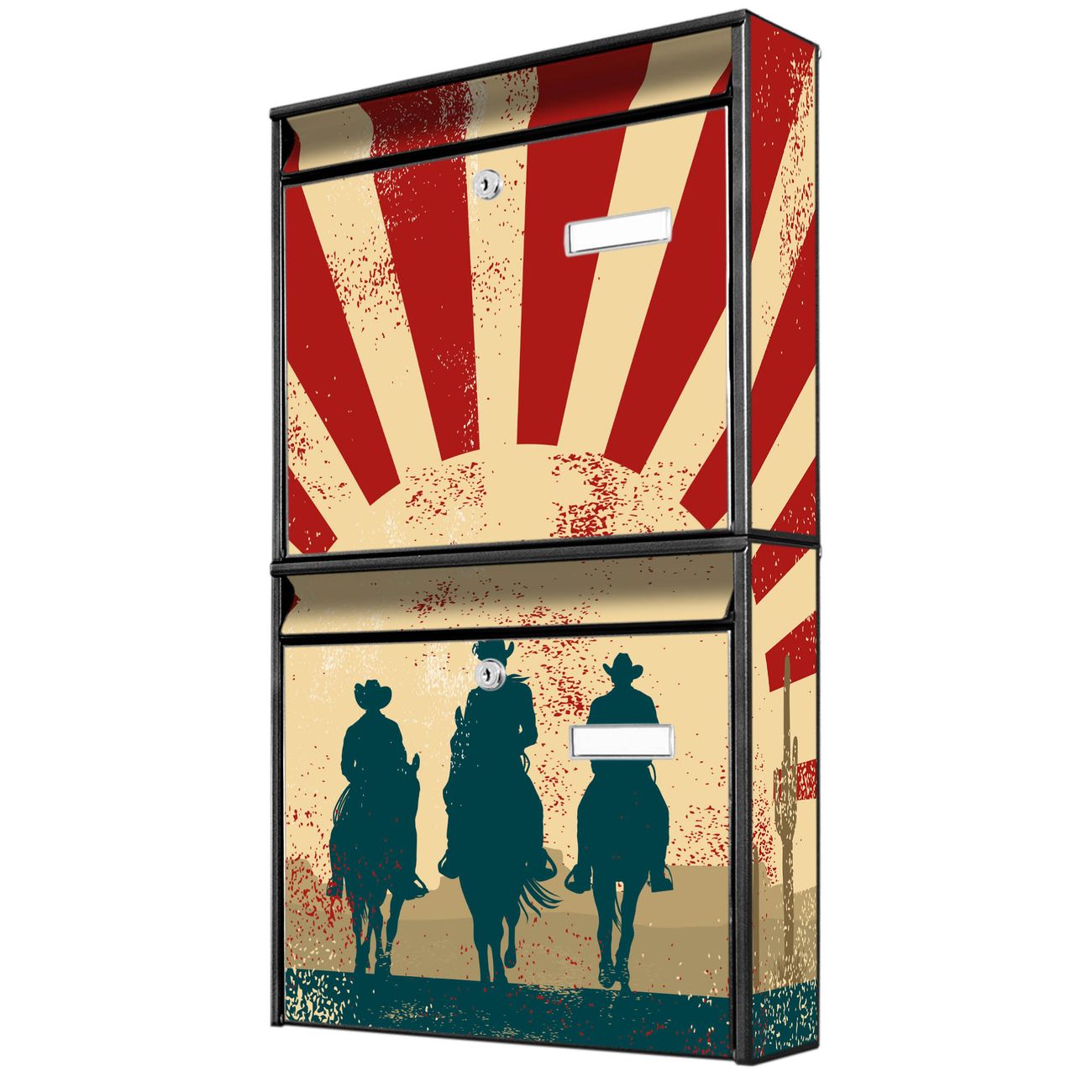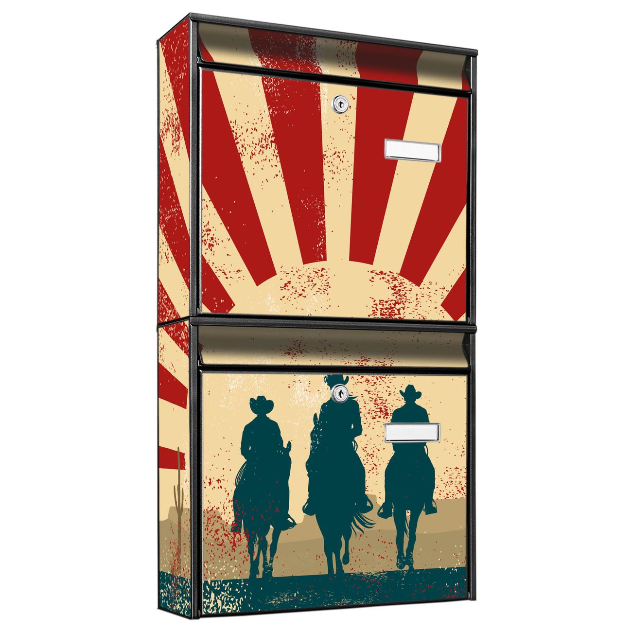 FUNKTION: Die Burg-Wächter Briefkastenanlage mit Motiv Drei Cowboys bietet Ihnen ausreichend Fassungsvermögen um auch A4 und C4 Sendungen zu empfangen. Das integrierte Namensschild lässt sich individuell beschriften. Wählen Sie aus den Grundfarben weiß, silber und schwarz. DESIGN: Die 2 Briefkästen haben ein ansprechendes und zeitloses Design, ohne dabei auf Funktionalität zu verzichten. Das Material ist sehr stabil, wetterfest und rostfrei. Durch das Motiv Drei Cowboys werden die Postkästen zu einem Blickfang. DETAILS: Die Postkästen bestehen aus verzinktem Stahl der zusätzlich mit Klarlack versiegelt wurde. Die Kästen sind gesamt 64,5cm hoch, 36,2cm breit und 10cm tief. Das Motiv besteht aus einer wetter- und UV-festen Folie, die Ihren Briefkasten zusätzlich vor Kratzern schützt. Die Postkästen werden mit Montagematerial, je einem Namensschild und je zwei Schlüsseln geliefert. NUTZEN: Das Briefkastenset eignet sich für die Wandmontage, die Größe bietet genügend Platz für Sendungen aller Art. Das zeitlose Design sowie die stabile Bauart bieten Ihnen einen treuen Begleiter für Ihre Post. BANJADO: