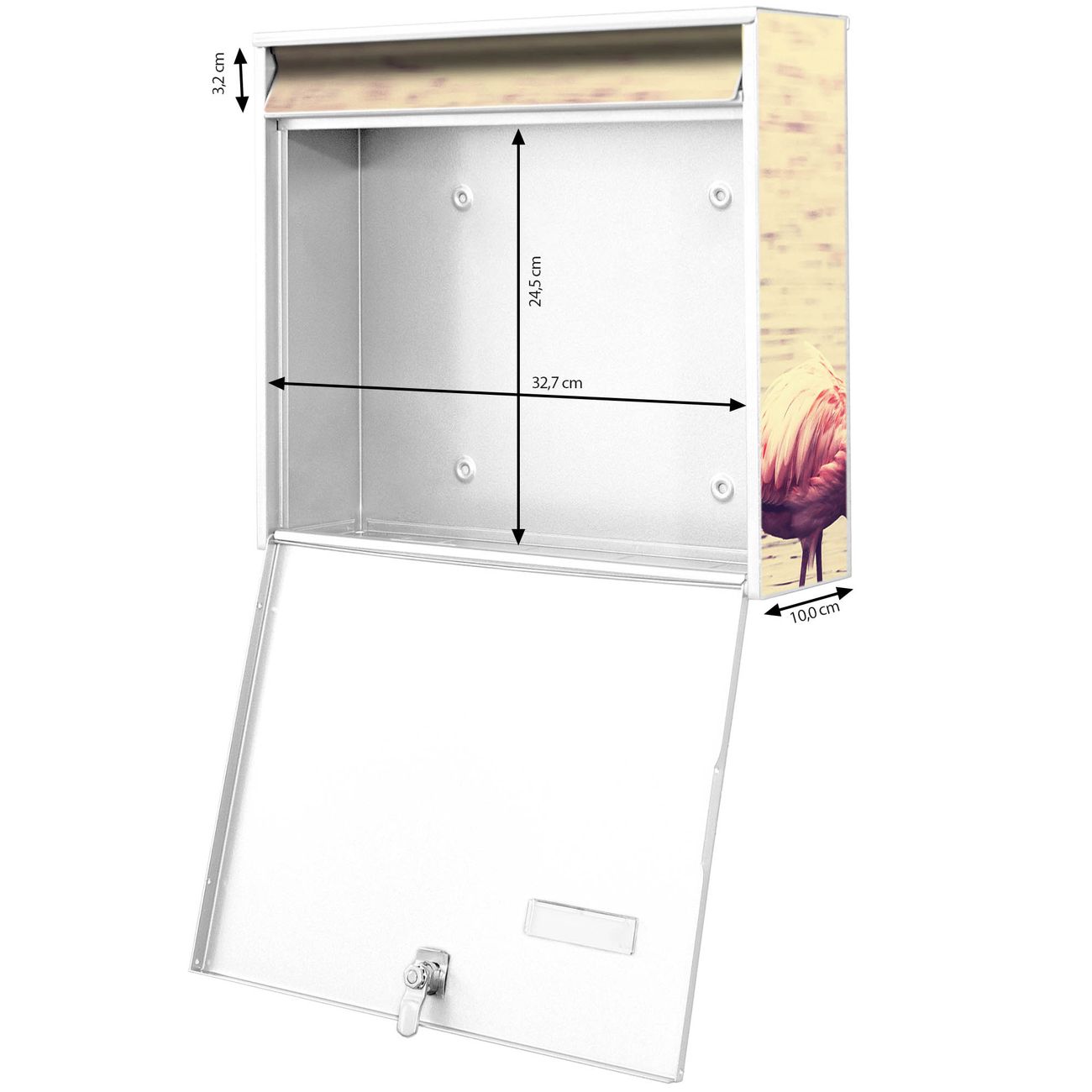 FUNKTION: Die Burg-Wächter Briefkastenanlage mit Motiv Drei Flamnigos bietet Ihnen ausreichend Fassungsvermögen um auch A4 und C4 Sendungen zu empfangen. Das integrierte Namensschild lässt sich individuell beschriften. Wählen Sie aus den Grundfarben weiß, silber und schwarz. DESIGN: Die 2 Briefkästen haben ein ansprechendes und zeitloses Design, ohne dabei auf Funktionalität zu verzichten. Das Material ist sehr stabil, wetterfest und rostfrei. Durch das Motiv Drei Flamnigos werden die Postkästen zu einem Blickfang. DETAILS: Die Postkästen bestehen aus verzinktem Stahl der zusätzlich mit Klarlack versiegelt wurde. Die Kästen sind gesamt 64,5cm hoch, 36,2cm breit und 10cm tief. Das Motiv besteht aus einer wetter- und UV-festen Folie, die Ihren Briefkasten zusätzlich vor Kratzern schützt. Die Postkästen werden mit Montagematerial, je einem Namensschild und je zwei Schlüsseln geliefert. NUTZEN: Das Briefkastenset eignet sich für die Wandmontage, die Größe bietet genügend Platz für Sendungen aller Art. Das zeitlose Design sowie die stabile Bauart bieten Ihnen einen treuen Begleiter für Ihre Post. BANJADO:
