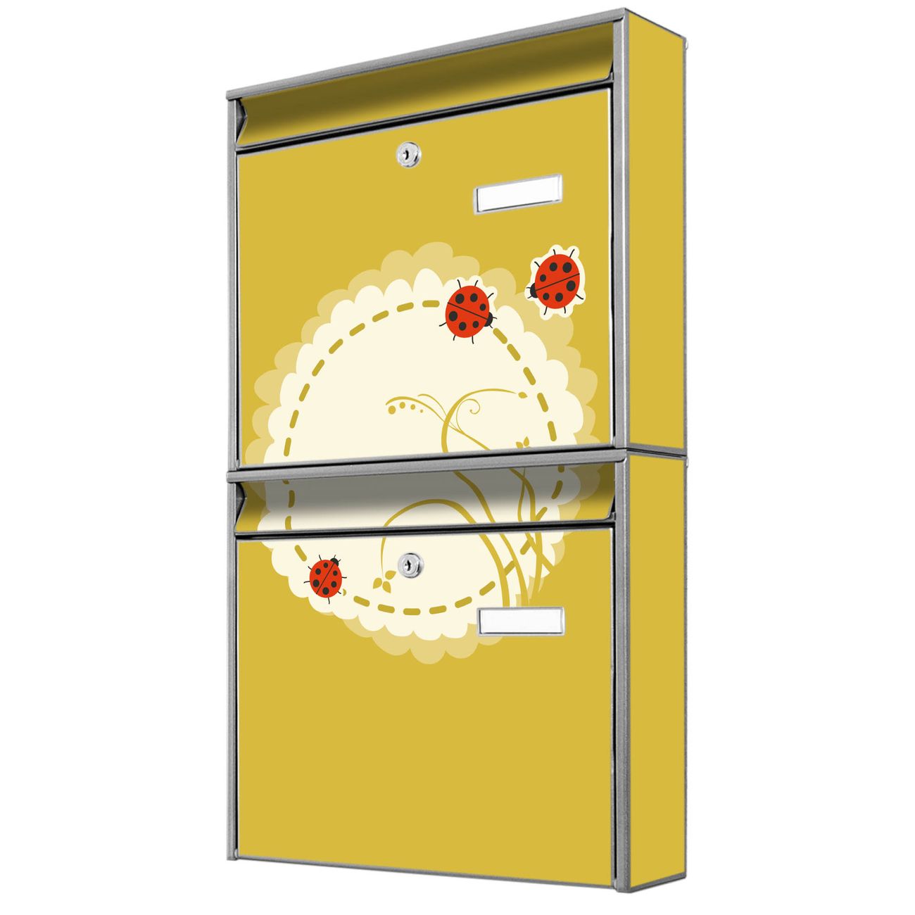FUNKTION: Die Burg-Wächter Briefkastenanlage mit Motiv Drei Marienkäfer bietet Ihnen ausreichend Fassungsvermögen um auch A4 und C4 Sendungen zu empfangen. Das integrierte Namensschild lässt sich individuell beschriften. Wählen Sie aus den Grundfarben weiß, silber und schwarz. DESIGN: Die 2 Briefkästen haben ein ansprechendes und zeitloses Design, ohne dabei auf Funktionalität zu verzichten. Das Material ist sehr stabil, wetterfest und rostfrei. Durch das Motiv Drei Marienkäfer werden die Postkästen zu einem Blickfang. DETAILS: Die Postkästen bestehen aus verzinktem Stahl der zusätzlich mit Klarlack versiegelt wurde. Die Kästen sind gesamt 64,5cm hoch, 36,2cm breit und 10cm tief. Das Motiv besteht aus einer wetter- und UV-festen Folie, die Ihren Briefkasten zusätzlich vor Kratzern schützt. Die Postkästen werden mit Montagematerial, je einem Namensschild und je zwei Schlüsseln geliefert. NUTZEN: Das Briefkastenset eignet sich für die Wandmontage, die Größe bietet genügend Platz für Sendungen aller Art. Das zeitlose Design sowie die stabile Bauart bieten Ihnen einen treuen Begleiter für Ihre Post. BANJADO: