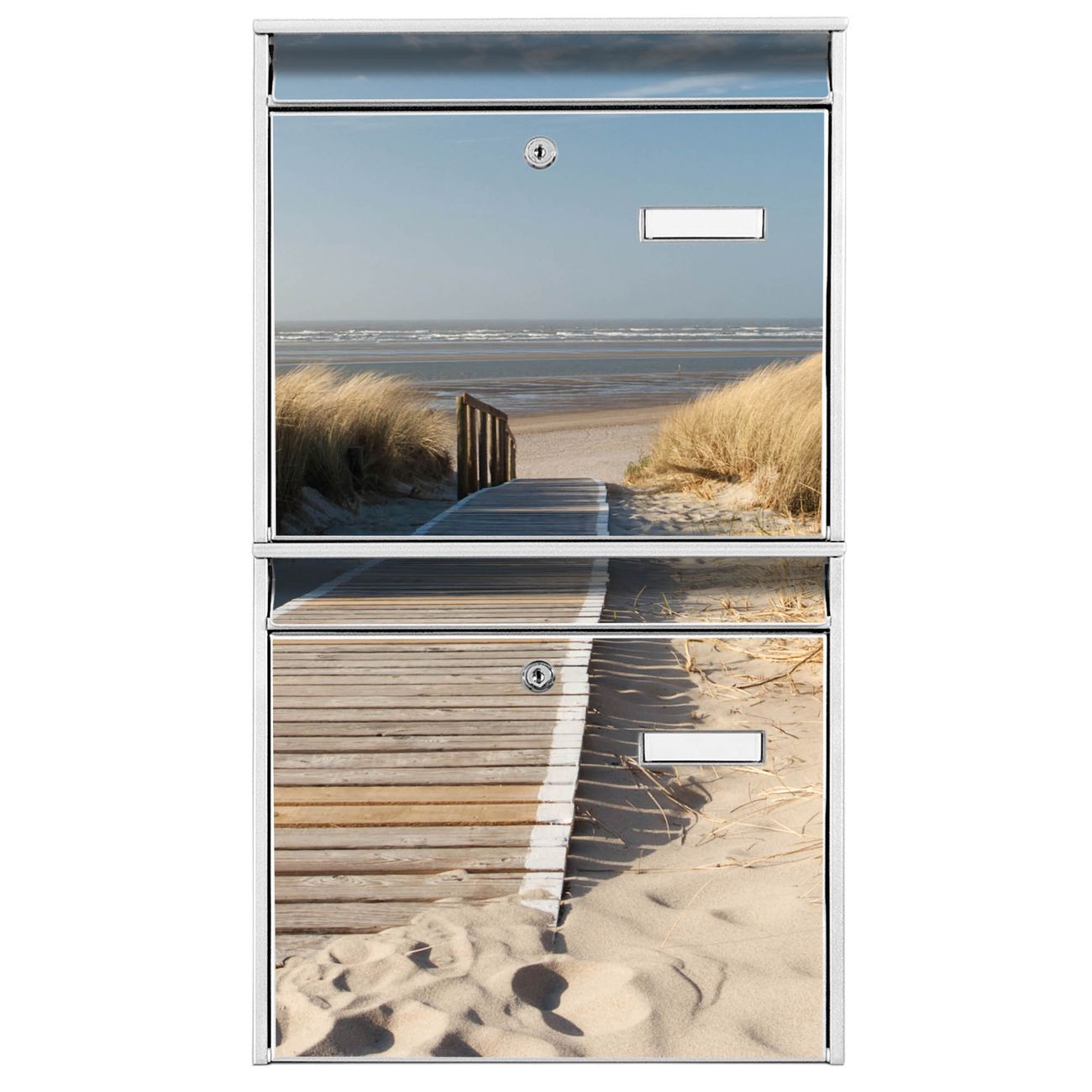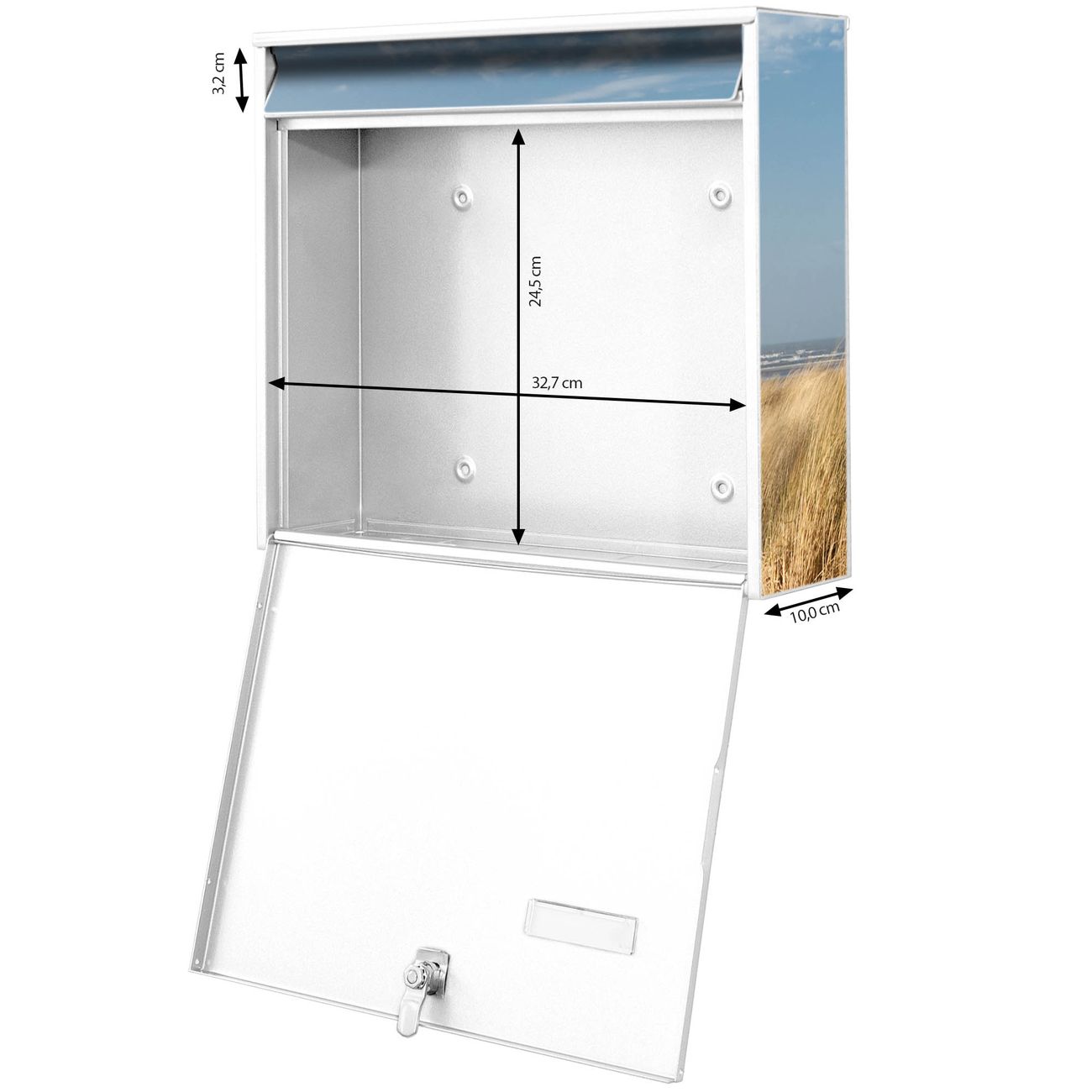 FUNKTION: Die Burg-Wächter Briefkastenanlage mit Motiv Dünen bietet Ihnen ausreichend Fassungsvermögen um auch A4 und C4 Sendungen zu empfangen. Das integrierte Namensschild lässt sich individuell beschriften. Wählen Sie aus den Grundfarben weiß, silber und schwarz. DESIGN: Die 2 Briefkästen haben ein ansprechendes und zeitloses Design, ohne dabei auf Funktionalität zu verzichten. Das Material ist sehr stabil, wetterfest und rostfrei. Durch das Motiv Dünen werden die Postkästen zu einem Blickfang. DETAILS: Die Postkästen bestehen aus verzinktem Stahl der zusätzlich mit Klarlack versiegelt wurde. Die Kästen sind gesamt 64,5cm hoch, 36,2cm breit und 10cm tief. Das Motiv besteht aus einer wetter- und UV-festen Folie, die Ihren Briefkasten zusätzlich vor Kratzern schützt. Die Postkästen werden mit Montagematerial, je einem Namensschild und je zwei Schlüsseln geliefert. NUTZEN: Das Briefkastenset eignet sich für die Wandmontage, die Größe bietet genügend Platz für Sendungen aller Art. Das zeitlose Design sowie die stabile Bauart bieten Ihnen einen treuen Begleiter für Ihre Post. BANJADO: