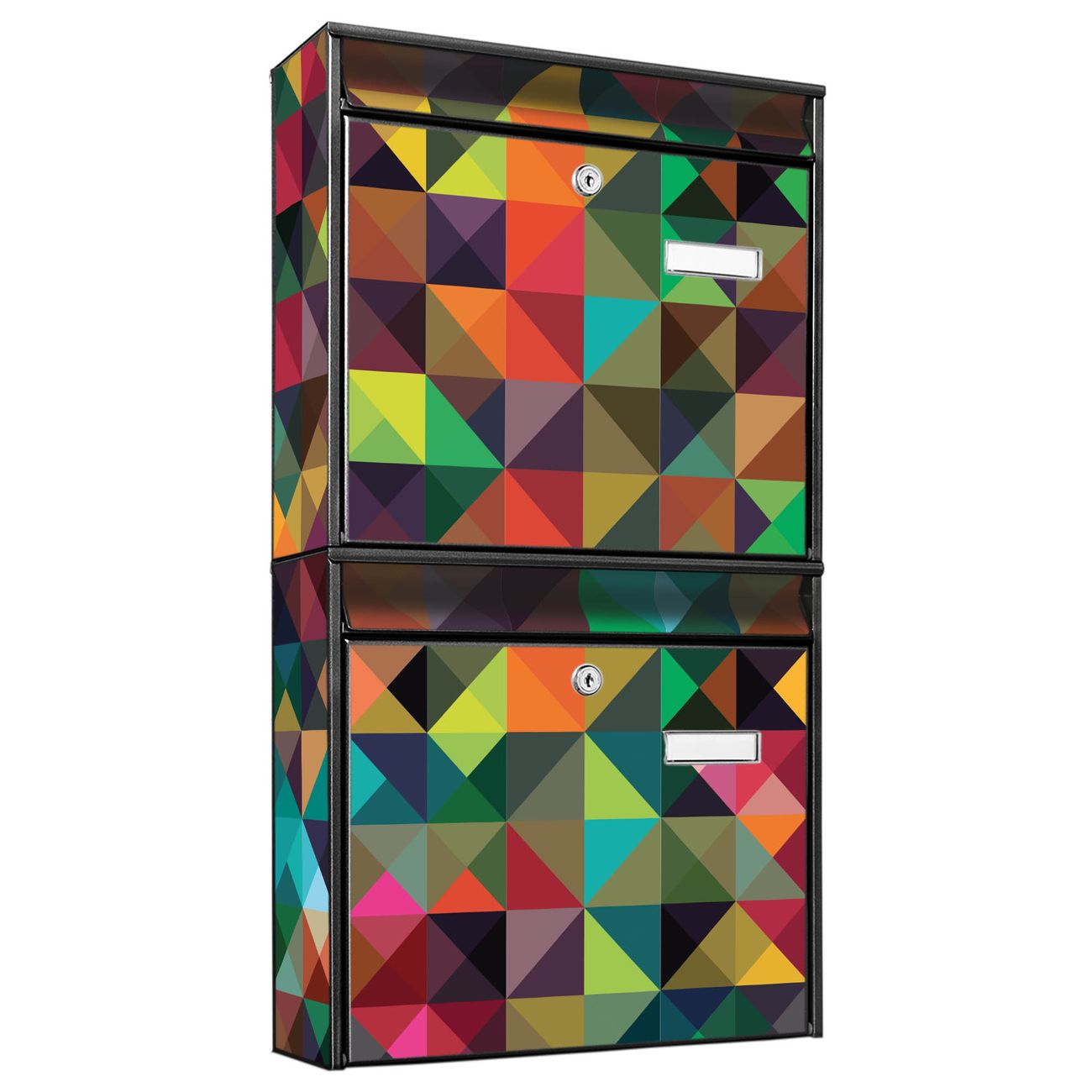 FUNKTION: Die Burg-Wächter Briefkastenanlage mit Motiv Dunkles Kaleidoskop bietet Ihnen ausreichend Fassungsvermögen um auch A4 und C4 Sendungen zu empfangen. Das integrierte Namensschild lässt sich individuell beschriften. Wählen Sie aus den Grundfarben weiß, silber und schwarz. DESIGN: Die 2 Briefkästen haben ein ansprechendes und zeitloses Design, ohne dabei auf Funktionalität zu verzichten. Das Material ist sehr stabil, wetterfest und rostfrei. Durch das Motiv Dunkles Kaleidoskop werden die Postkästen zu einem Blickfang. DETAILS: Die Postkästen bestehen aus verzinktem Stahl der zusätzlich mit Klarlack versiegelt wurde. Die Kästen sind gesamt 64,5cm hoch, 36,2cm breit und 10cm tief. Das Motiv besteht aus einer wetter- und UV-festen Folie, die Ihren Briefkasten zusätzlich vor Kratzern schützt. Die Postkästen werden mit Montagematerial, je einem Namensschild und je zwei Schlüsseln geliefert. NUTZEN: Das Briefkastenset eignet sich für die Wandmontage, die Größe bietet genügend Platz für Sendungen aller Art. Das zeitlose Design sowie die stabile Bauart bieten Ihnen einen treuen Begleiter für Ihre Post. BANJADO: