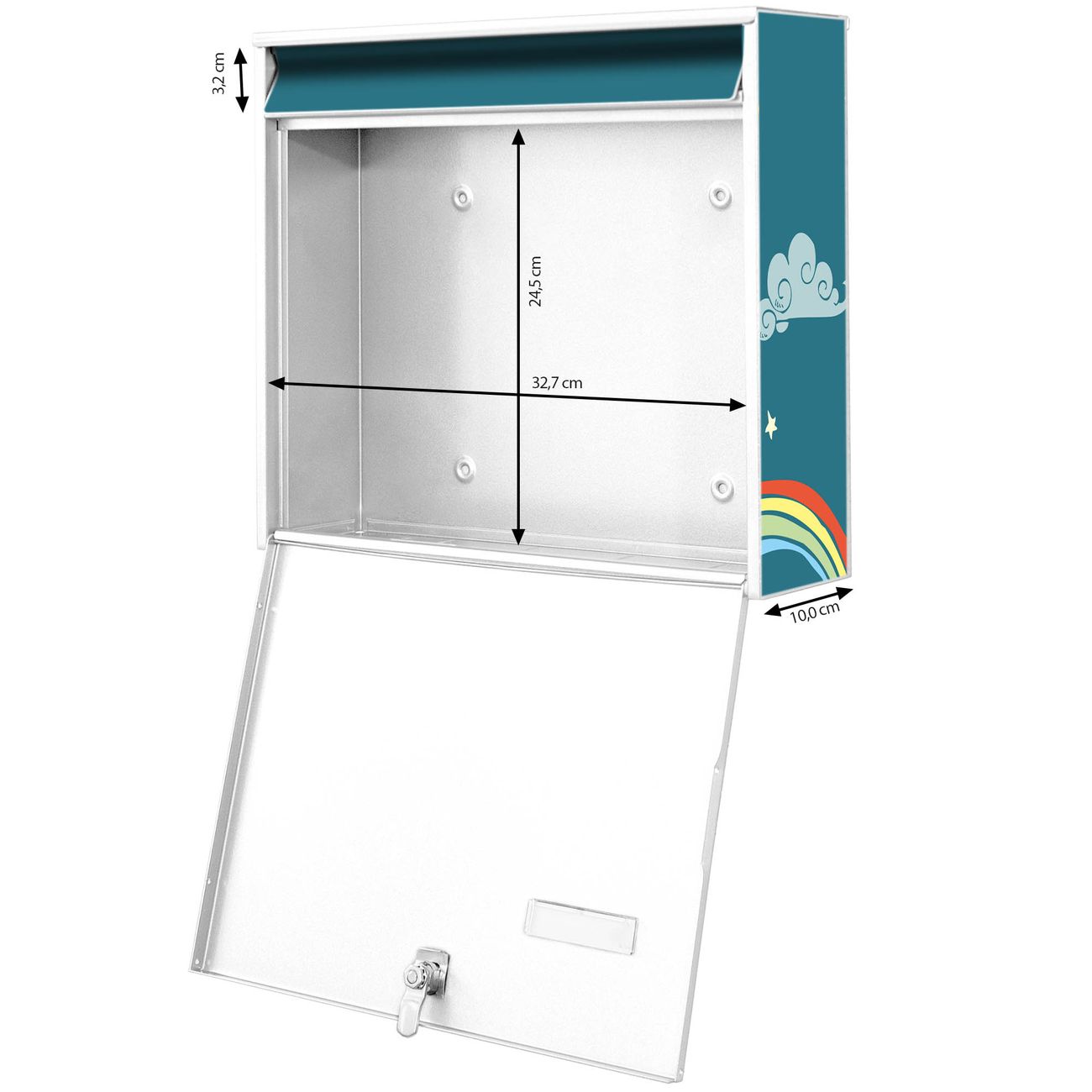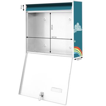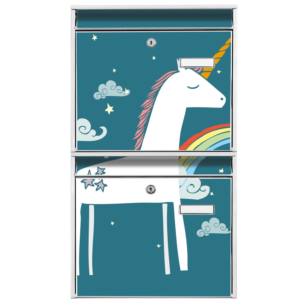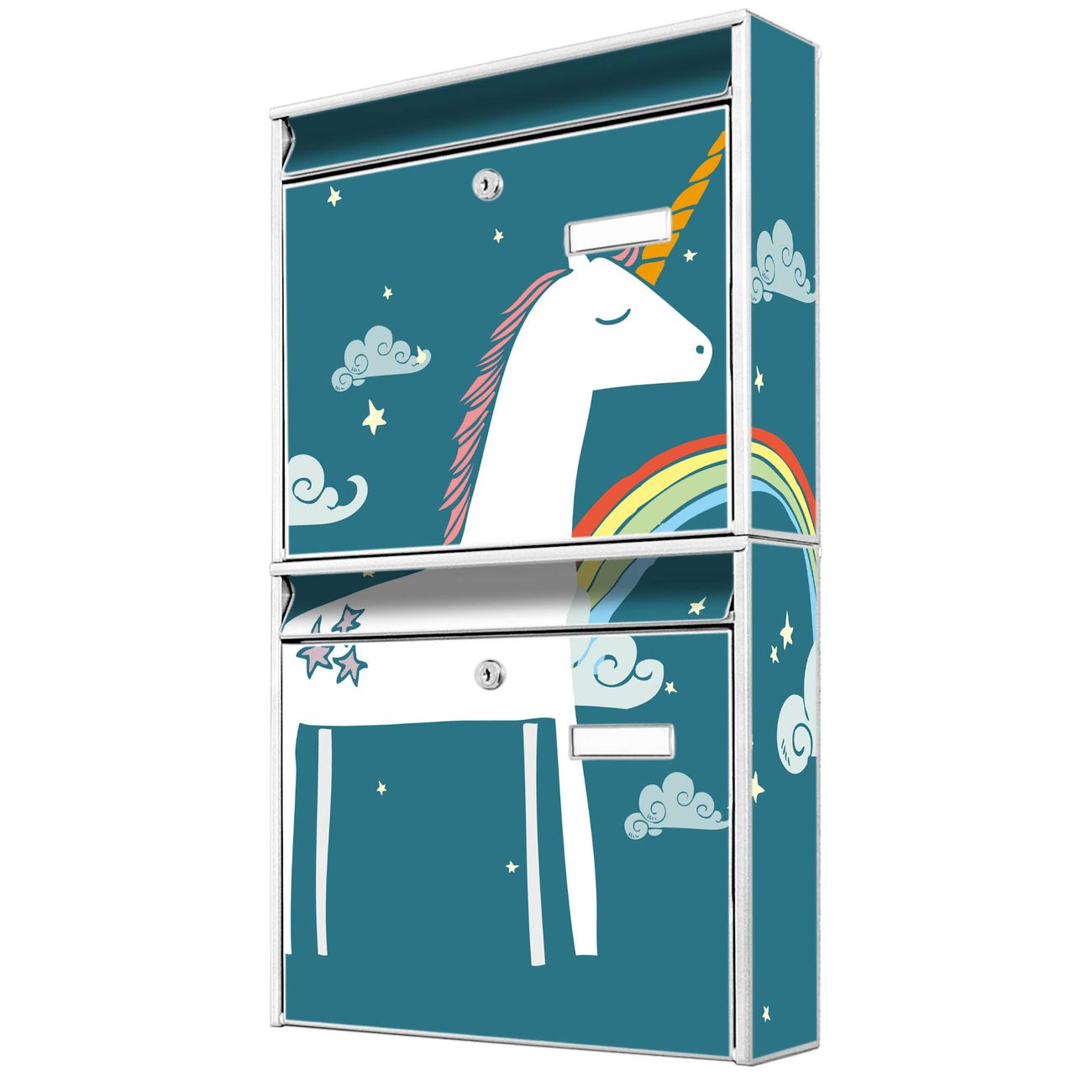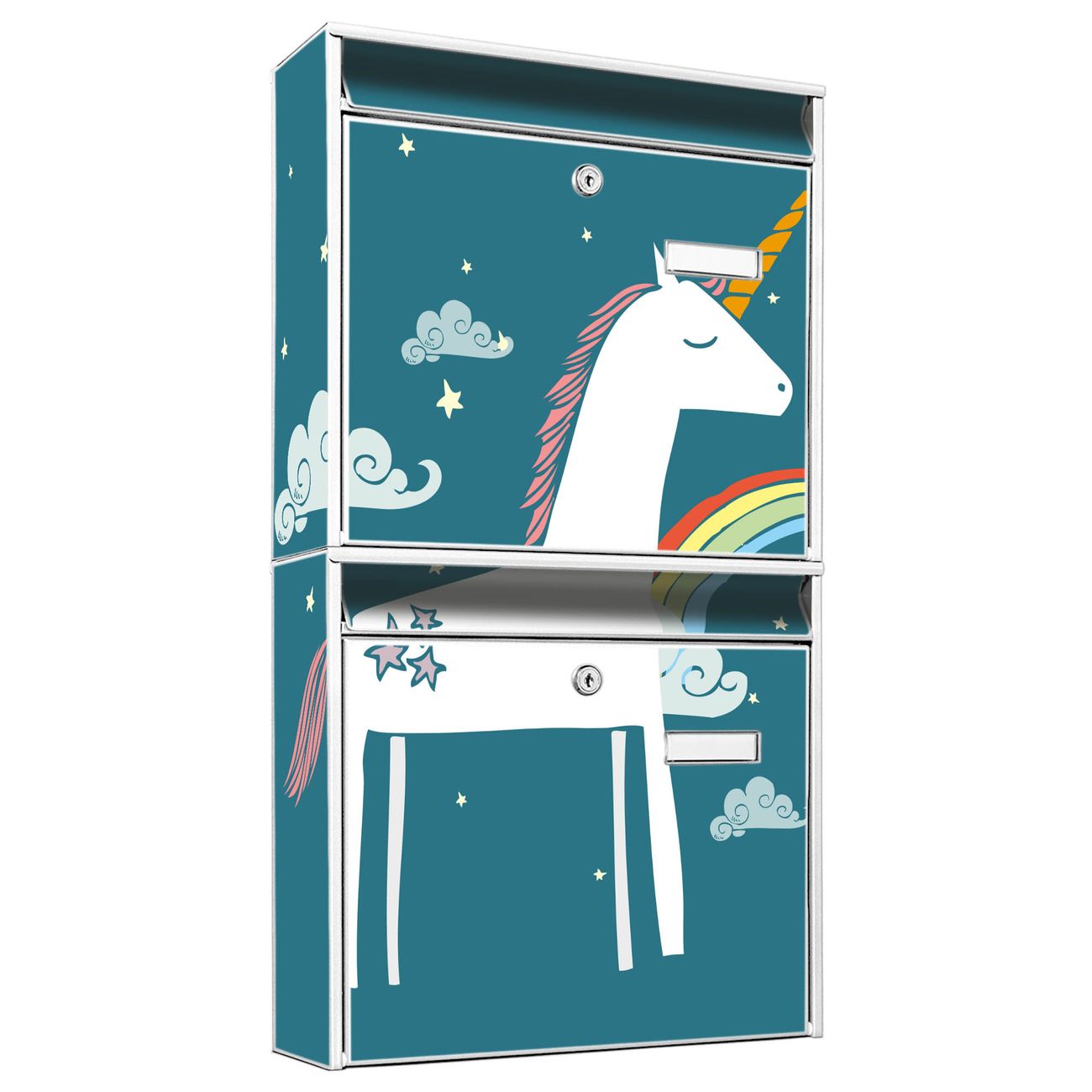 FUNKTION: Die Burg-Wächter Briefkastenanlage mit Motiv Einhorn bietet Ihnen ausreichend Fassungsvermögen um auch A4 und C4 Sendungen zu empfangen. Das integrierte Namensschild lässt sich individuell beschriften. Wählen Sie aus den Grundfarben weiß, silber und schwarz. DESIGN: Die 2 Briefkästen haben ein ansprechendes und zeitloses Design, ohne dabei auf Funktionalität zu verzichten. Das Material ist sehr stabil, wetterfest und rostfrei. Durch das Motiv Einhorn werden die Postkästen zu einem Blickfang. DETAILS: Die Postkästen bestehen aus verzinktem Stahl der zusätzlich mit Klarlack versiegelt wurde. Die Kästen sind gesamt 64,5cm hoch, 36,2cm breit und 10cm tief. Das Motiv besteht aus einer wetter- und UV-festen Folie, die Ihren Briefkasten zusätzlich vor Kratzern schützt. Die Postkästen werden mit Montagematerial, je einem Namensschild und je zwei Schlüsseln geliefert. NUTZEN: Das Briefkastenset eignet sich für die Wandmontage, die Größe bietet genügend Platz für Sendungen aller Art. Das zeitlose Design sowie die stabile Bauart bieten Ihnen einen treuen Begleiter für Ihre Post. BANJADO:
