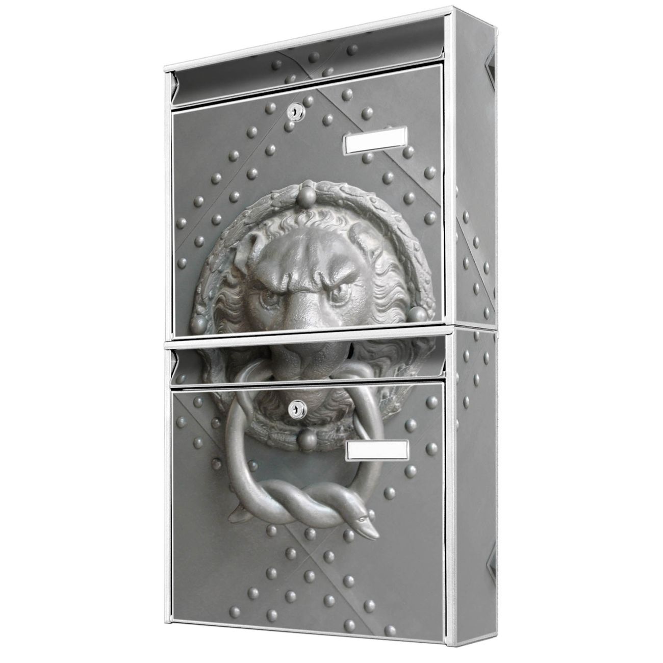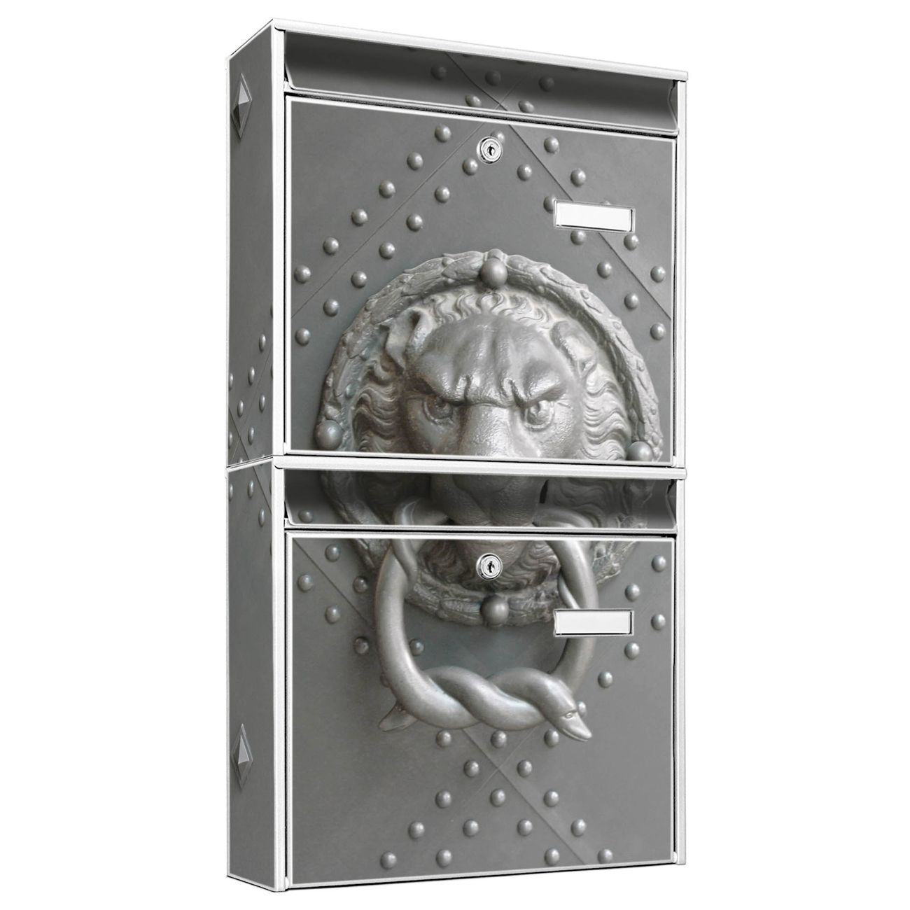 FUNKTION: Die Burg-Wächter Briefkastenanlage mit Motiv Eisentor bietet Ihnen ausreichend Fassungsvermögen um auch A4 und C4 Sendungen zu empfangen. Das integrierte Namensschild lässt sich individuell beschriften. Wählen Sie aus den Grundfarben weiß, silber und schwarz. DESIGN: Die 2 Briefkästen haben ein ansprechendes und zeitloses Design, ohne dabei auf Funktionalität zu verzichten. Das Material ist sehr stabil, wetterfest und rostfrei. Durch das Motiv Eisentor werden die Postkästen zu einem Blickfang. DETAILS: Die Postkästen bestehen aus verzinktem Stahl der zusätzlich mit Klarlack versiegelt wurde. Die Kästen sind gesamt 64,5cm hoch, 36,2cm breit und 10cm tief. Das Motiv besteht aus einer wetter- und UV-festen Folie, die Ihren Briefkasten zusätzlich vor Kratzern schützt. Die Postkästen werden mit Montagematerial, je einem Namensschild und je zwei Schlüsseln geliefert. NUTZEN: Das Briefkastenset eignet sich für die Wandmontage, die Größe bietet genügend Platz für Sendungen aller Art. Das zeitlose Design sowie die stabile Bauart bieten Ihnen einen treuen Begleiter für Ihre Post. BANJADO: