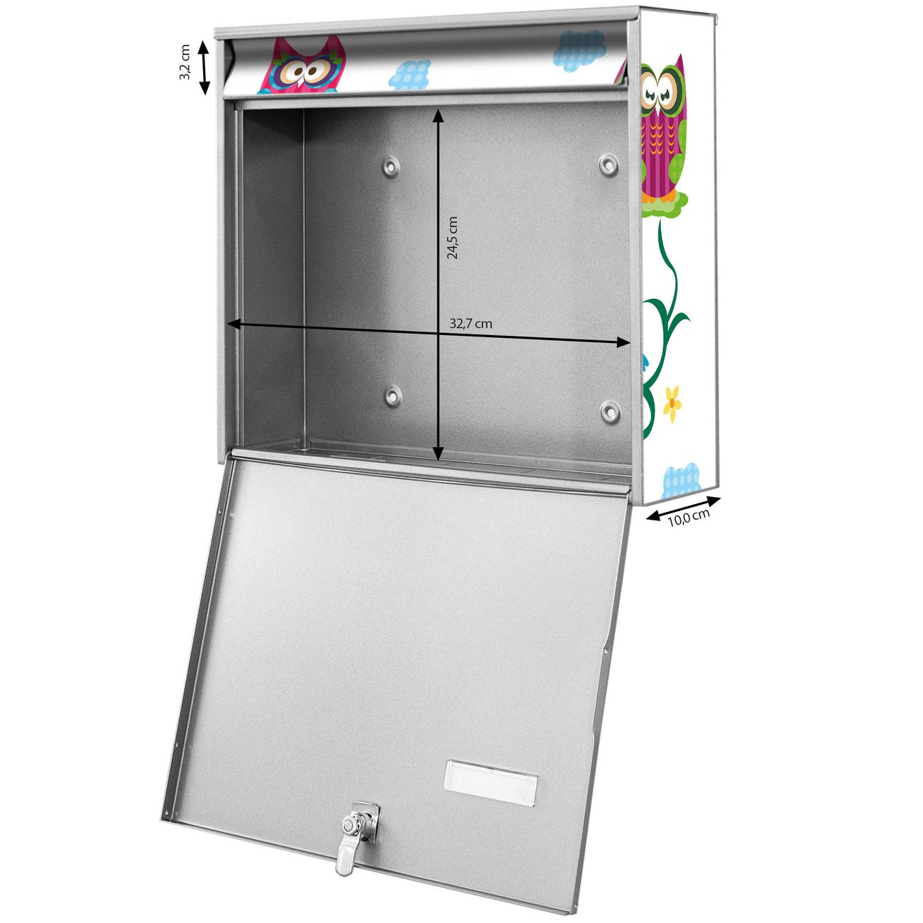 FUNKTION: Die Burg-Wächter Briefkastenanlage mit Motiv Eulenfamilie bietet Ihnen ausreichend Fassungsvermögen um auch A4 und C4 Sendungen zu empfangen. Das integrierte Namensschild lässt sich individuell beschriften. Wählen Sie aus den Grundfarben weiß, silber und schwarz. DESIGN: Die 2 Briefkästen haben ein ansprechendes und zeitloses Design, ohne dabei auf Funktionalität zu verzichten. Das Material ist sehr stabil, wetterfest und rostfrei. Durch das Motiv Eulenfamilie werden die Postkästen zu einem Blickfang. DETAILS: Die Postkästen bestehen aus verzinktem Stahl der zusätzlich mit Klarlack versiegelt wurde. Die Kästen sind gesamt 64,5cm hoch, 36,2cm breit und 10cm tief. Das Motiv besteht aus einer wetter- und UV-festen Folie, die Ihren Briefkasten zusätzlich vor Kratzern schützt. Die Postkästen werden mit Montagematerial, je einem Namensschild und je zwei Schlüsseln geliefert. NUTZEN: Das Briefkastenset eignet sich für die Wandmontage, die Größe bietet genügend Platz für Sendungen aller Art. Das zeitlose Design sowie die stabile Bauart bieten Ihnen einen treuen Begleiter für Ihre Post. BANJADO: