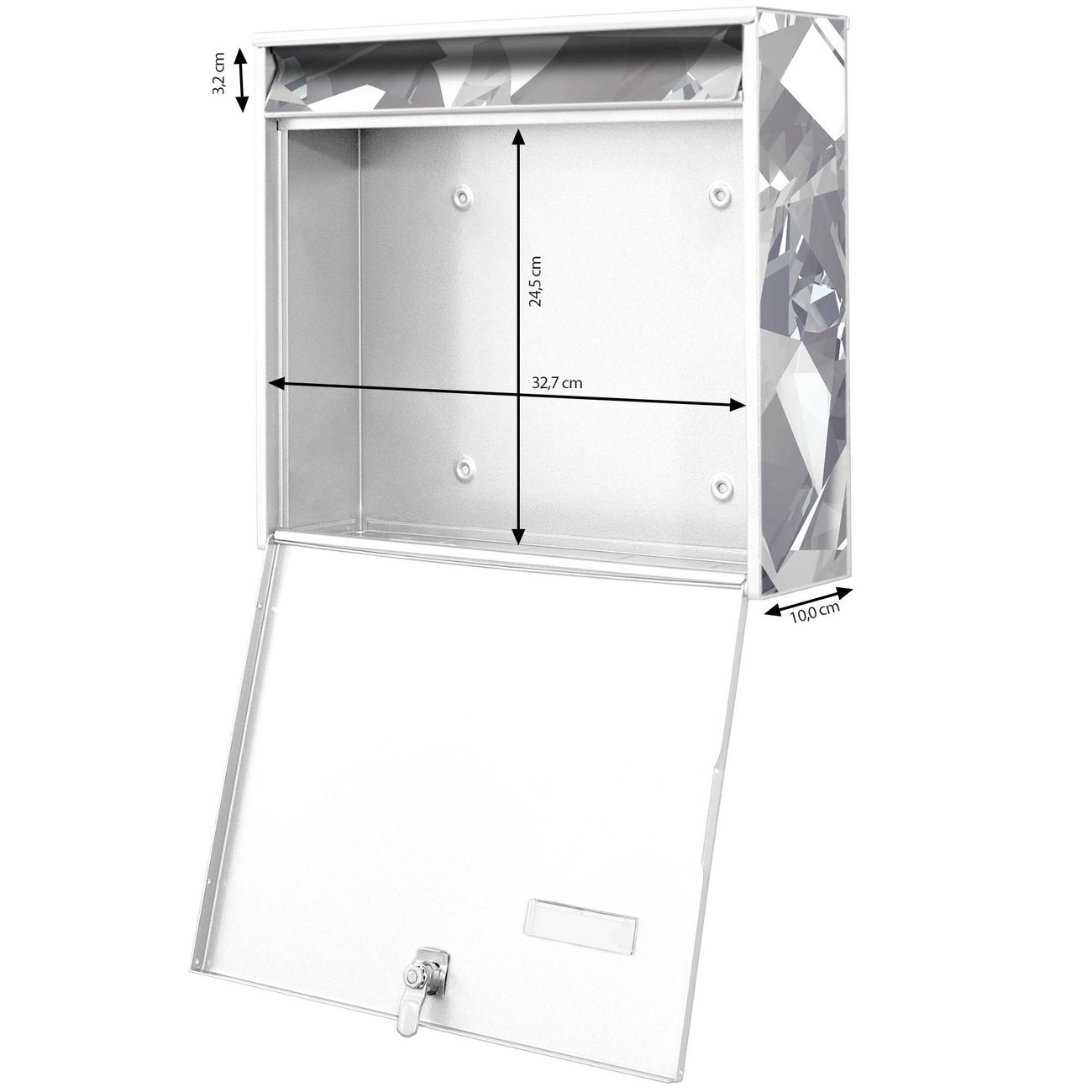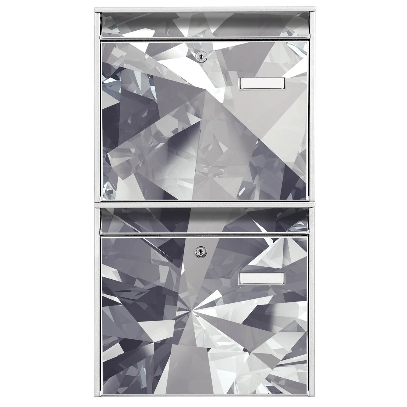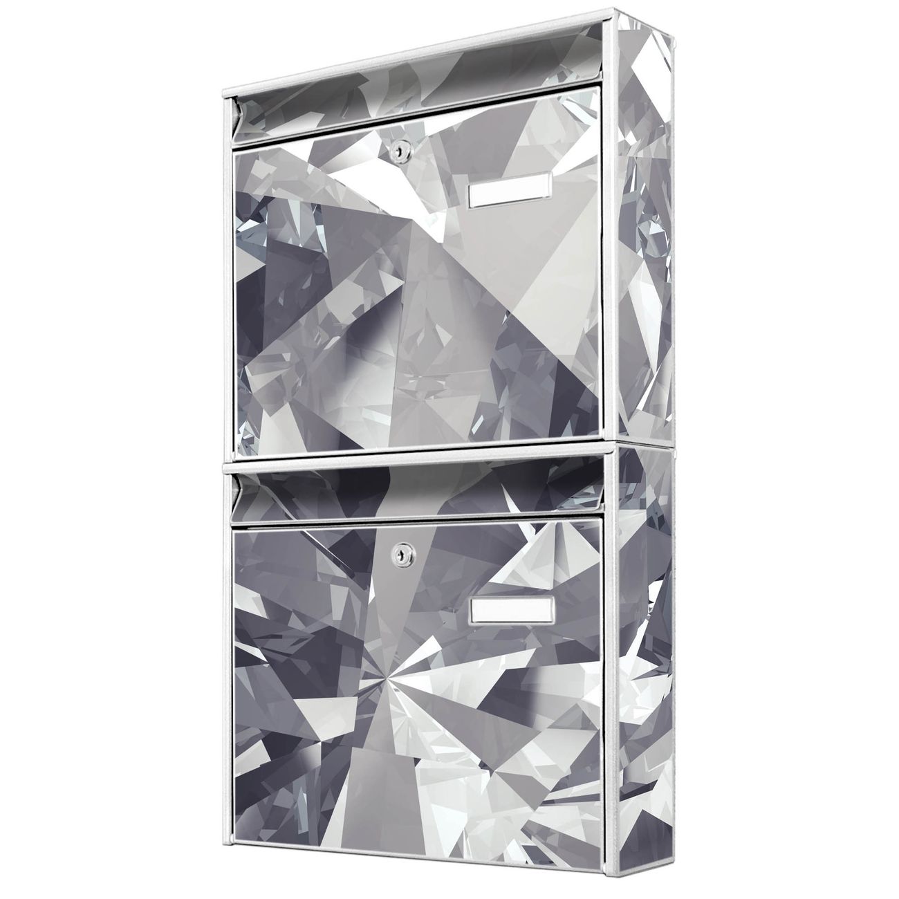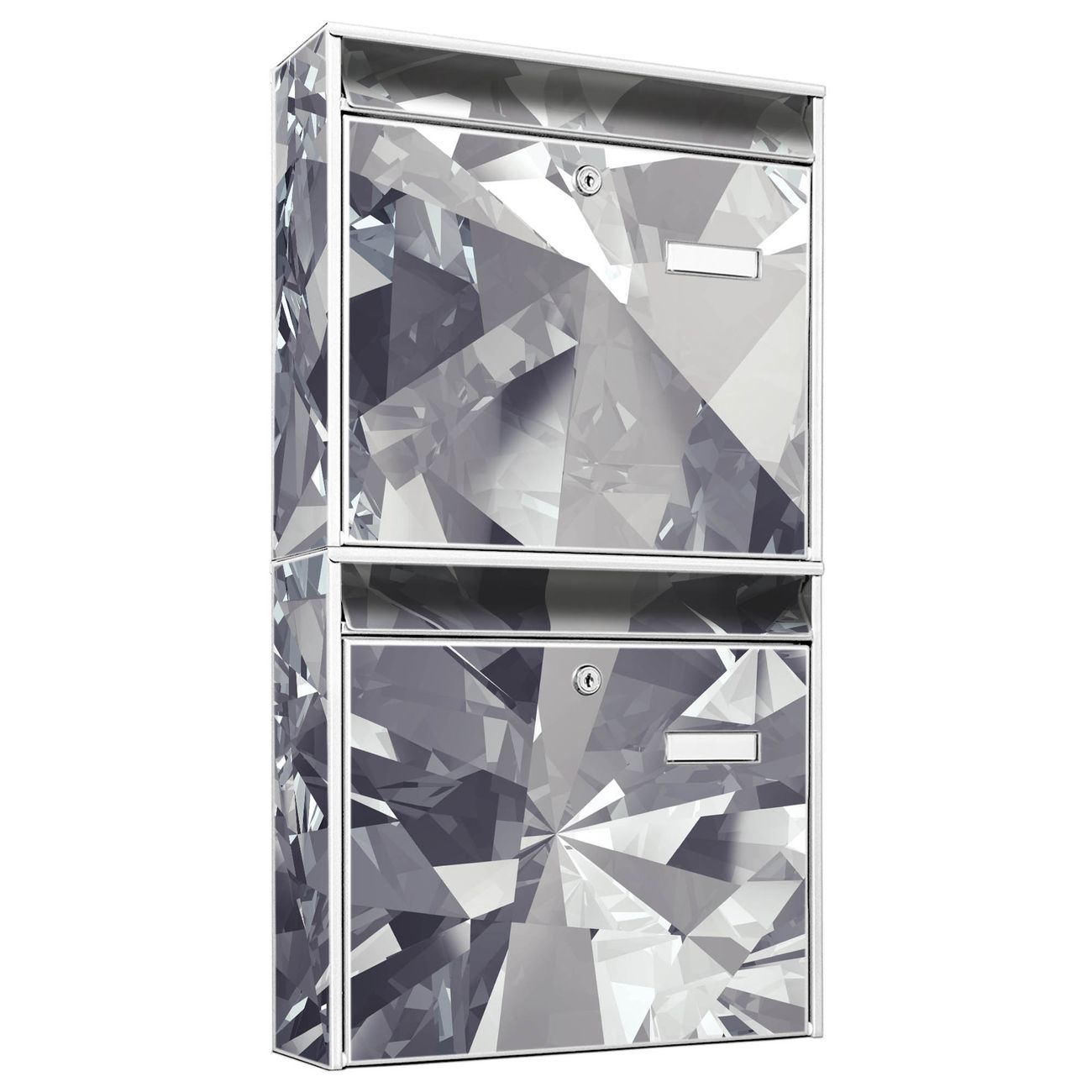 FUNKTION: Die Burg-Wächter Briefkastenanlage mit Motiv Facetten Monochrome bietet Ihnen ausreichend Fassungsvermögen um auch A4 und C4 Sendungen zu empfangen. Das integrierte Namensschild lässt sich individuell beschriften. Wählen Sie aus den Grundfarben weiß, silber und schwarz. DESIGN: Die 2 Briefkästen haben ein ansprechendes und zeitloses Design, ohne dabei auf Funktionalität zu verzichten. Das Material ist sehr stabil, wetterfest und rostfrei. Durch das Motiv Facetten Monochrome werden die Postkästen zu einem Blickfang. DETAILS: Die Postkästen bestehen aus verzinktem Stahl der zusätzlich mit Klarlack versiegelt wurde. Die Kästen sind gesamt 64,5cm hoch, 36,2cm breit und 10cm tief. Das Motiv besteht aus einer wetter- und UV-festen Folie, die Ihren Briefkasten zusätzlich vor Kratzern schützt. Die Postkästen werden mit Montagematerial, je einem Namensschild und je zwei Schlüsseln geliefert. NUTZEN: Das Briefkastenset eignet sich für die Wandmontage, die Größe bietet genügend Platz für Sendungen aller Art. Das zeitlose Design sowie die stabile Bauart bieten Ihnen einen treuen Begleiter für Ihre Post. BANJADO: