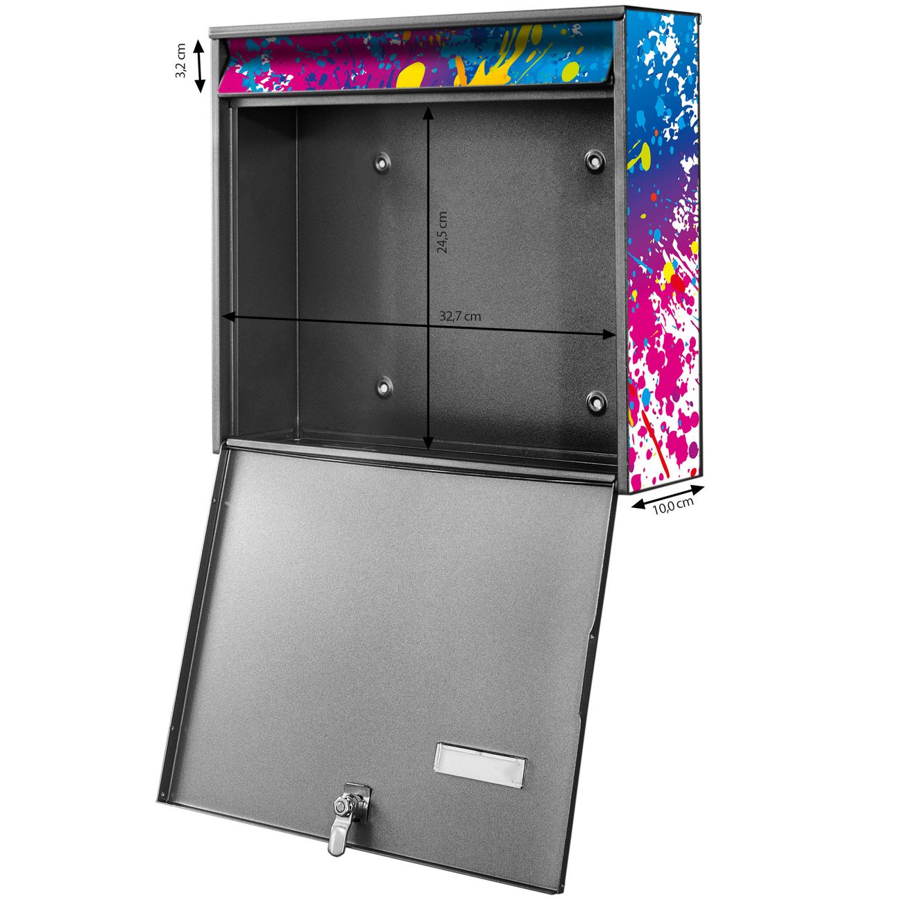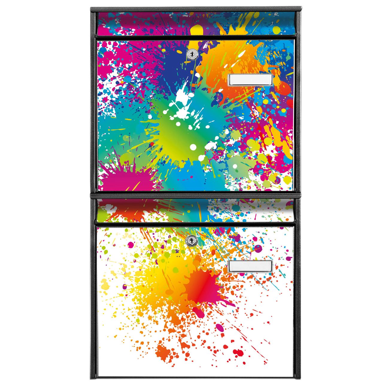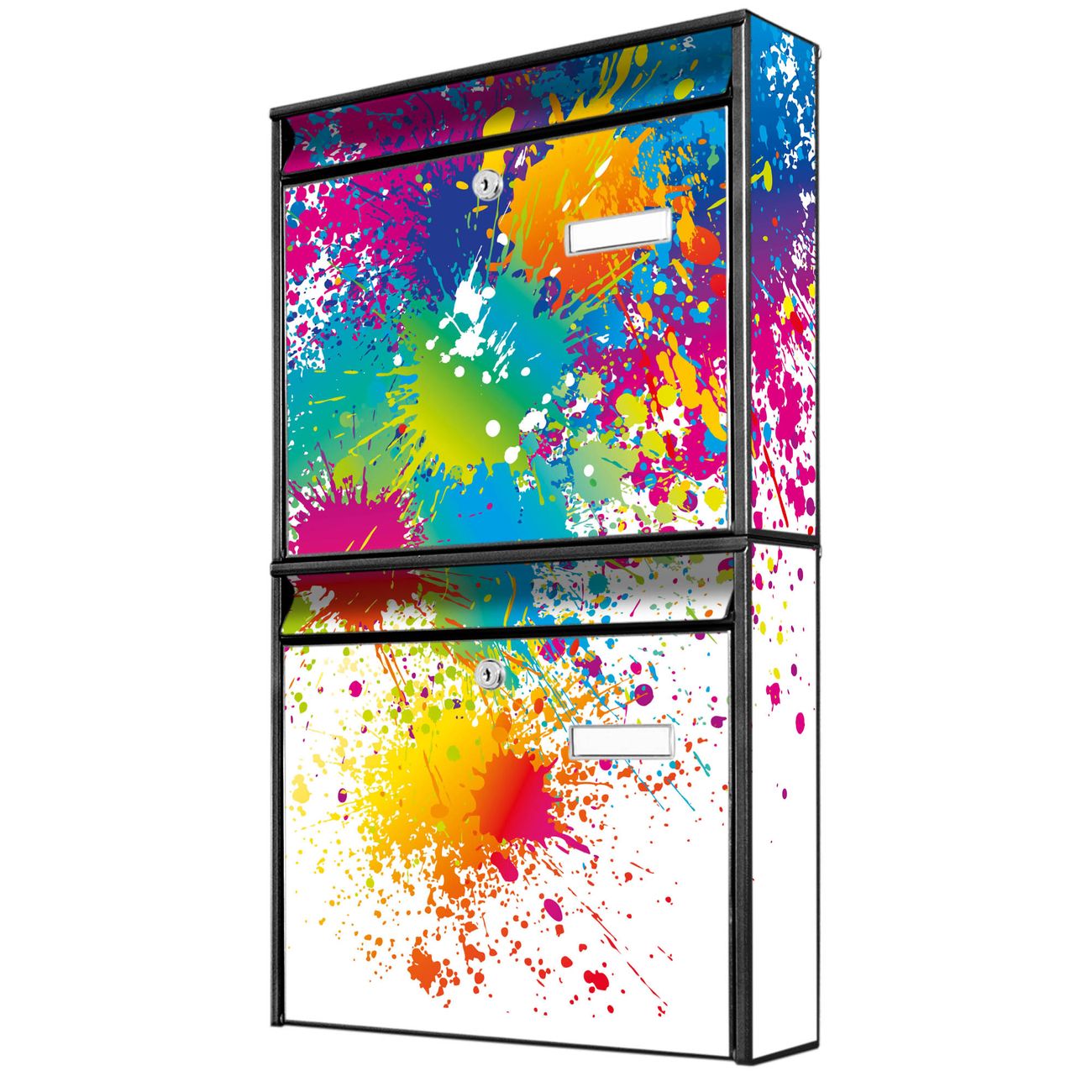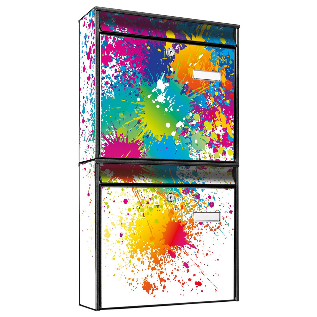 FUNKTION: Die Burg-Wächter Briefkastenanlage mit Motiv Farbspritzer bietet Ihnen ausreichend Fassungsvermögen um auch A4 und C4 Sendungen zu empfangen. Das integrierte Namensschild lässt sich individuell beschriften. Wählen Sie aus den Grundfarben weiß, silber und schwarz. DESIGN: Die 2 Briefkästen haben ein ansprechendes und zeitloses Design, ohne dabei auf Funktionalität zu verzichten. Das Material ist sehr stabil, wetterfest und rostfrei. Durch das Motiv Farbspritzer werden die Postkästen zu einem Blickfang. DETAILS: Die Postkästen bestehen aus verzinktem Stahl der zusätzlich mit Klarlack versiegelt wurde. Die Kästen sind gesamt 64,5cm hoch, 36,2cm breit und 10cm tief. Das Motiv besteht aus einer wetter- und UV-festen Folie, die Ihren Briefkasten zusätzlich vor Kratzern schützt. Die Postkästen werden mit Montagematerial, je einem Namensschild und je zwei Schlüsseln geliefert. NUTZEN: Das Briefkastenset eignet sich für die Wandmontage, die Größe bietet genügend Platz für Sendungen aller Art. Das zeitlose Design sowie die stabile Bauart bieten Ihnen einen treuen Begleiter für Ihre Post. BANJADO: