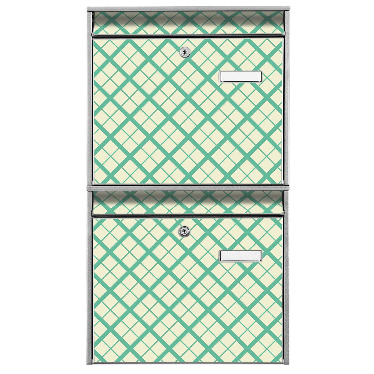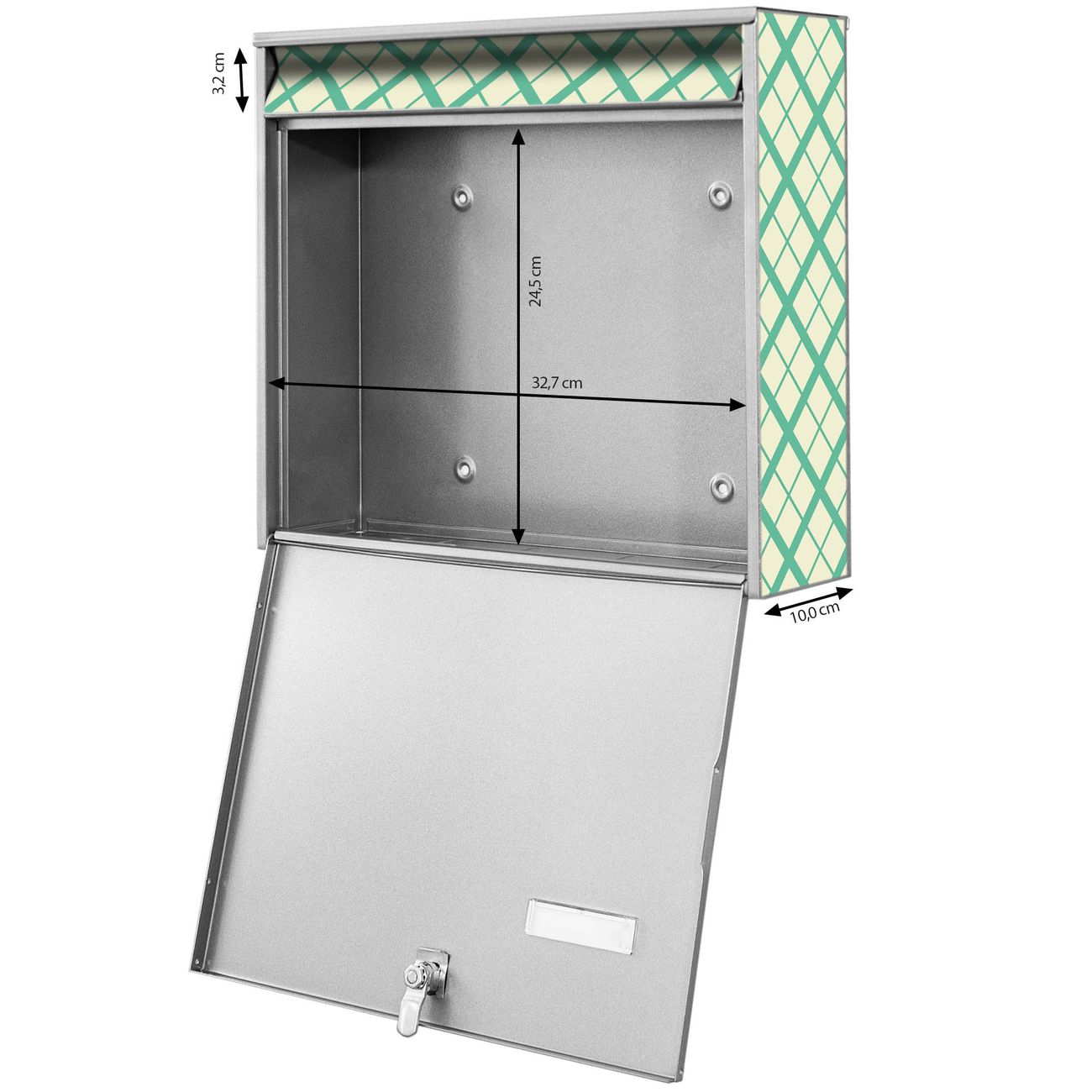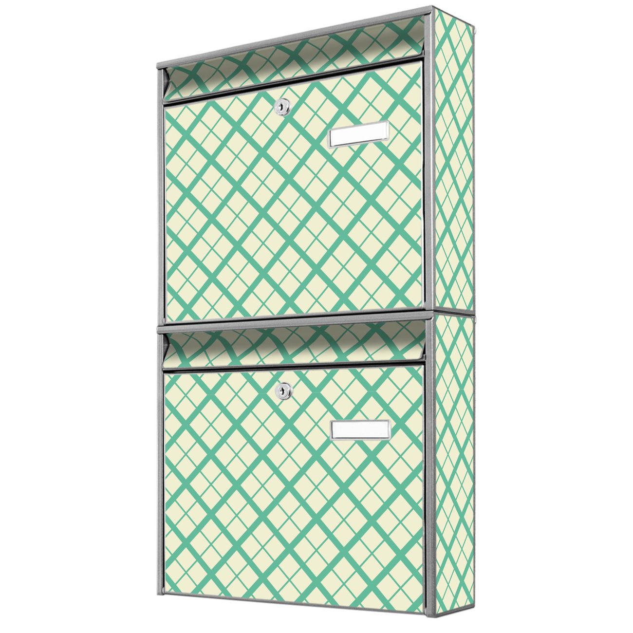 FUNKTION: Die Burg-Wächter Briefkastenanlage mit Motiv Feines Rautenmuster bietet Ihnen ausreichend Fassungsvermögen um auch A4 und C4 Sendungen zu empfangen. Das integrierte Namensschild lässt sich individuell beschriften. Wählen Sie aus den Grundfarben weiß, silber und schwarz. DESIGN: Die 2 Briefkästen haben ein ansprechendes und zeitloses Design, ohne dabei auf Funktionalität zu verzichten. Das Material ist sehr stabil, wetterfest und rostfrei. Durch das Motiv Feines Rautenmuster werden die Postkästen zu einem Blickfang. DETAILS: Die Postkästen bestehen aus verzinktem Stahl der zusätzlich mit Klarlack versiegelt wurde. Die Kästen sind gesamt 64,5cm hoch, 36,2cm breit und 10cm tief. Das Motiv besteht aus einer wetter- und UV-festen Folie, die Ihren Briefkasten zusätzlich vor Kratzern schützt. Die Postkästen werden mit Montagematerial, je einem Namensschild und je zwei Schlüsseln geliefert. NUTZEN: Das Briefkastenset eignet sich für die Wandmontage, die Größe bietet genügend Platz für Sendungen aller Art. Das zeitlose Design sowie die stabile Bauart bieten Ihnen einen treuen Begleiter für Ihre Post. BANJADO:
