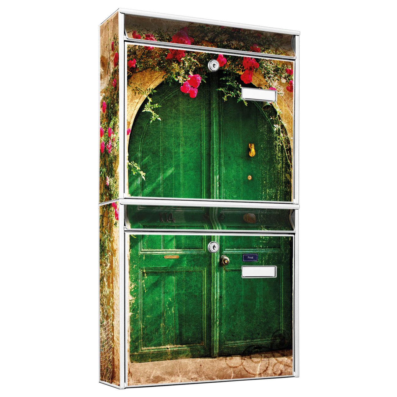 FUNKTION: Die Burg-Wächter Briefkastenanlage mit Motiv Ferienhaus bietet Ihnen ausreichend Fassungsvermögen um auch A4 und C4 Sendungen zu empfangen. Das integrierte Namensschild lässt sich individuell beschriften. Wählen Sie aus den Grundfarben weiß, silber und schwarz. DESIGN: Die 2 Briefkästen haben ein ansprechendes und zeitloses Design, ohne dabei auf Funktionalität zu verzichten. Das Material ist sehr stabil, wetterfest und rostfrei. Durch das Motiv Ferienhaus werden die Postkästen zu einem Blickfang. DETAILS: Die Postkästen bestehen aus verzinktem Stahl der zusätzlich mit Klarlack versiegelt wurde. Die Kästen sind gesamt 64,5cm hoch, 36,2cm breit und 10cm tief. Das Motiv besteht aus einer wetter- und UV-festen Folie, die Ihren Briefkasten zusätzlich vor Kratzern schützt. Die Postkästen werden mit Montagematerial, je einem Namensschild und je zwei Schlüsseln geliefert. NUTZEN: Das Briefkastenset eignet sich für die Wandmontage, die Größe bietet genügend Platz für Sendungen aller Art. Das zeitlose Design sowie die stabile Bauart bieten Ihnen einen treuen Begleiter für Ihre Post. BANJADO: