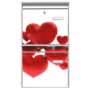 FUNKTION: Die Burg-Wächter Briefkastenanlage mit Motiv Fliegende Herzen bietet Ihnen ausreichend Fassungsvermögen um auch A4 und C4 Sendungen zu empfangen. Das integrierte Namensschild lässt sich individuell beschriften. Wählen Sie aus den Grundfarben weiß, silber und schwarz. DESIGN: Die 2 Briefkästen haben ein ansprechendes und zeitloses Design, ohne dabei auf Funktionalität zu verzichten. Das Material ist sehr stabil, wetterfest und rostfrei. Durch das Motiv Fliegende Herzen werden die Postkästen zu einem Blickfang. DETAILS: Die Postkästen bestehen aus verzinktem Stahl der zusätzlich mit Klarlack versiegelt wurde. Die Kästen sind gesamt 64,5cm hoch, 36,2cm breit und 10cm tief. Das Motiv besteht aus einer wetter- und UV-festen Folie, die Ihren Briefkasten zusätzlich vor Kratzern schützt. Die Postkästen werden mit Montagematerial, je einem Namensschild und je zwei Schlüsseln geliefert. NUTZEN: Das Briefkastenset eignet sich für die Wandmontage, die Größe bietet genügend Platz für Sendungen aller Art. Das zeitlose Design sowie die stabile Bauart bieten Ihnen einen treuen Begleiter für Ihre Post. BANJADO: