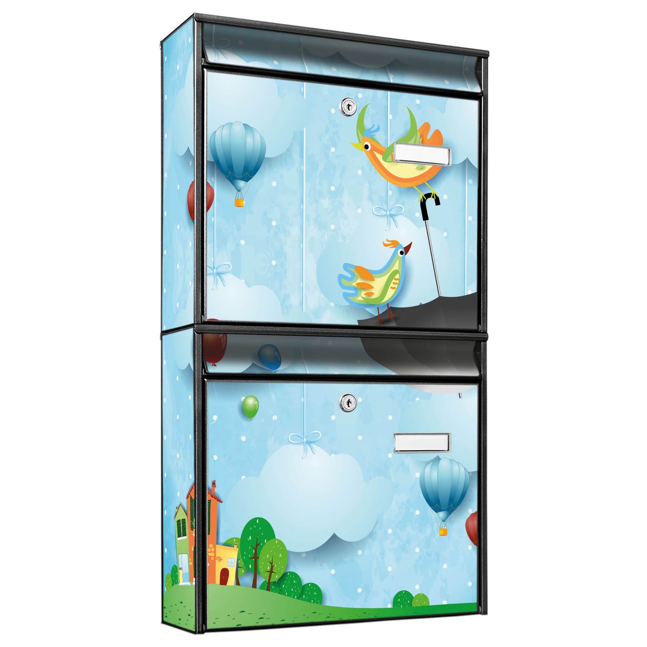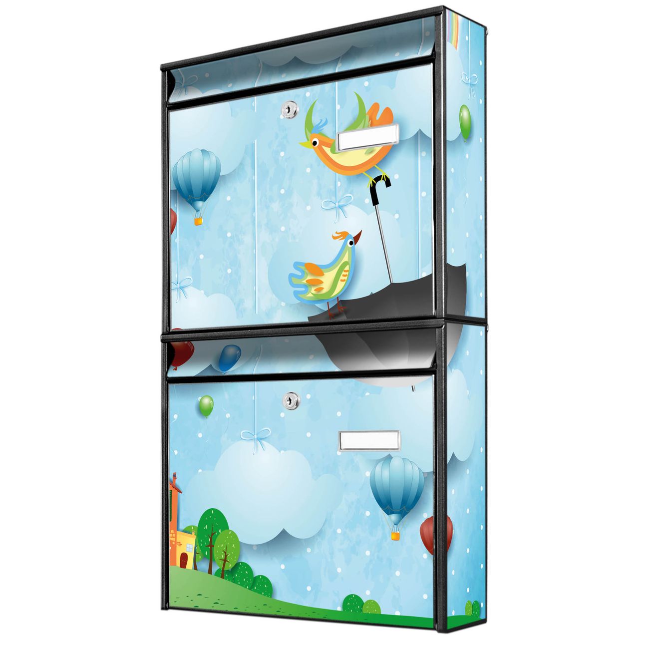 FUNKTION: Die Burg-Wächter Briefkastenanlage mit Motiv fliegender Regenschirm bietet Ihnen ausreichend Fassungsvermögen um auch A4 und C4 Sendungen zu empfangen. Das integrierte Namensschild lässt sich individuell beschriften. Wählen Sie aus den Grundfarben weiß, silber und schwarz. DESIGN: Die 2 Briefkästen haben ein ansprechendes und zeitloses Design, ohne dabei auf Funktionalität zu verzichten. Das Material ist sehr stabil, wetterfest und rostfrei. Durch das Motiv fliegender Regenschirm werden die Postkästen zu einem Blickfang. DETAILS: Die Postkästen bestehen aus verzinktem Stahl der zusätzlich mit Klarlack versiegelt wurde. Die Kästen sind gesamt 64,5cm hoch, 36,2cm breit und 10cm tief. Das Motiv besteht aus einer wetter- und UV-festen Folie, die Ihren Briefkasten zusätzlich vor Kratzern schützt. Die Postkästen werden mit Montagematerial, je einem Namensschild und je zwei Schlüsseln geliefert. NUTZEN: Das Briefkastenset eignet sich für die Wandmontage, die Größe bietet genügend Platz für Sendungen aller Art. Das zeitlose Design sowie die stabile Bauart bieten Ihnen einen treuen Begleiter für Ihre Post. BANJADO: